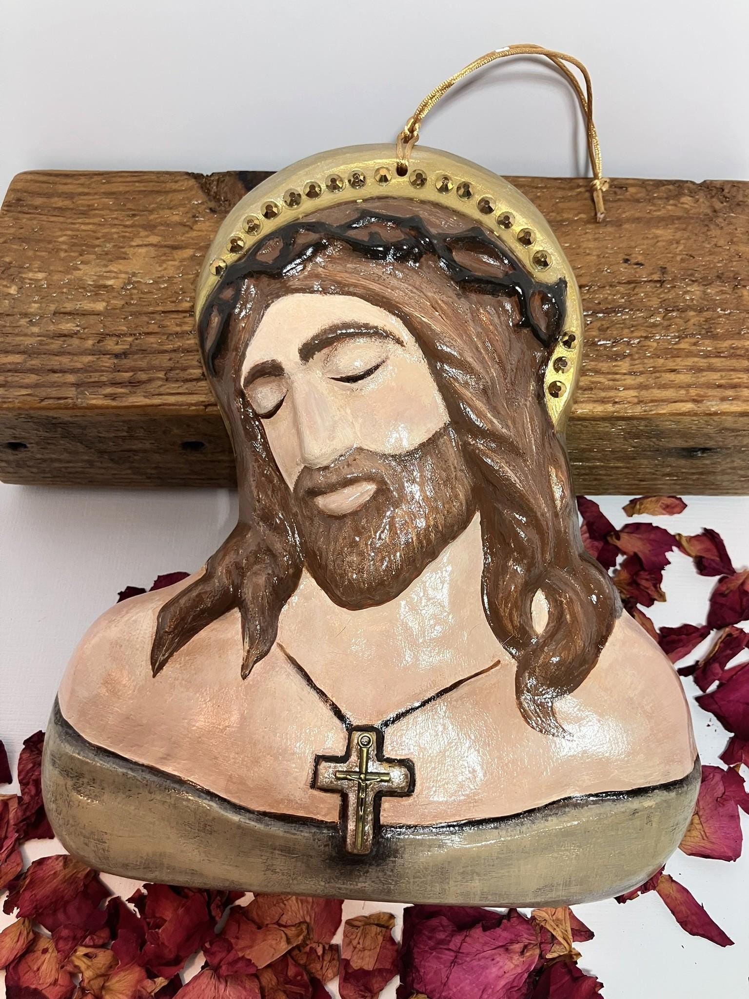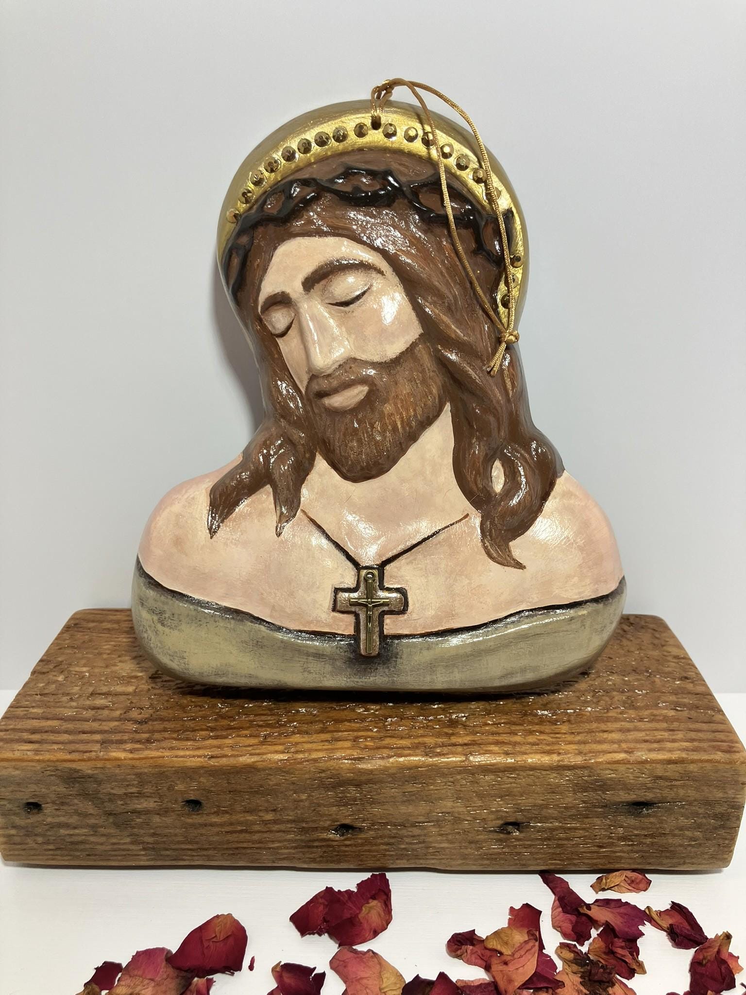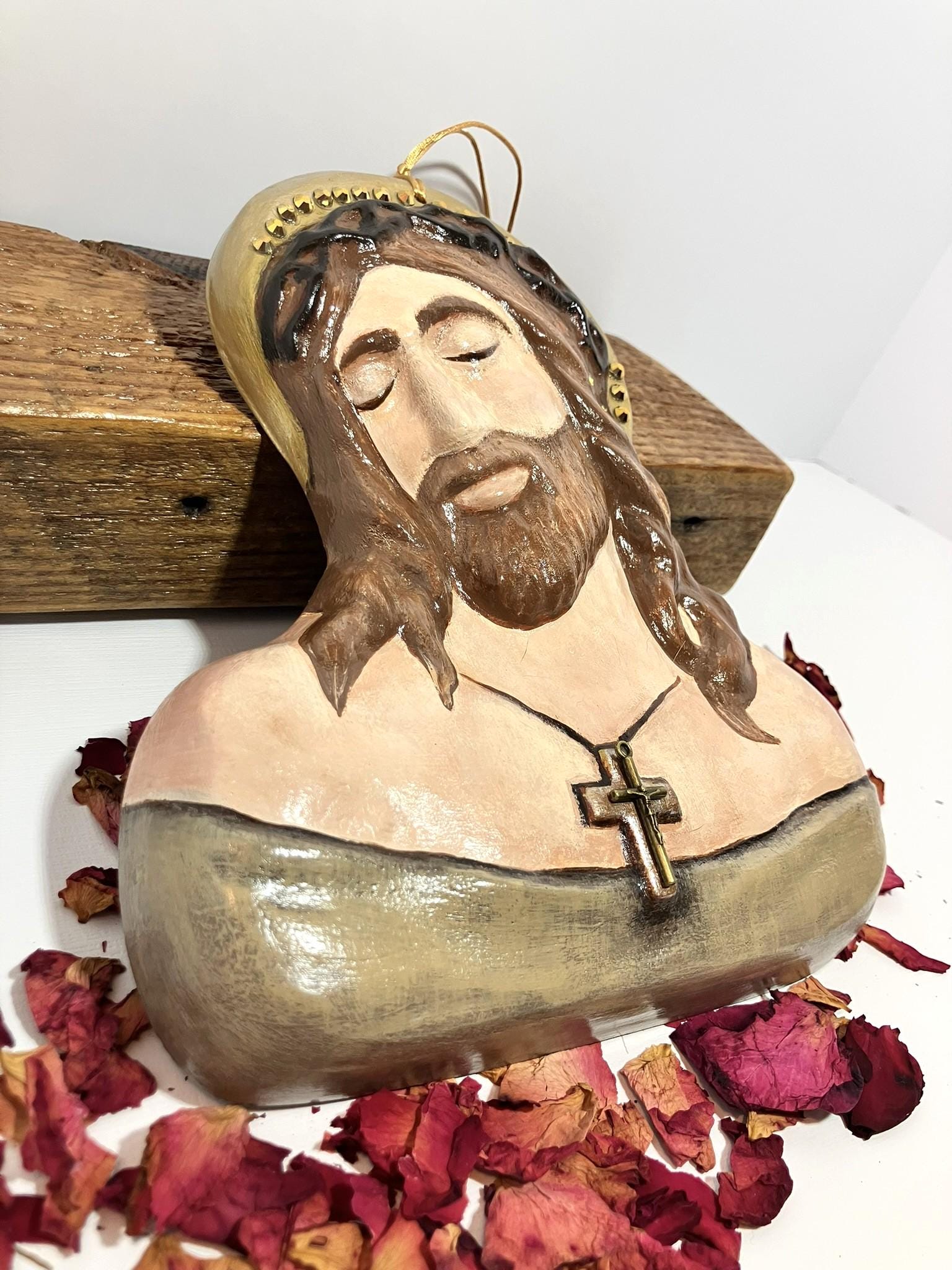 Handmade Jesus bust made from plaster of paris, painted, sealed, and adorned with amber glass rhinestones. A metal cross has also been applied. Total dimensions: 7" wide x 8" tall x 1" deep.