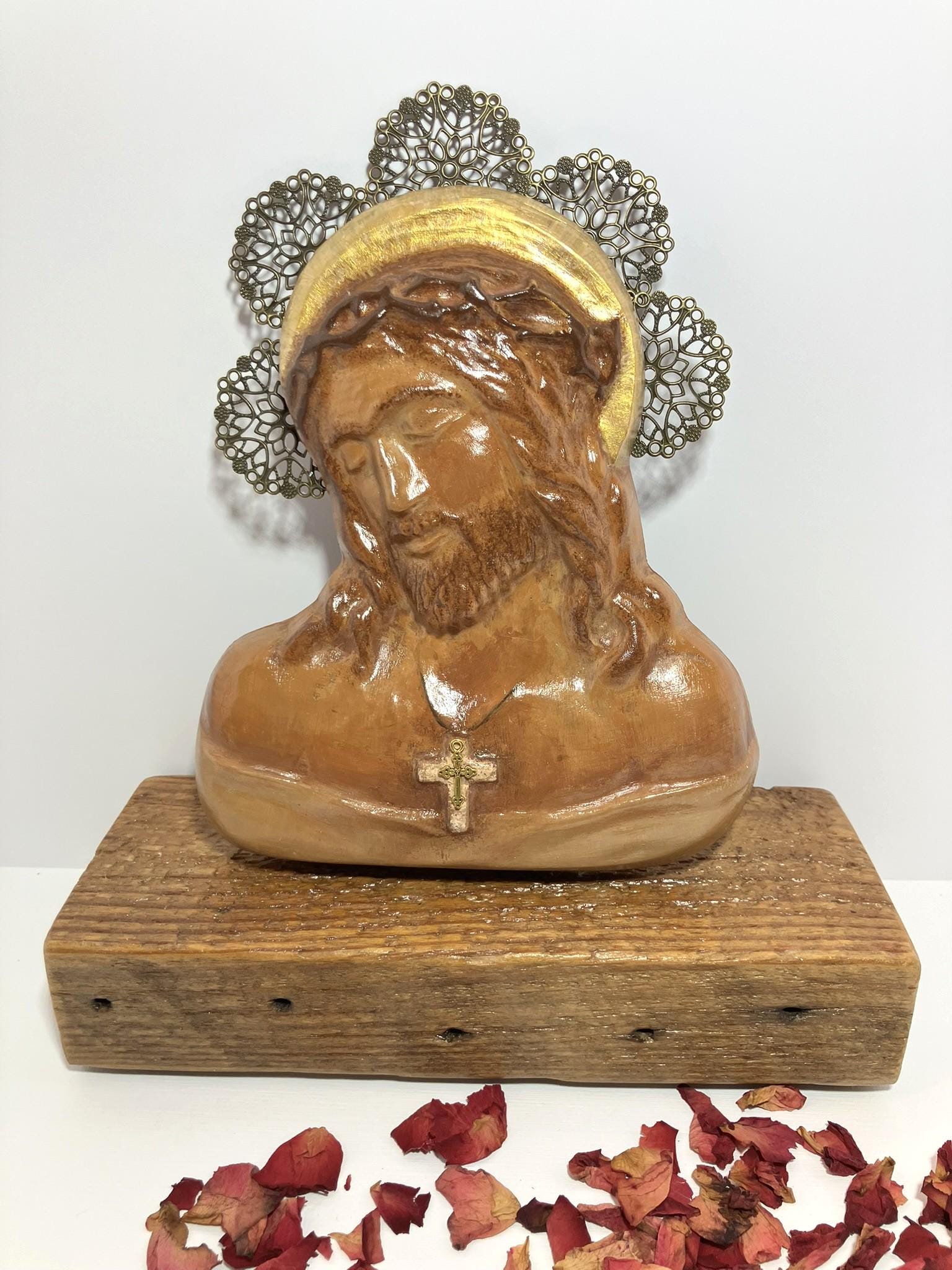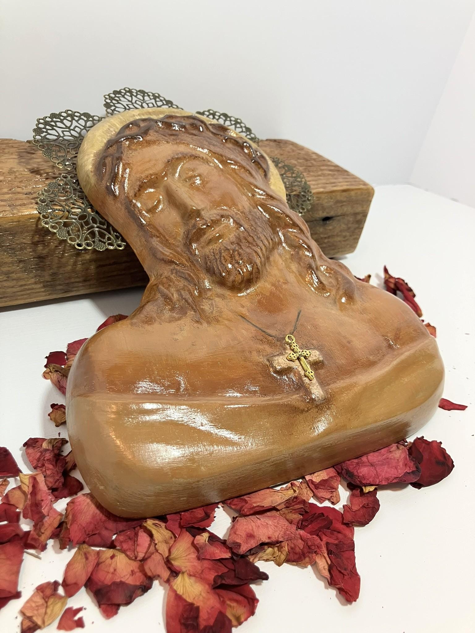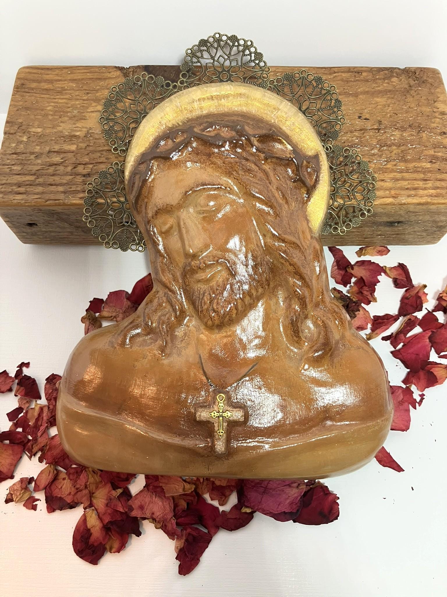 Handmade Jesus bust made from plaster of paris. Hand painted, sealed, and adorned with filigree metal discs, and a metal cross. Total dimensions: 7" wide x 9" tall x 1" deep. I love him.
