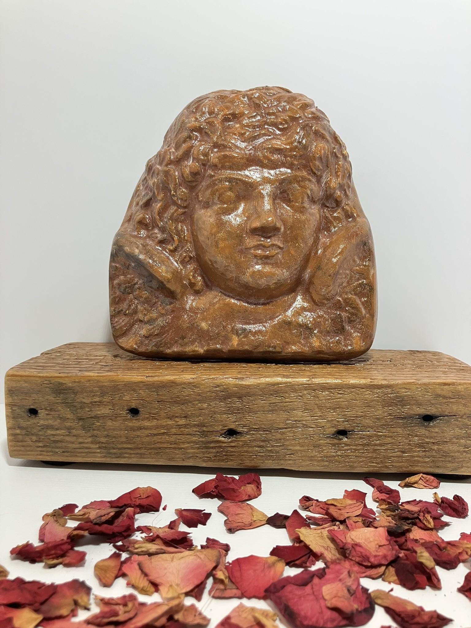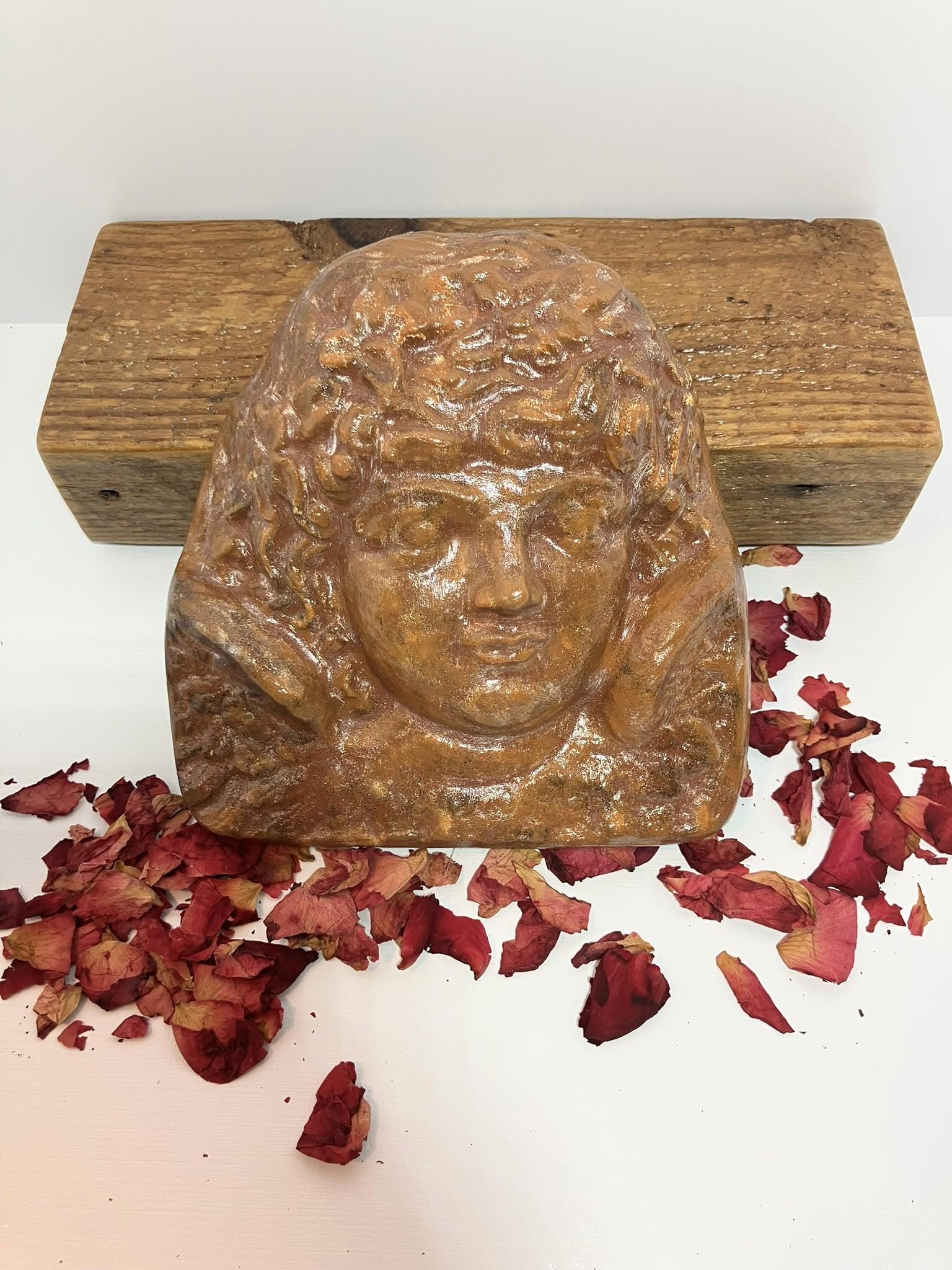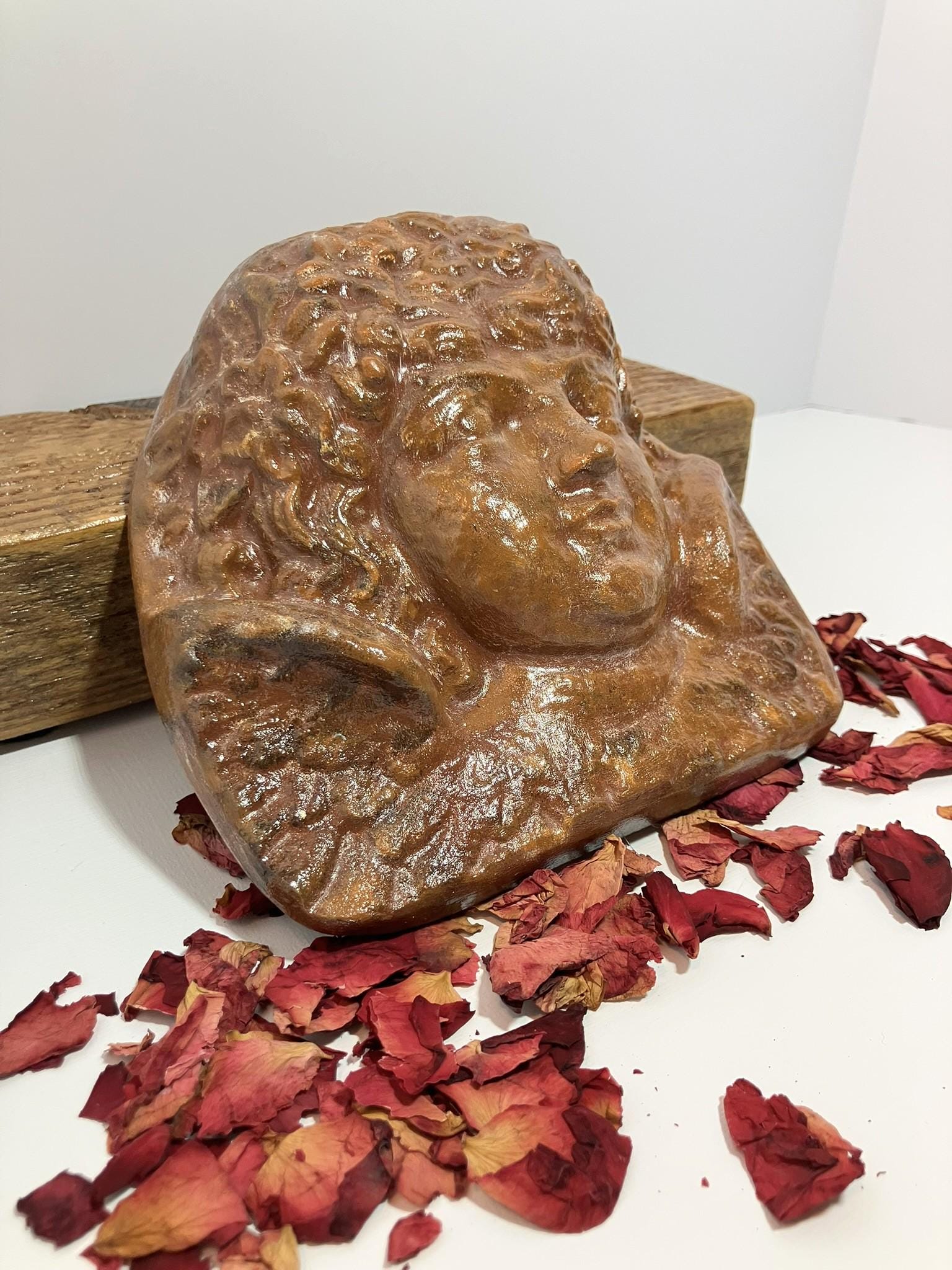 Angel bust made from plaster of paris, painted, and sealed. She is quite a hefty one! She is a dark terra cotta color, mottled. Total dimensions: 6" wide x 6" tall x 2" deep.