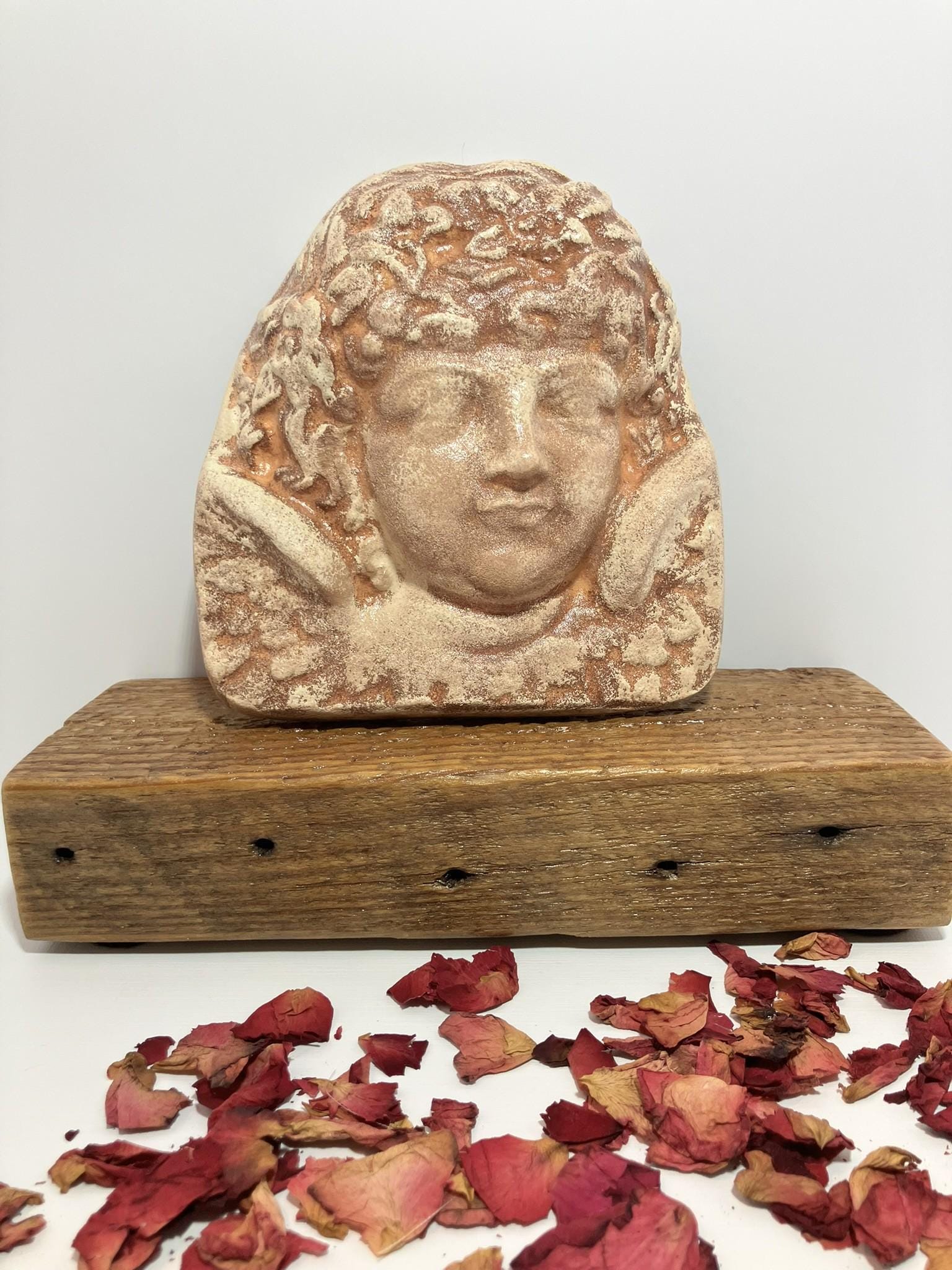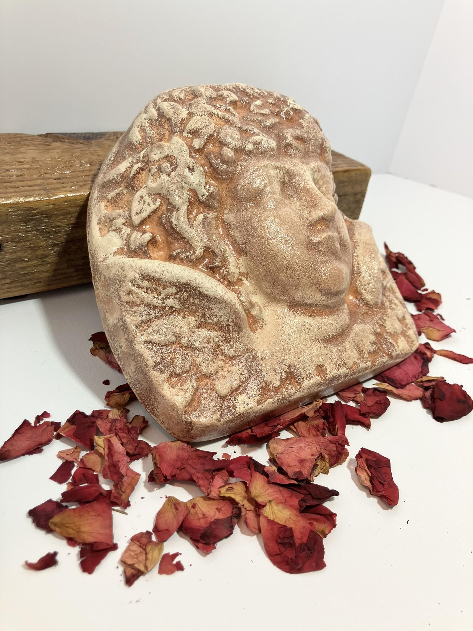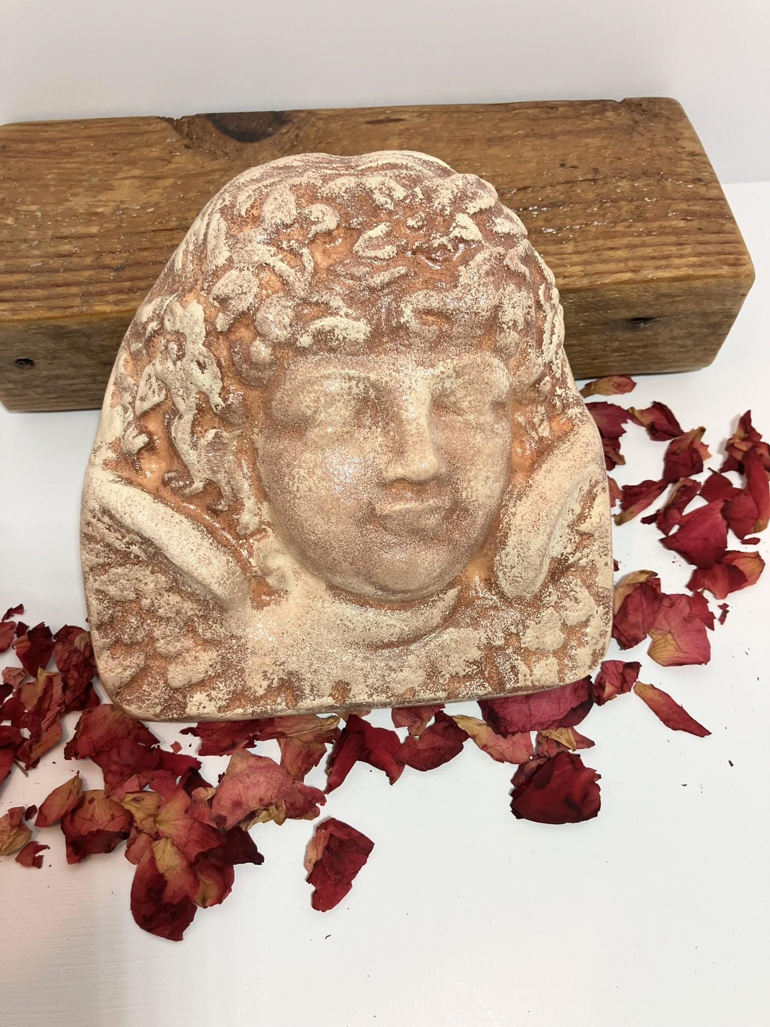Angel bust made from plaster of paris poured, painted, and sealed. She is a hefty one! She is painted in a light terra cotta color, mottled. Total dimensions: 6" wide x 6" tall x 2" thick.