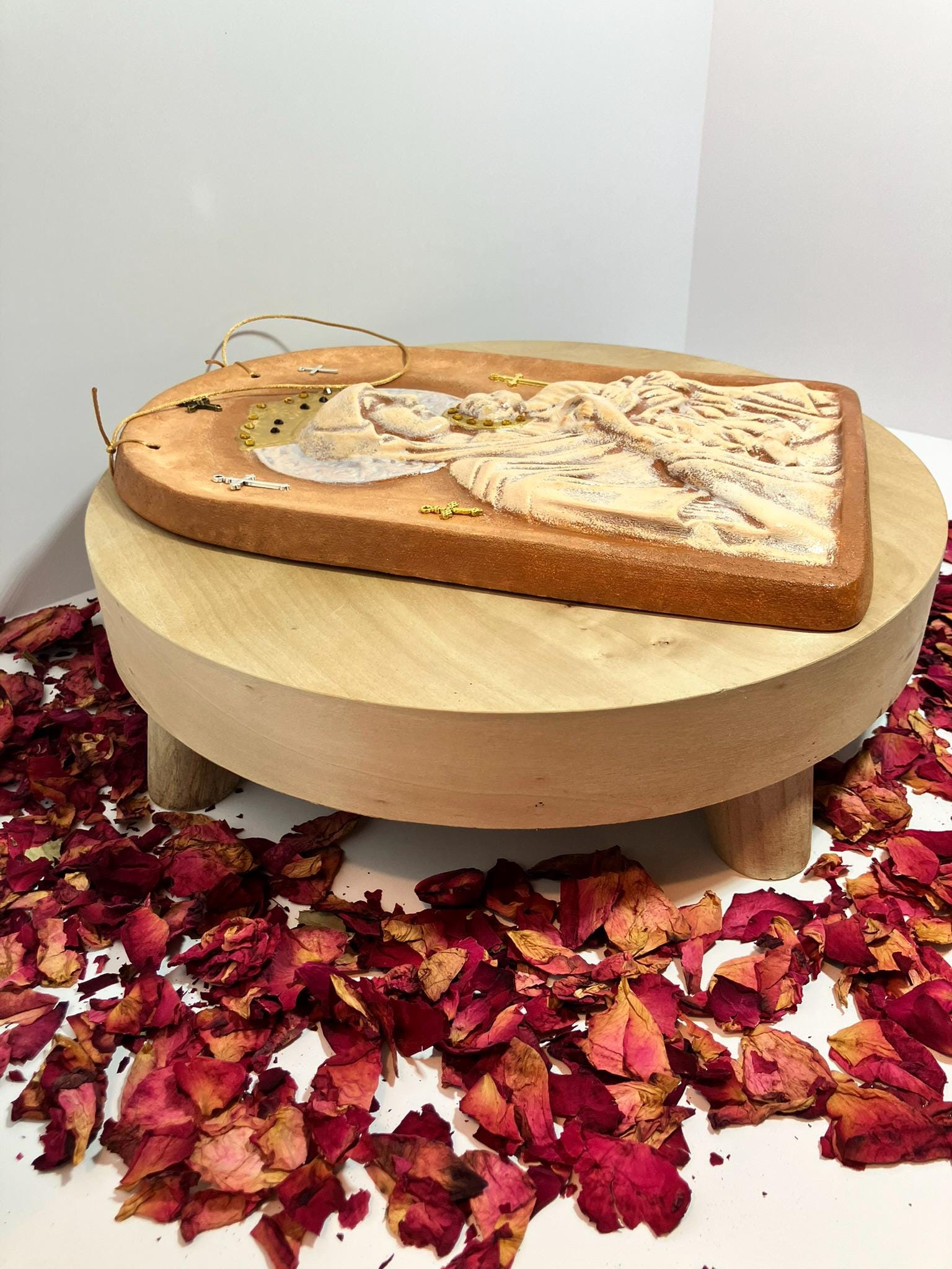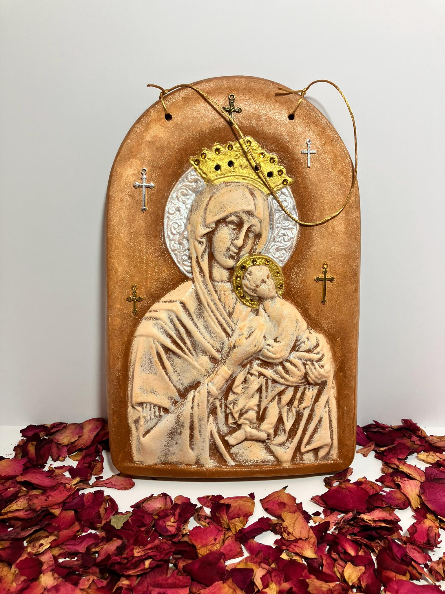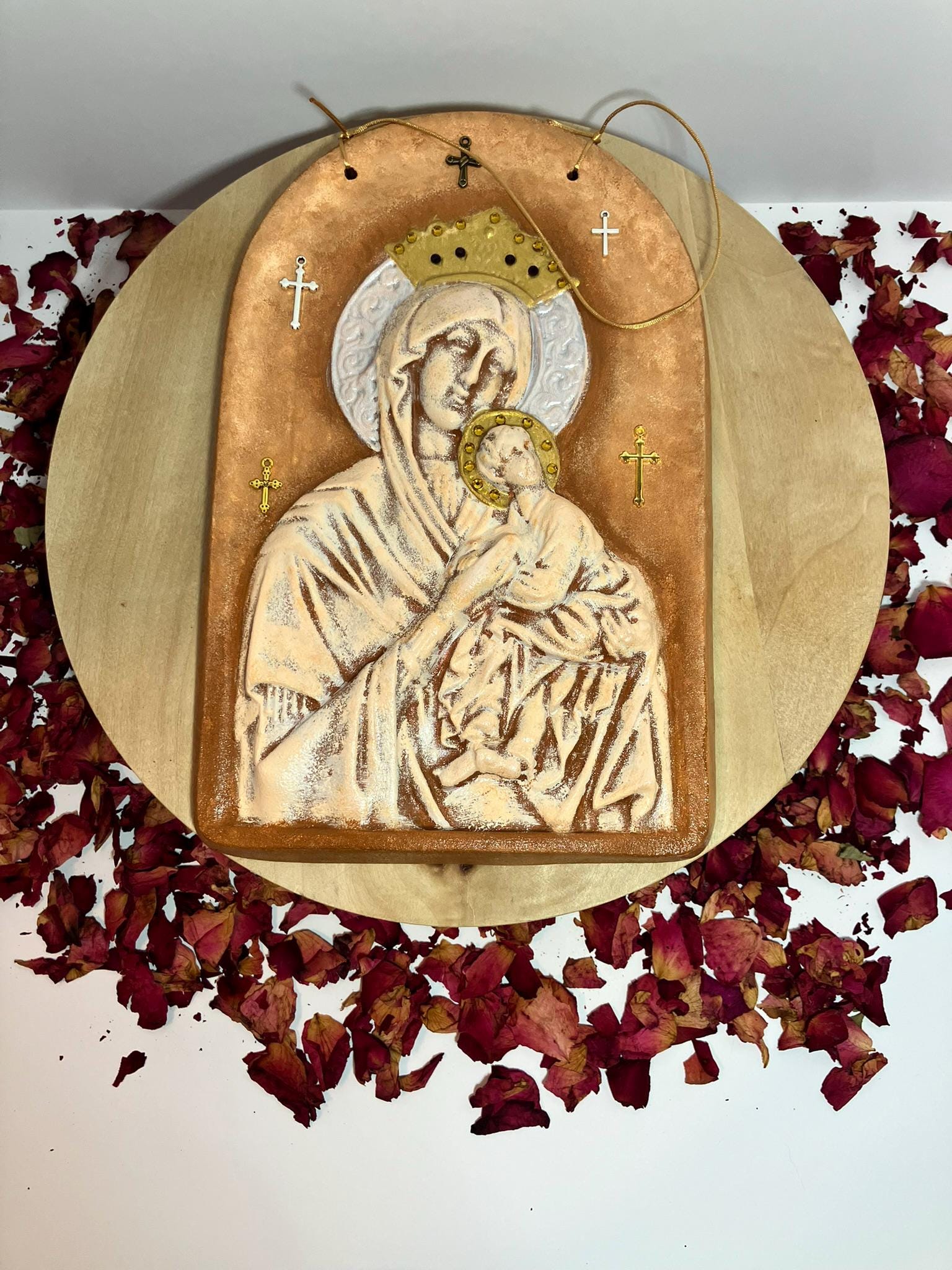 Large plaque of Virgin Mary & baby Jesus made from plaster of paris. Hand painted & sealed. Color is cream & terra cotta, with trims in silver & gold. 7" w x 11" t x 3/4" dp. Adorned w/ rhinestones in amethyst & amber, & several metal crosses. So very pretty.