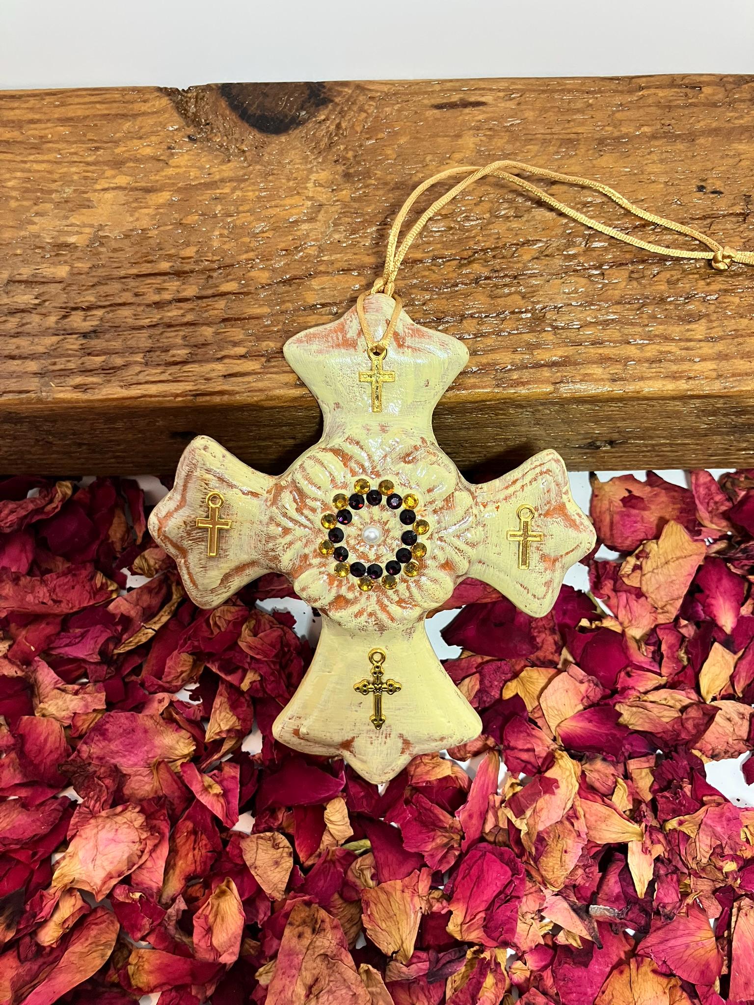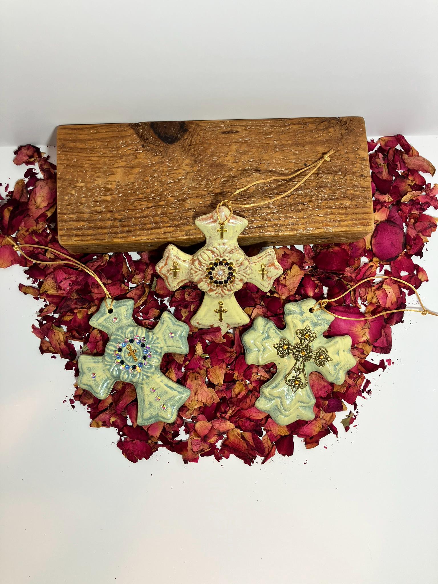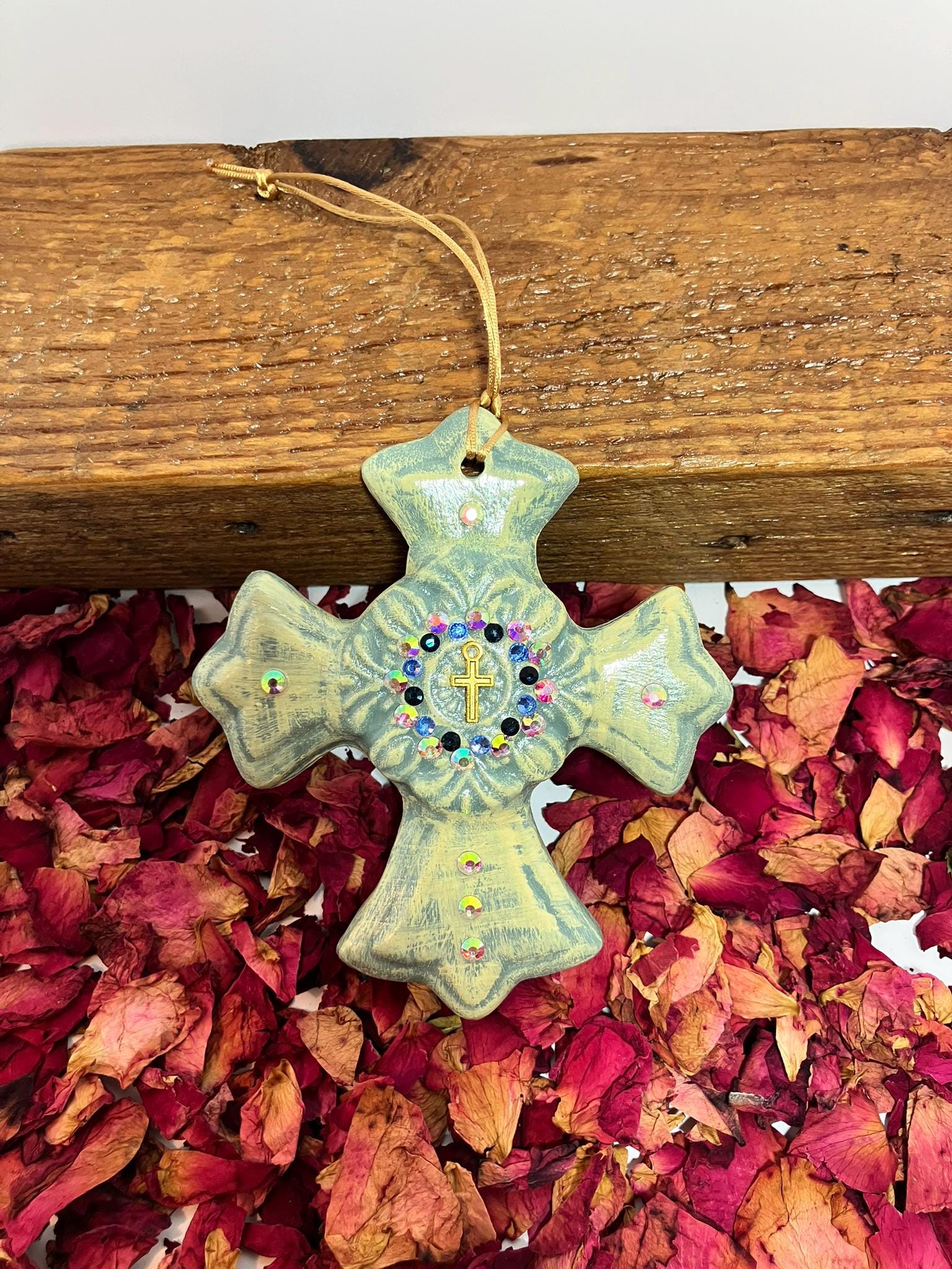 Small hanging cross that could be hung anywhere. Made from plaster of paris, hand painted, & sealed. Dimensions: 4-1/2" w x 5" t x 1/2" dp. These are adorned with glass rhinestones and metal crosses. Please choose the one that you desire.