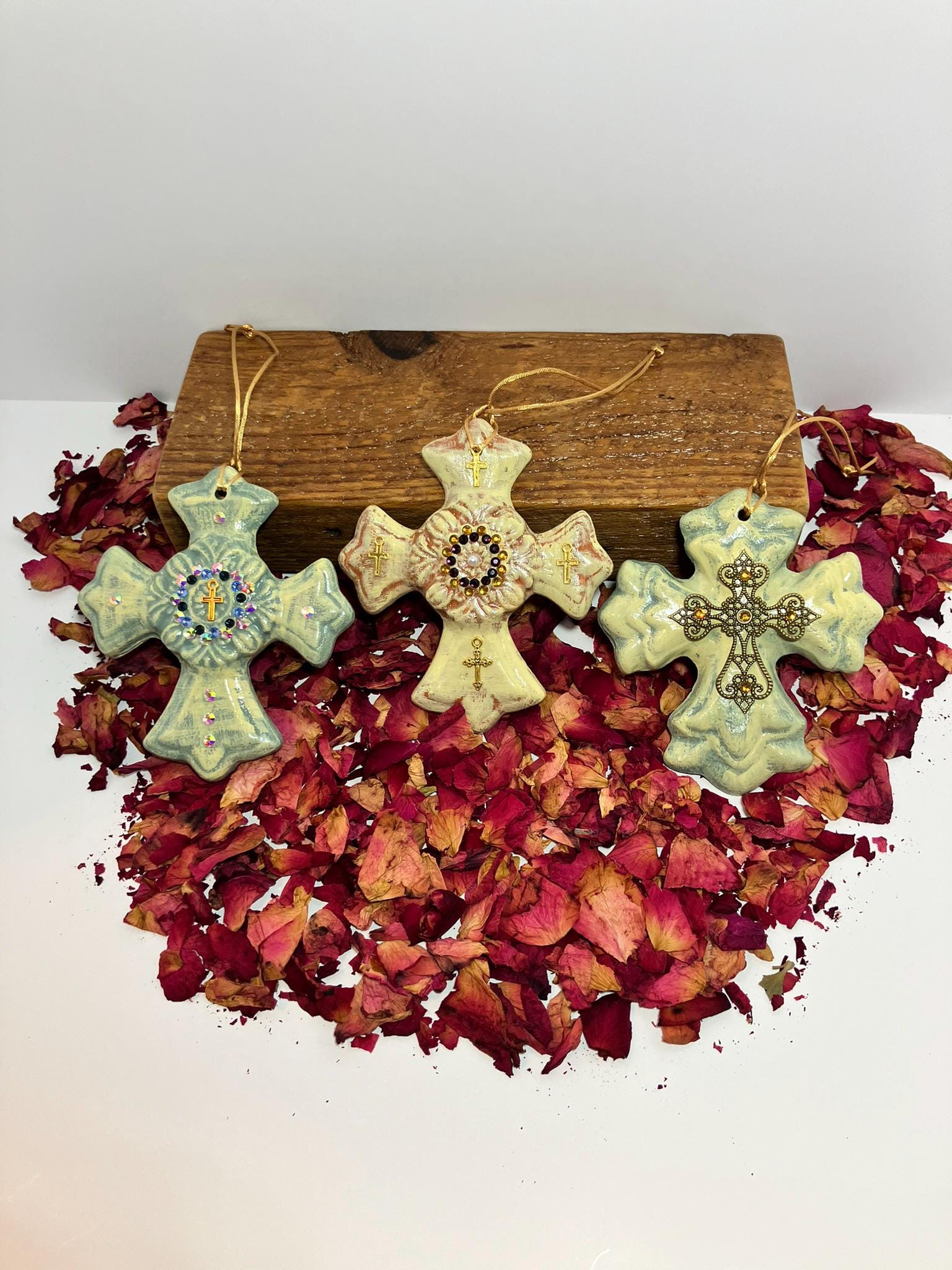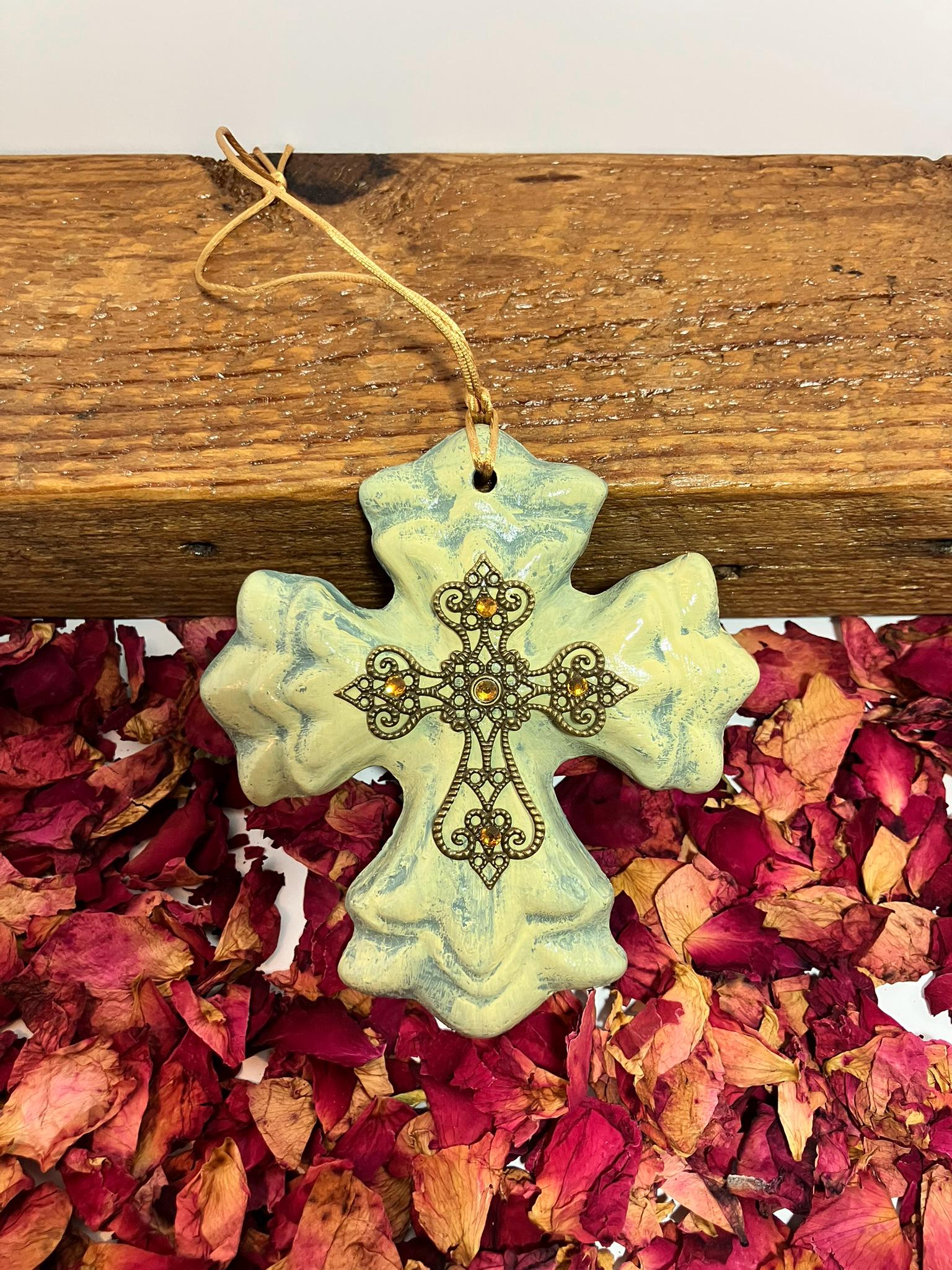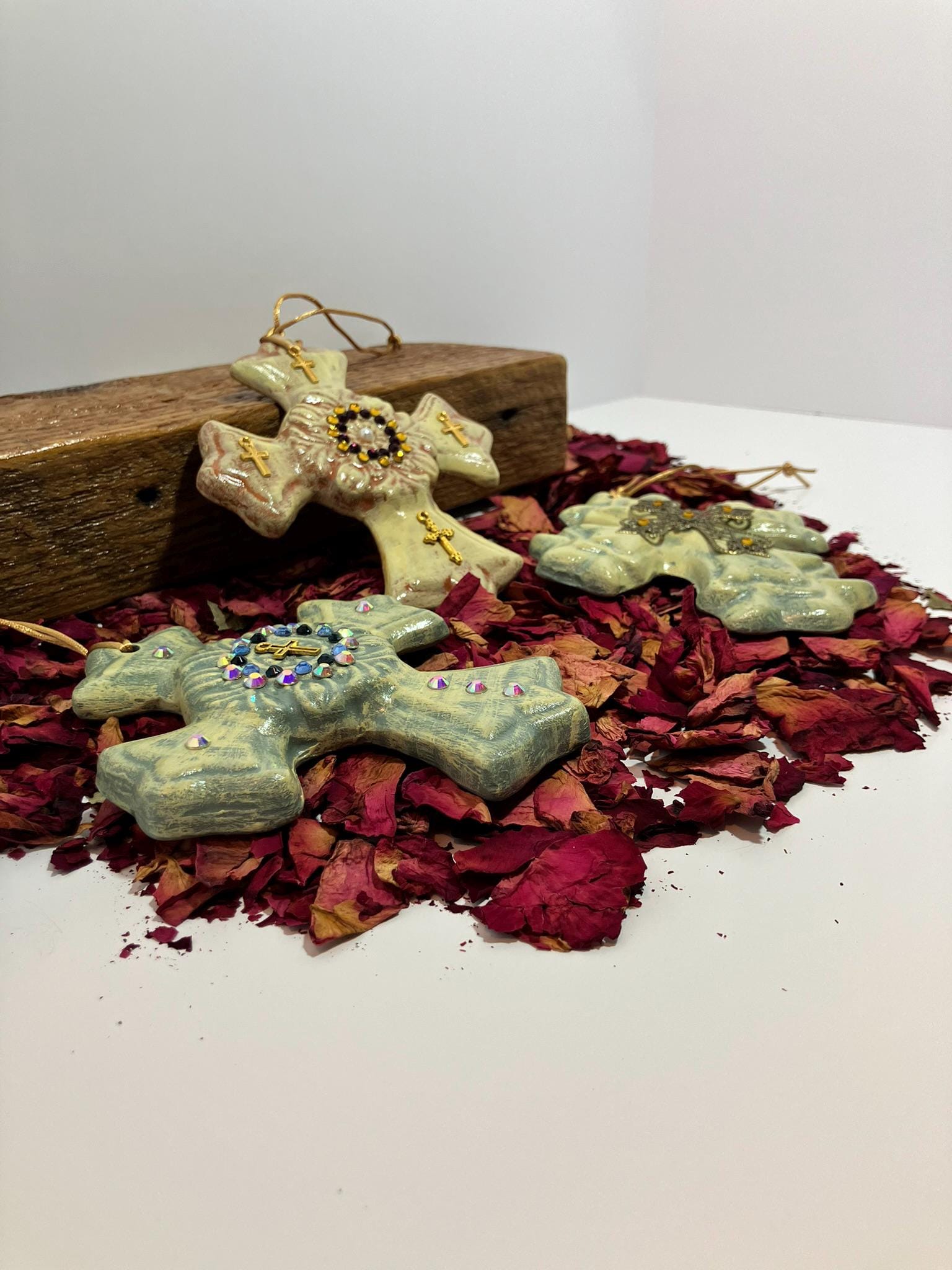 Small hanging cross that could be hung anywhere. Made from plaster of paris, hand painted, & sealed. Dimensions: 4-1/2" w x 5" t x 1/2" dp. These are adorned with glass rhinestones and metal crosses. Please choose the one that you desire.