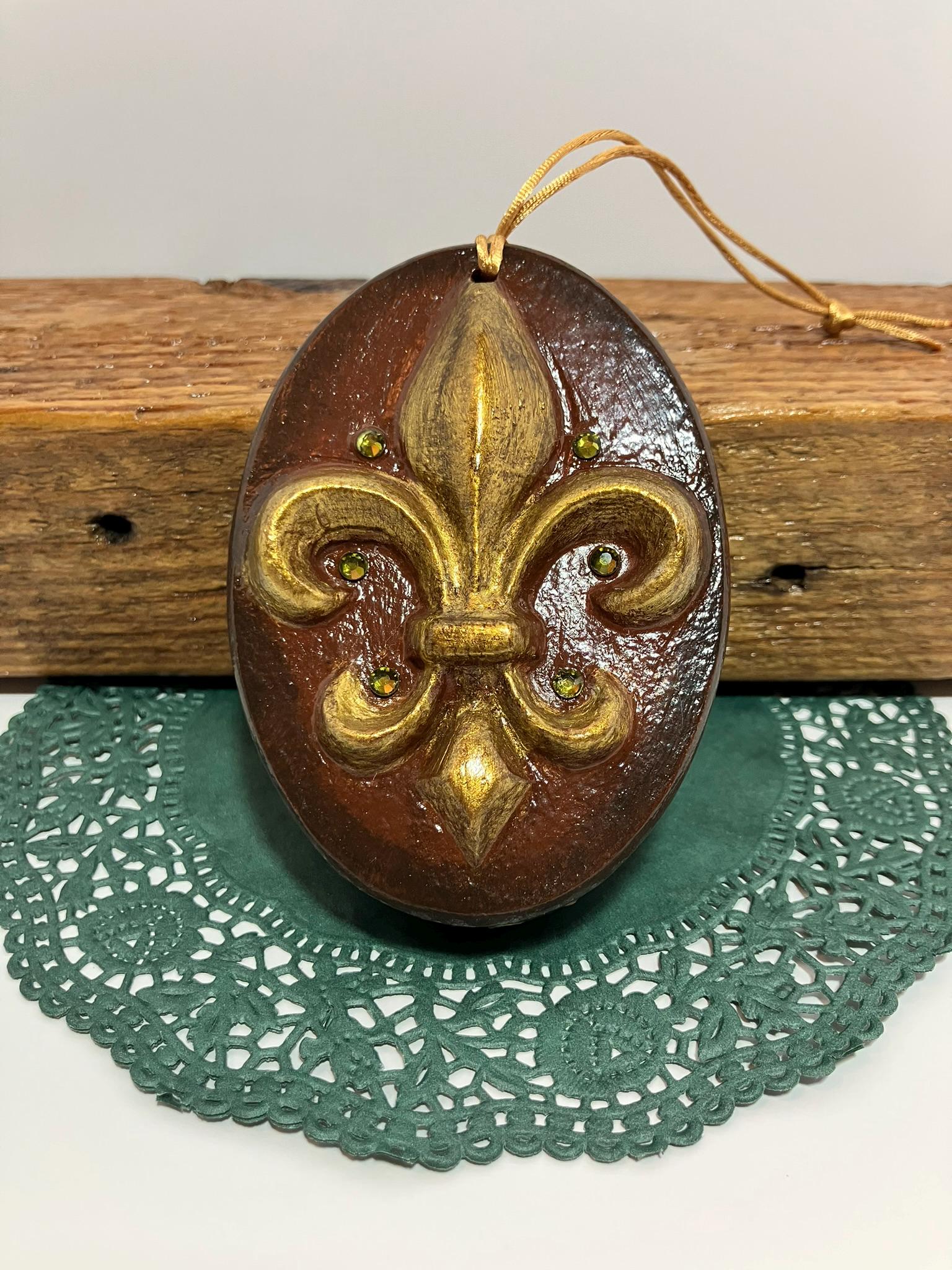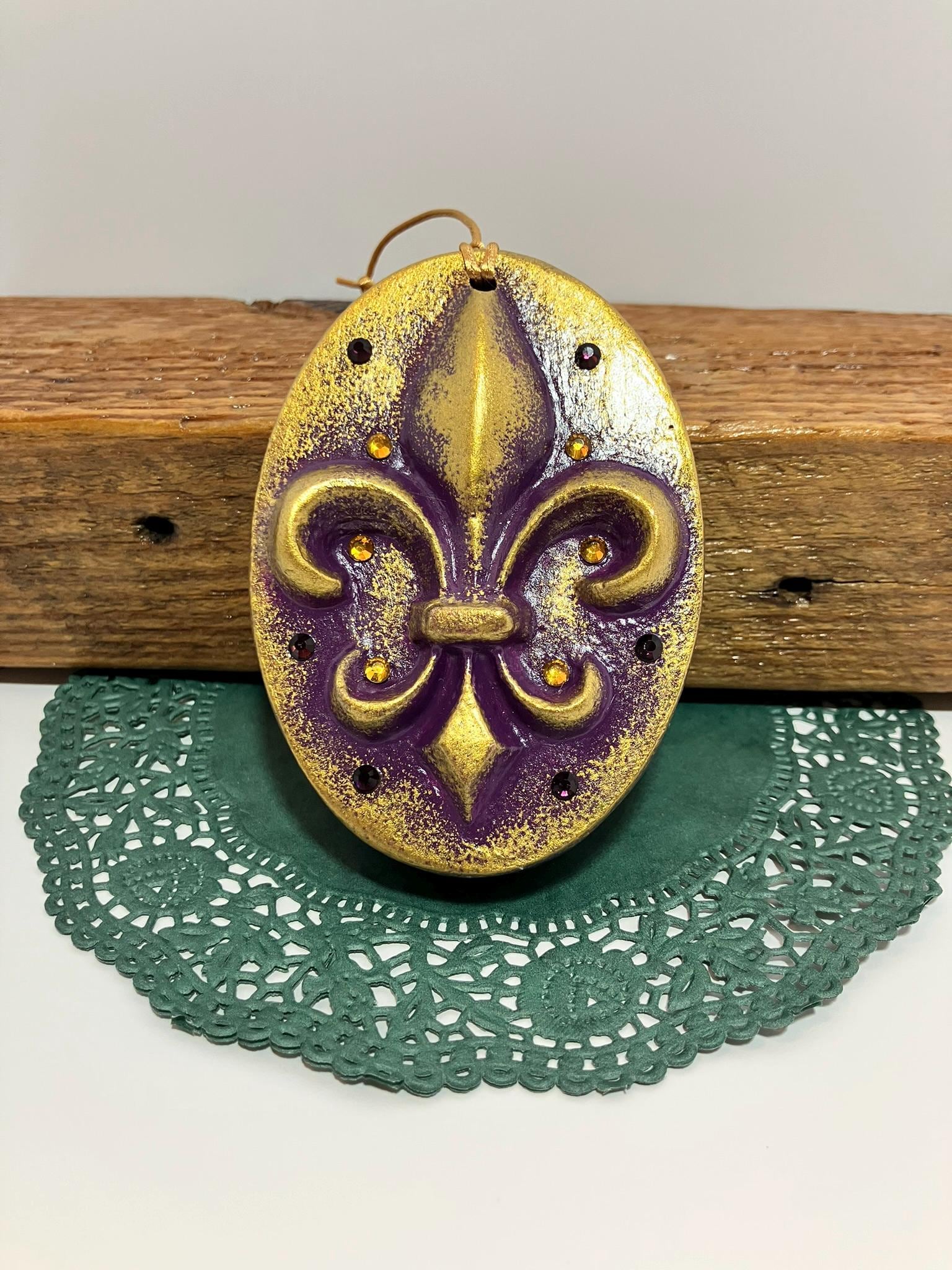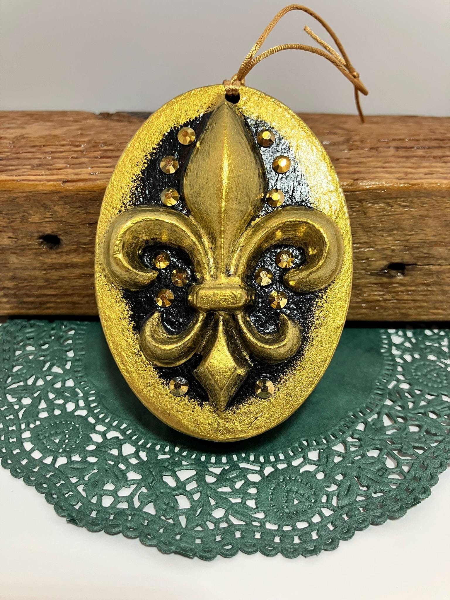 Oval fleur de lis ornament made from plaster of paris. Hand painted and sealed. Adorned with glass rhinestones. Please choose the one that you desire.