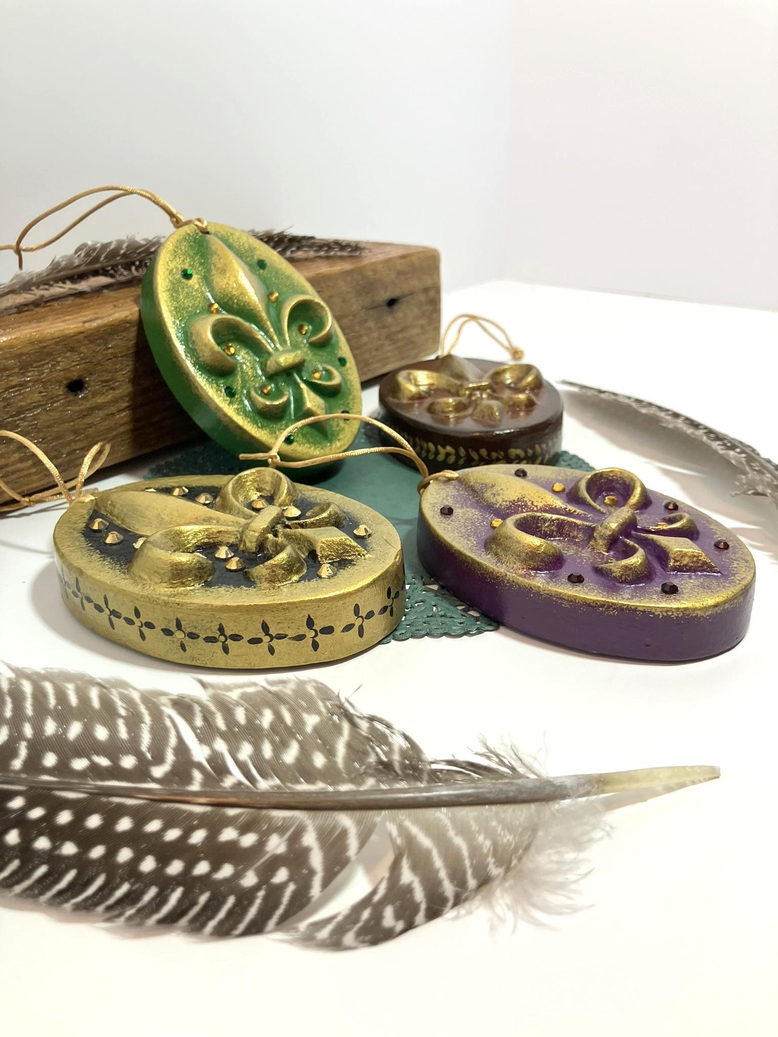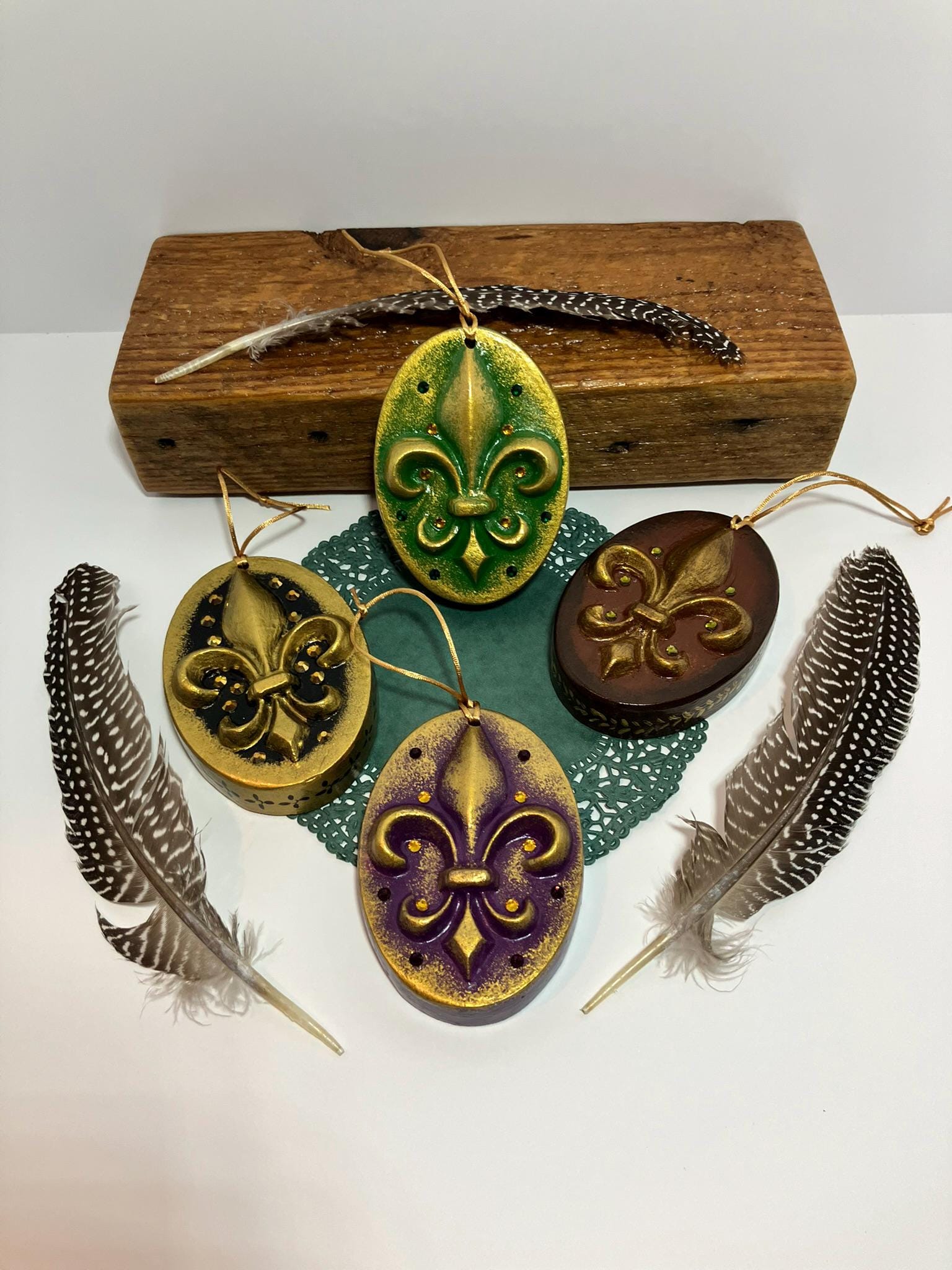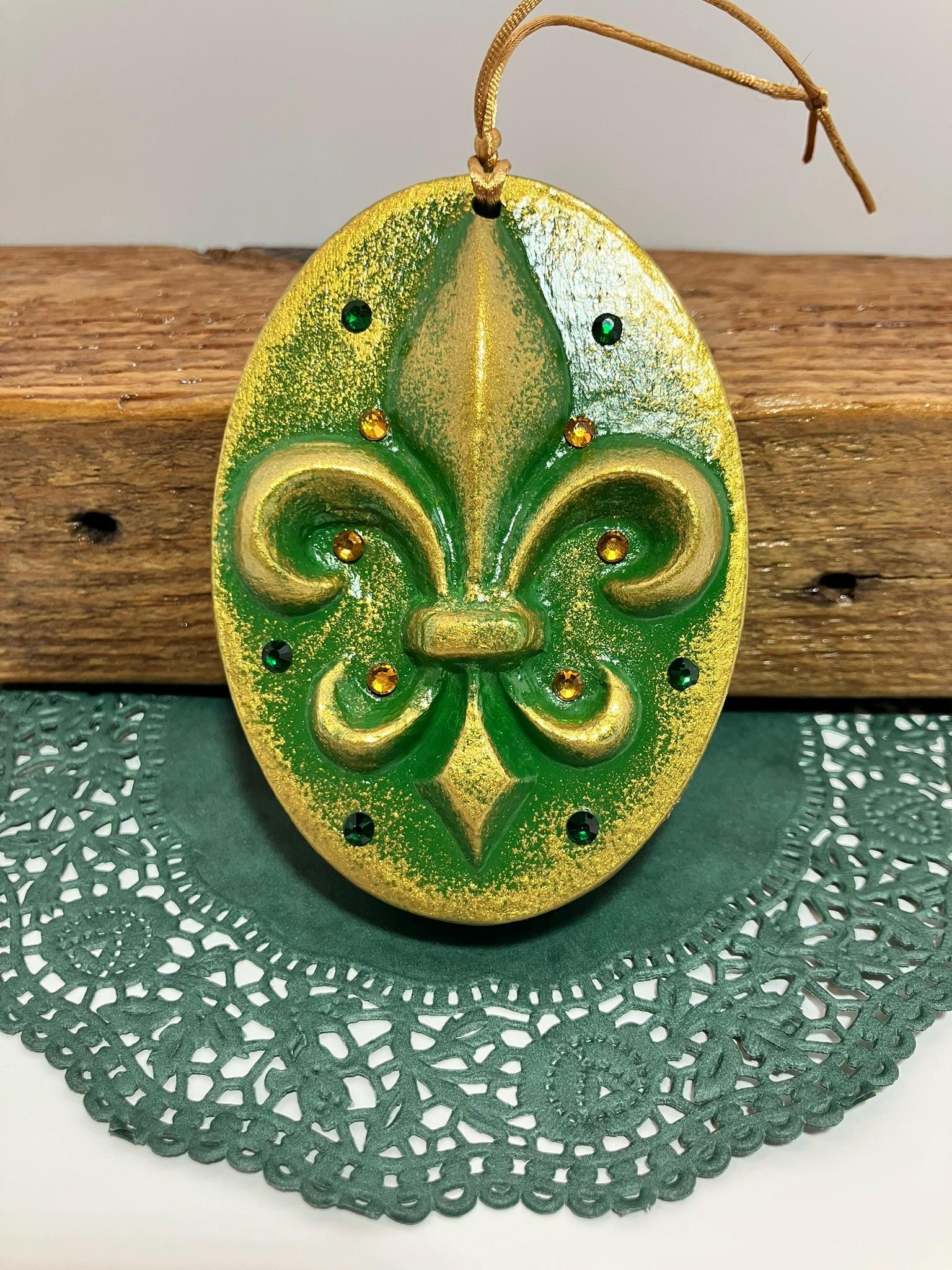 Oval fleur de lis ornament made from plaster of paris. Hand painted and sealed. Adorned with glass rhinestones. Please choose the one that you desire.