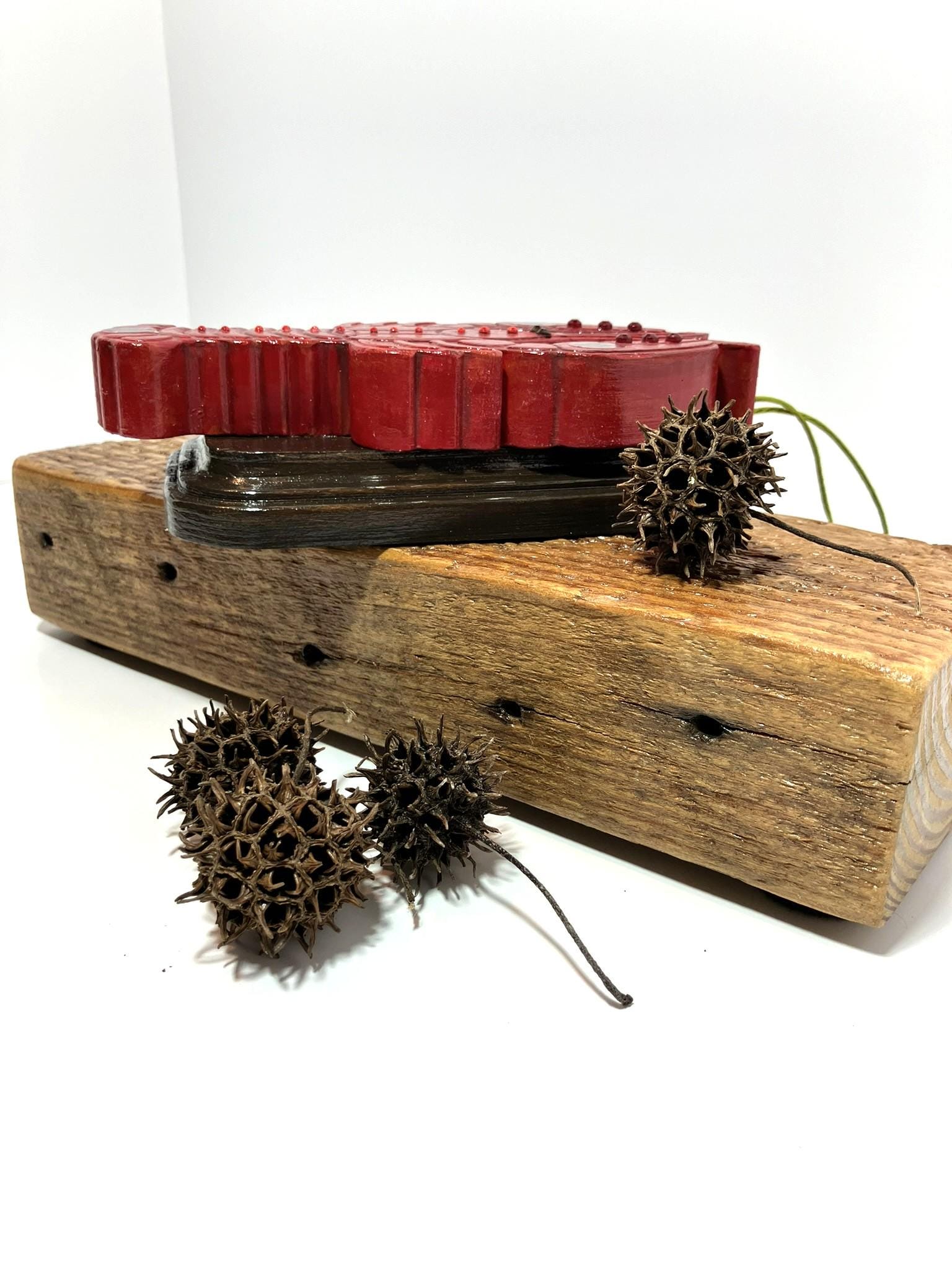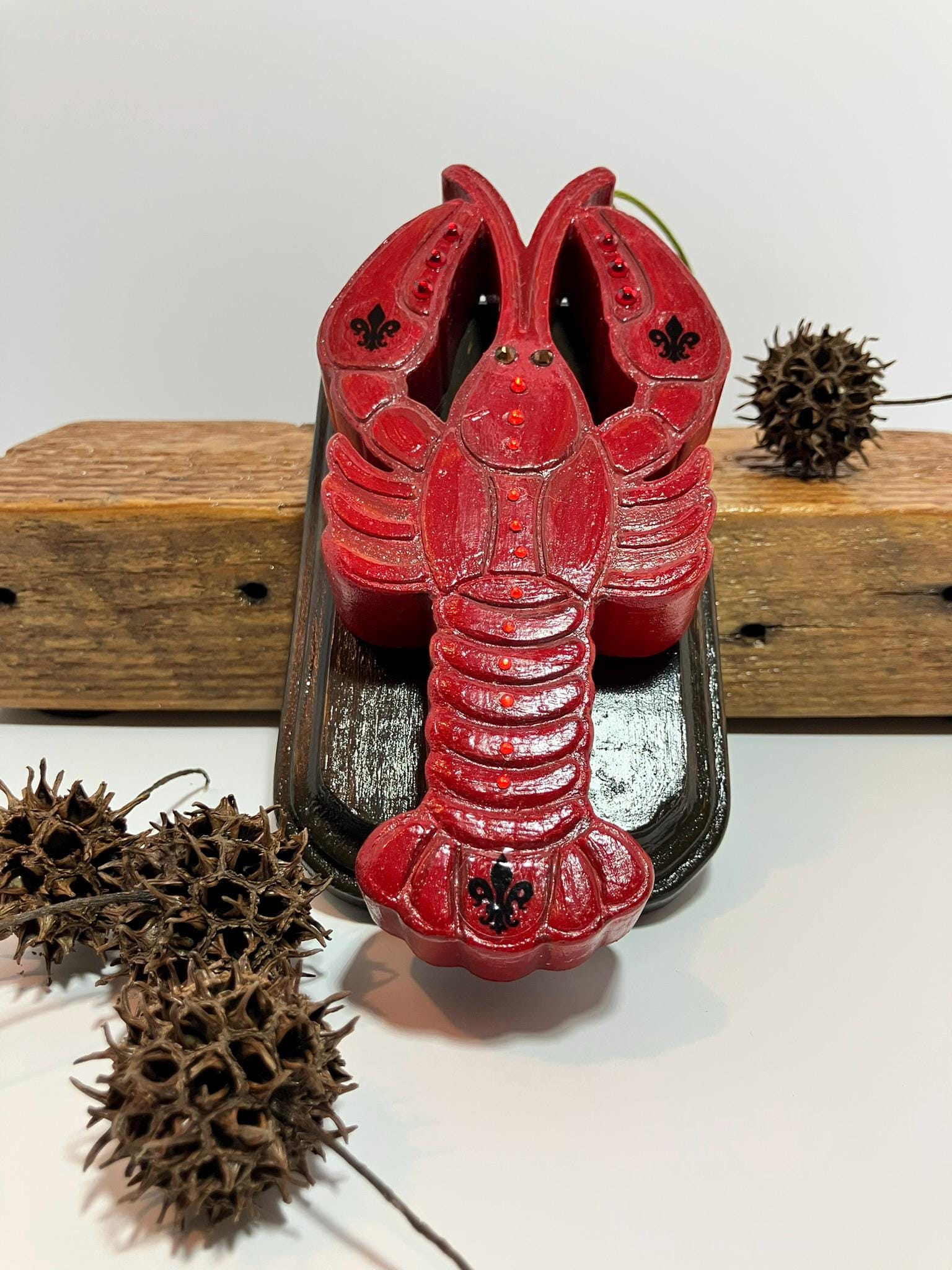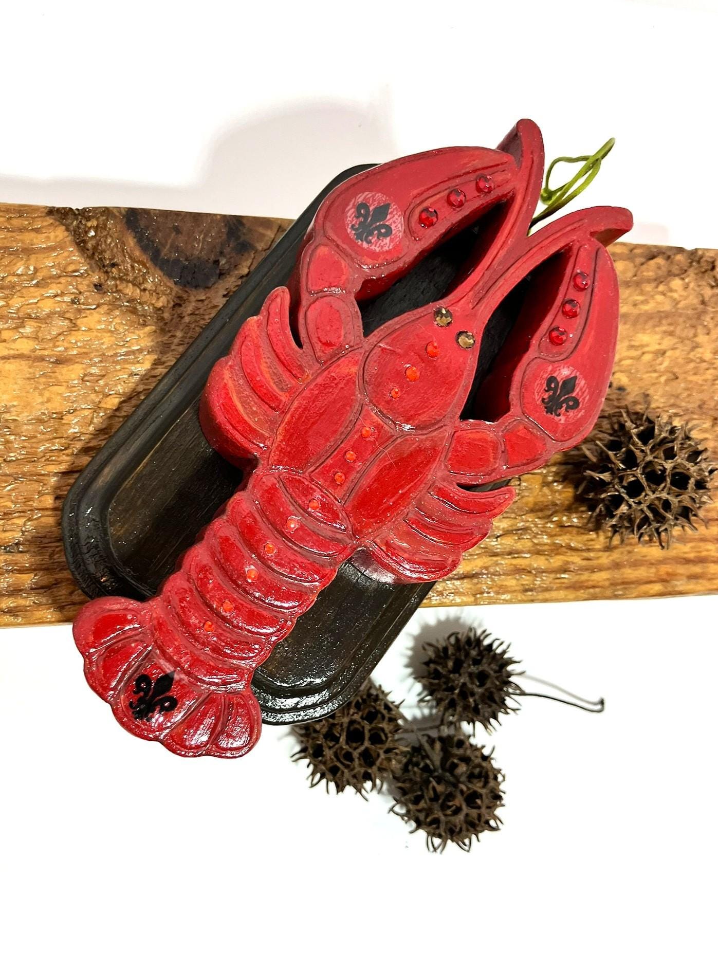 Large crawfish mounted on wooden plaque. Made from plaster of Paris. Hand painted and sealed. Adorned with glass rhinestones and fleur de lis emblems. Aiyee!