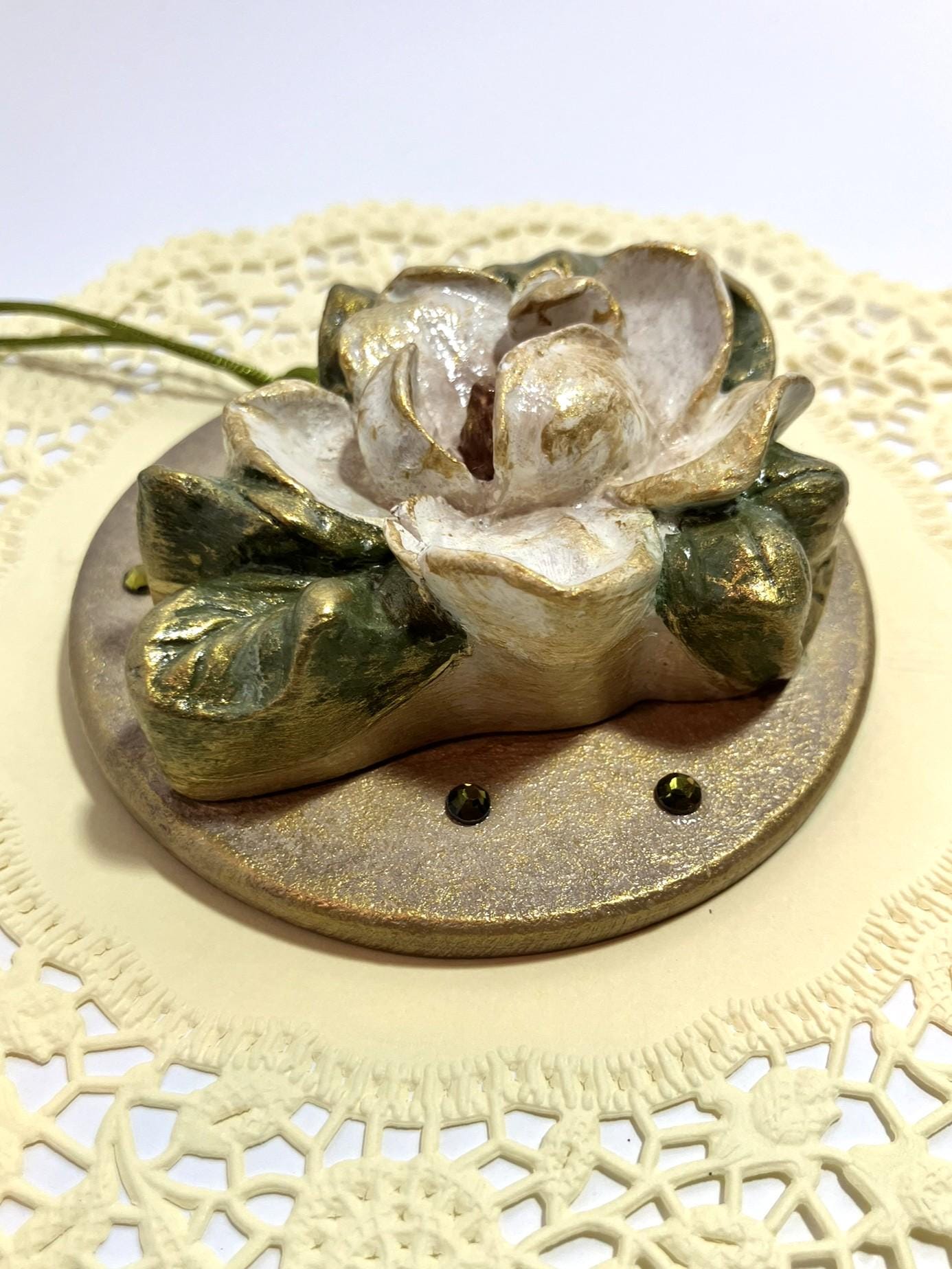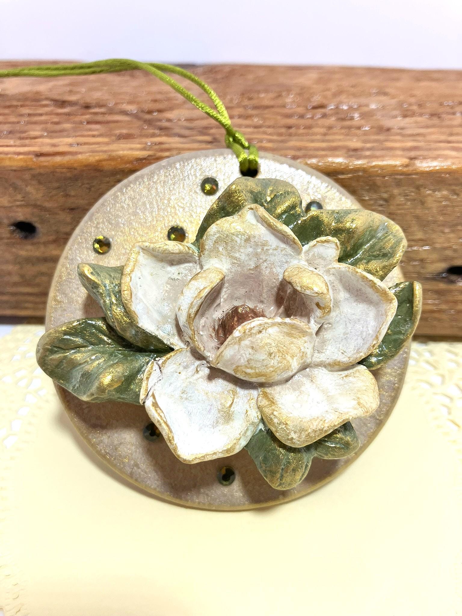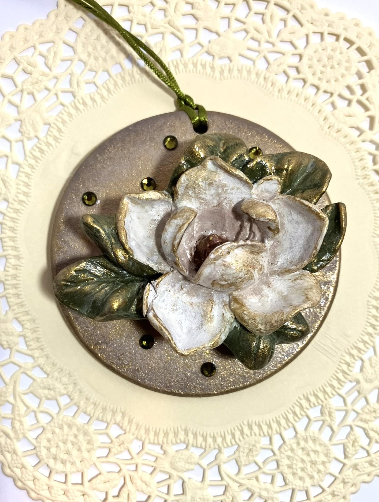 Round ornament with a handmade magnolia flower applied to it. Made from plaster of paris. Hand painted and sealed. Adorned with glass rhinestones. Flower of Louisiana.
