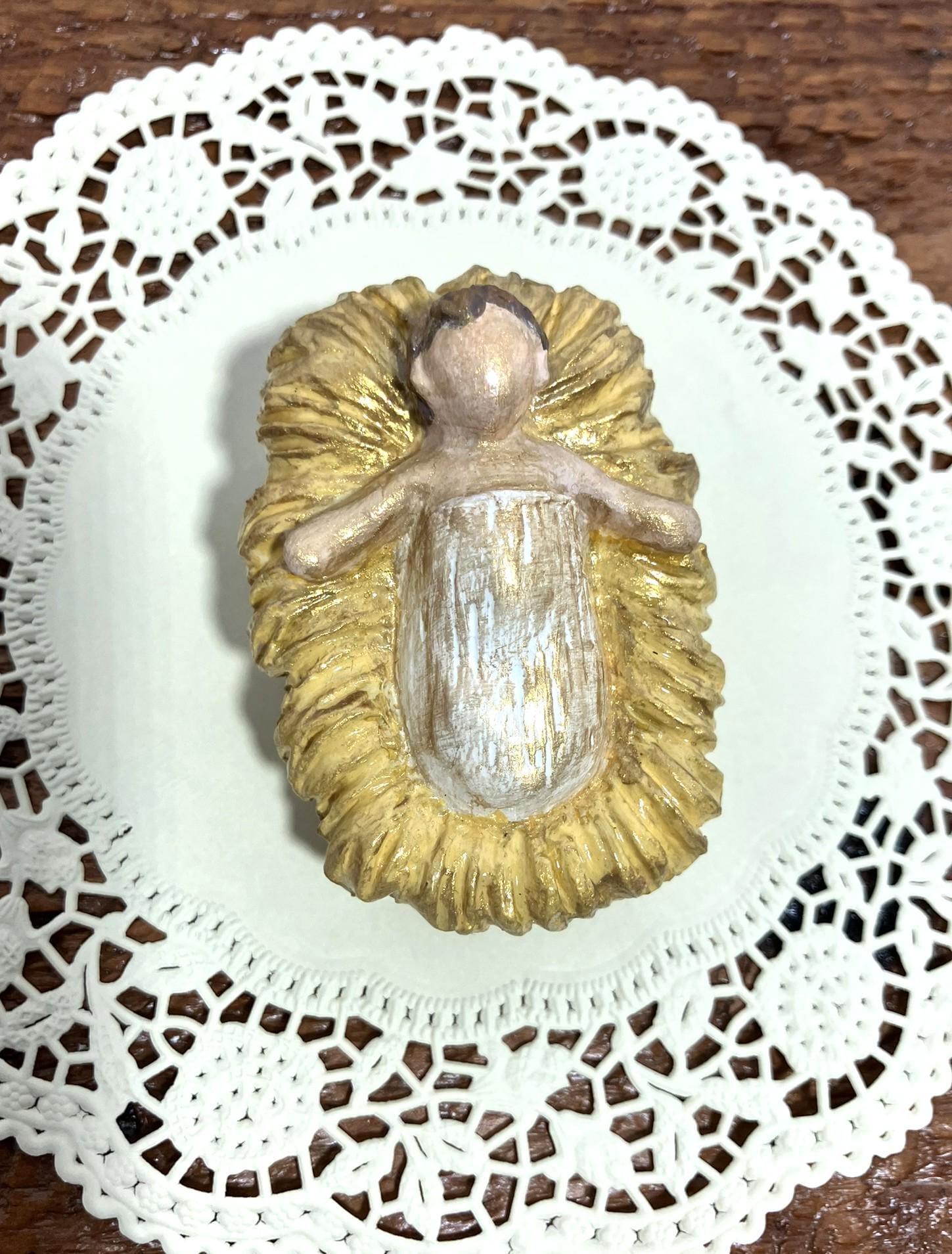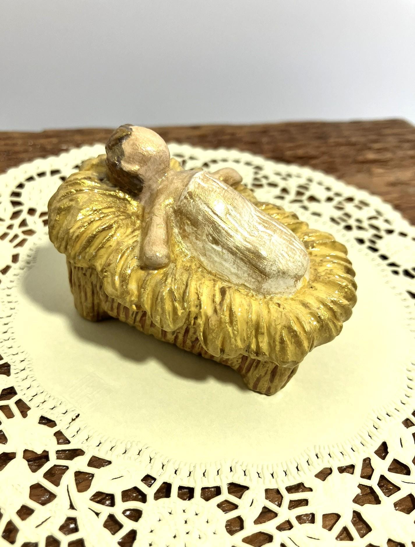 Sweet little baby Jesus in manger. I like having this around all year, not just at Christmas time. Made from plaster of paris. Hand painted and sealed. 1-3/4" w x 2-3/4" t x 1-3/4" dp.