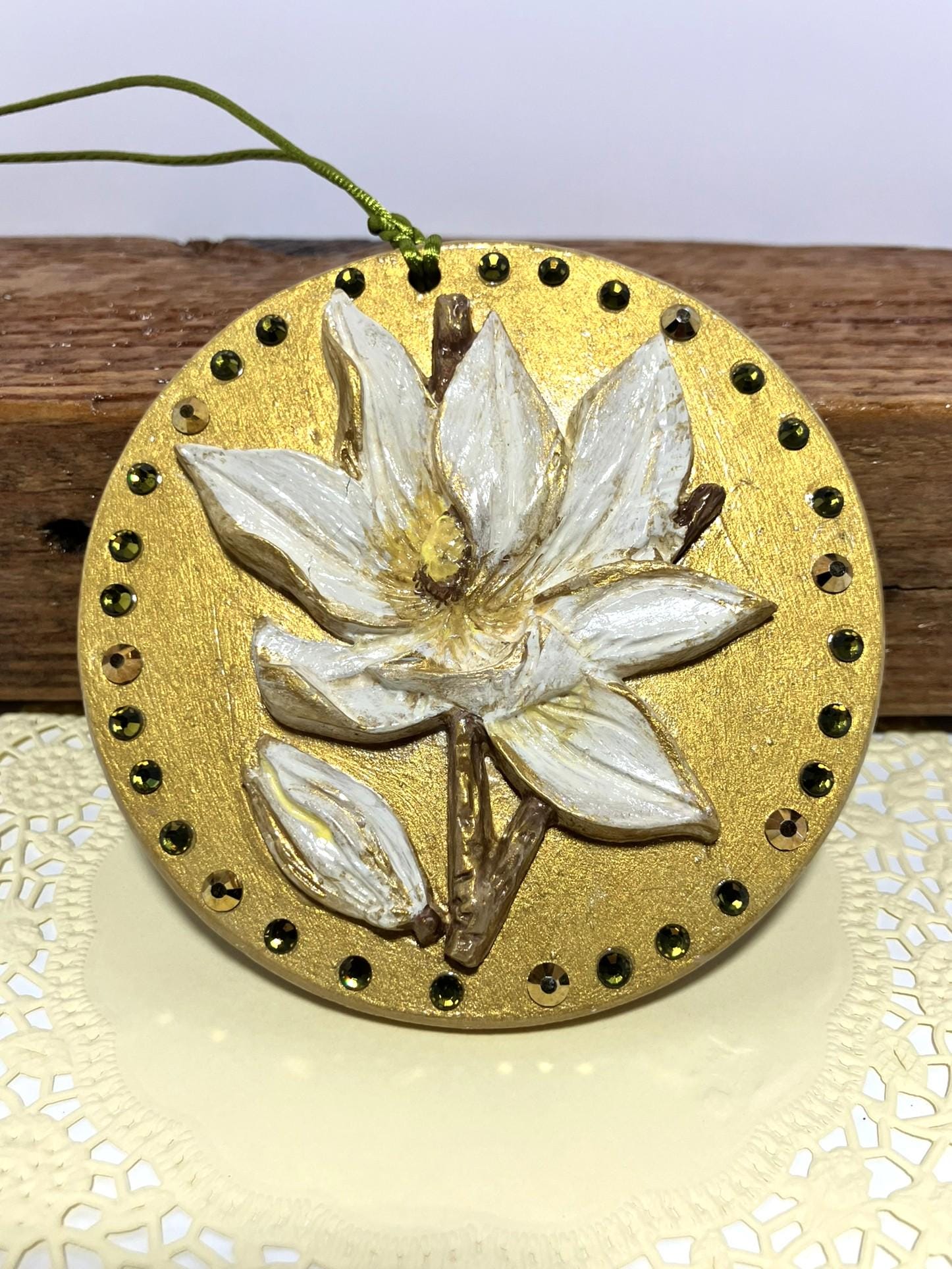 Large round ornament with an applied handmade magnolia flower. Everything made from plaster of paris. Hand painted and sealed. Adorned with glass rhinestones. The magnolia is the state flower of Louisiana. Can be hung anywhere in the home.