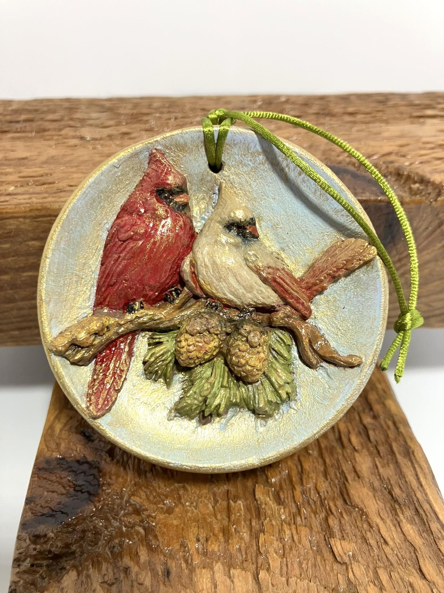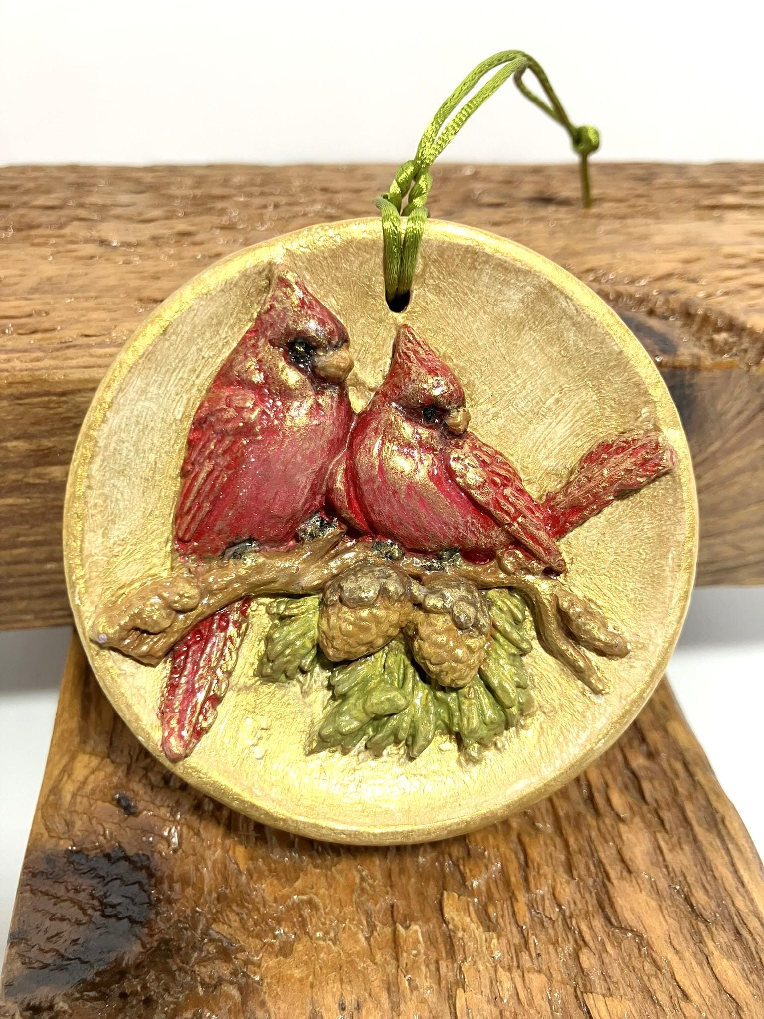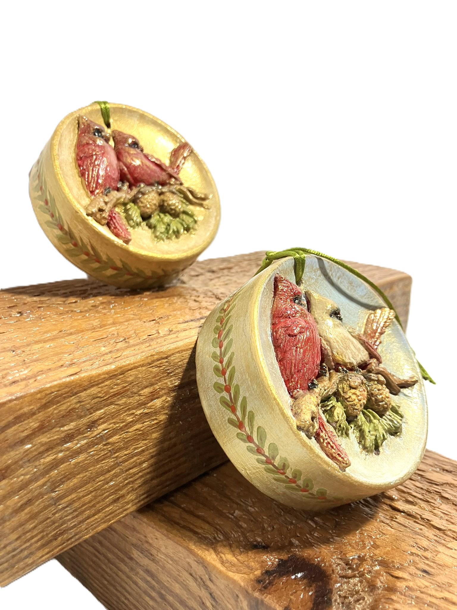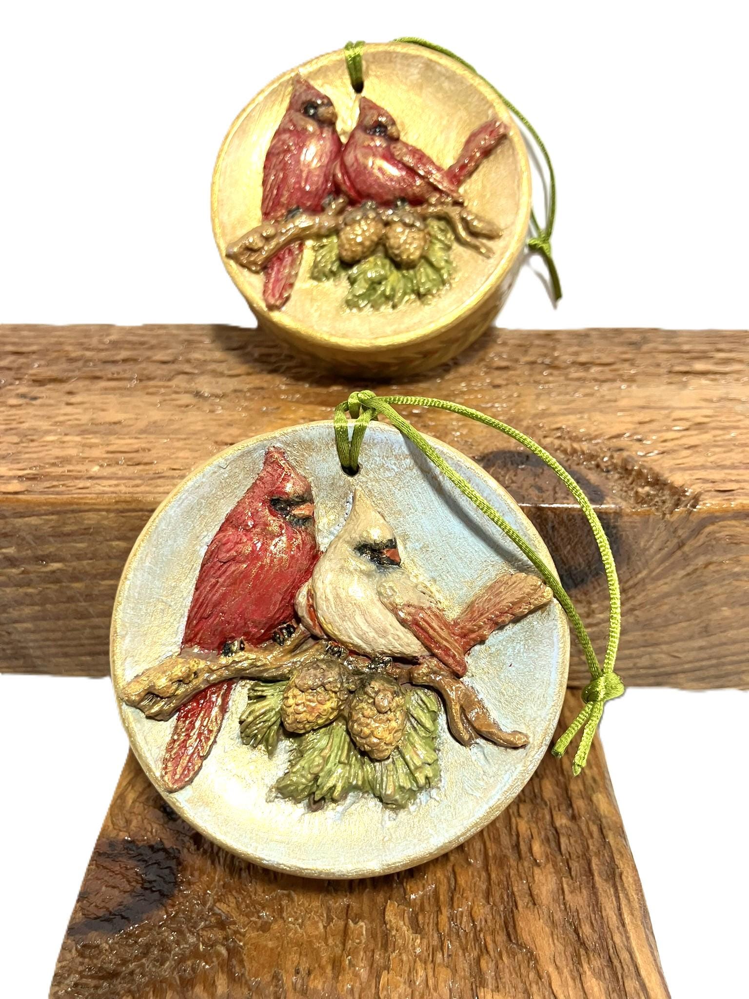 Cardinal ornament made from plaster of paris, hand painted and sealed. These can be hung anywhere in your home. 3" diameter x 1-3/8" thick.