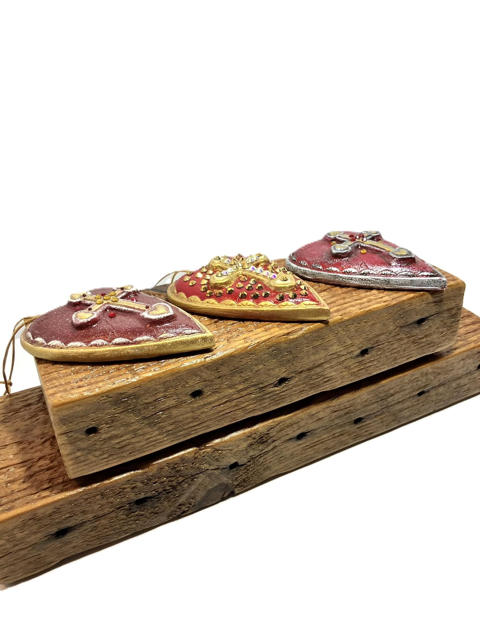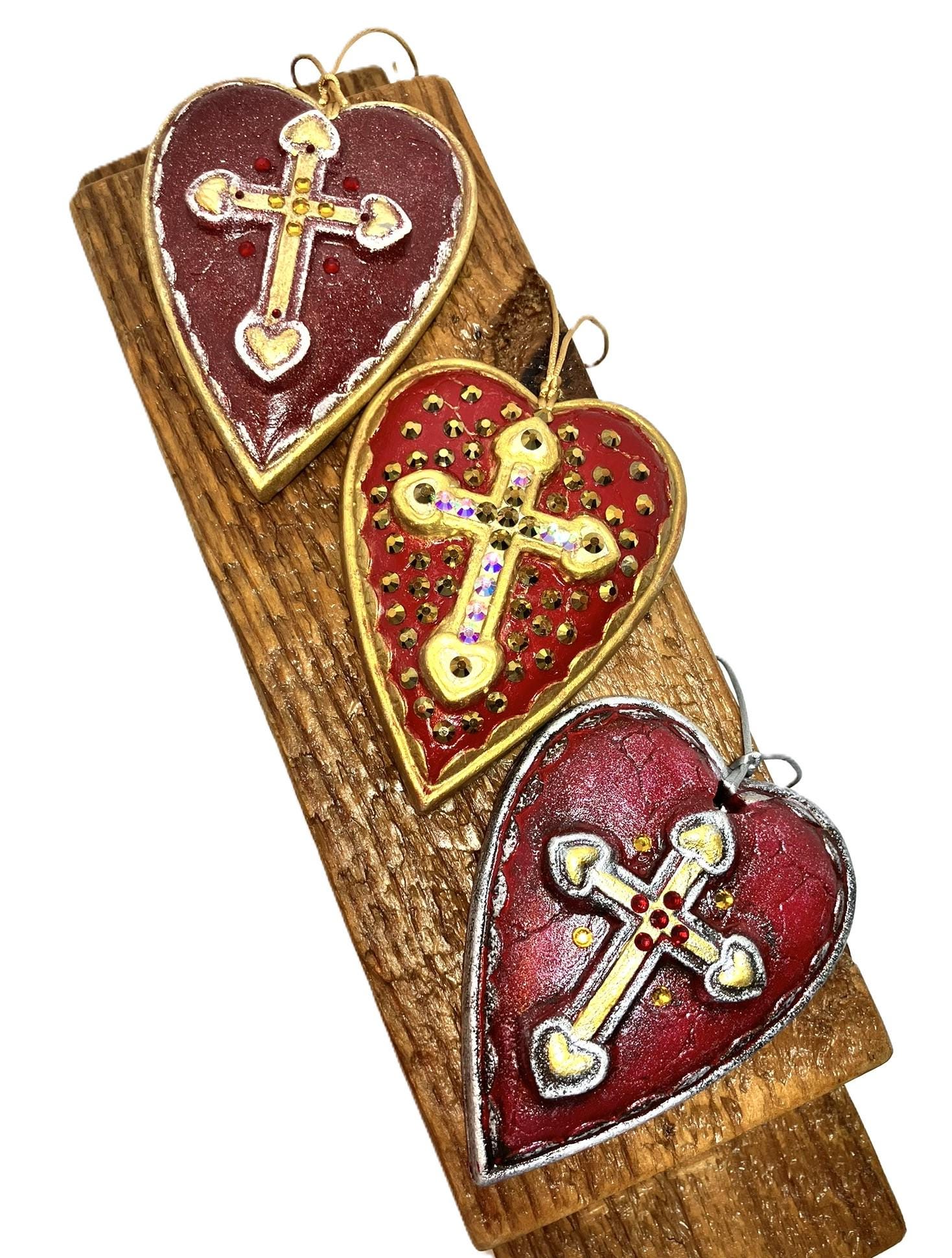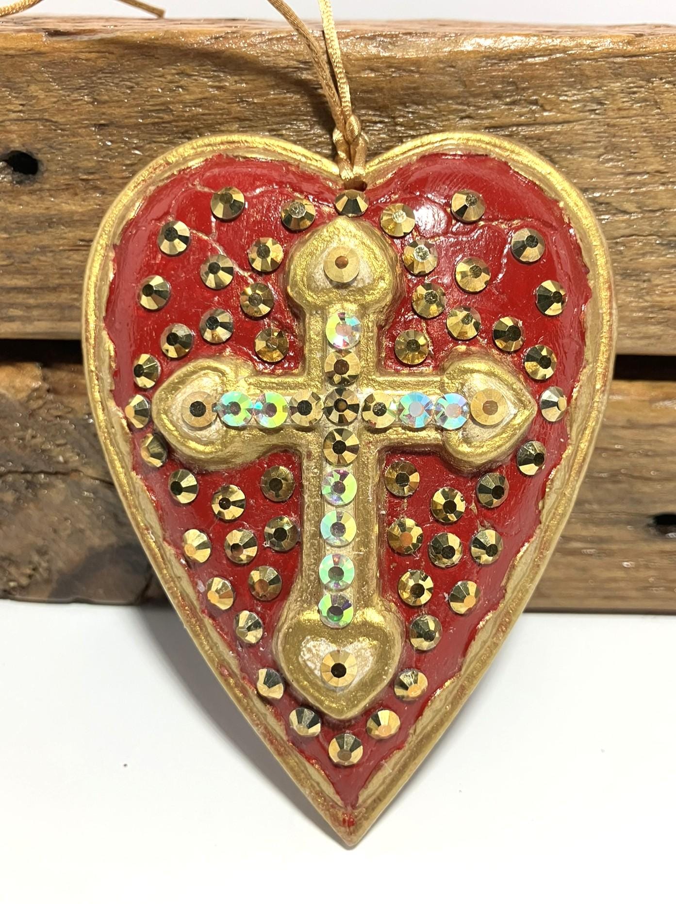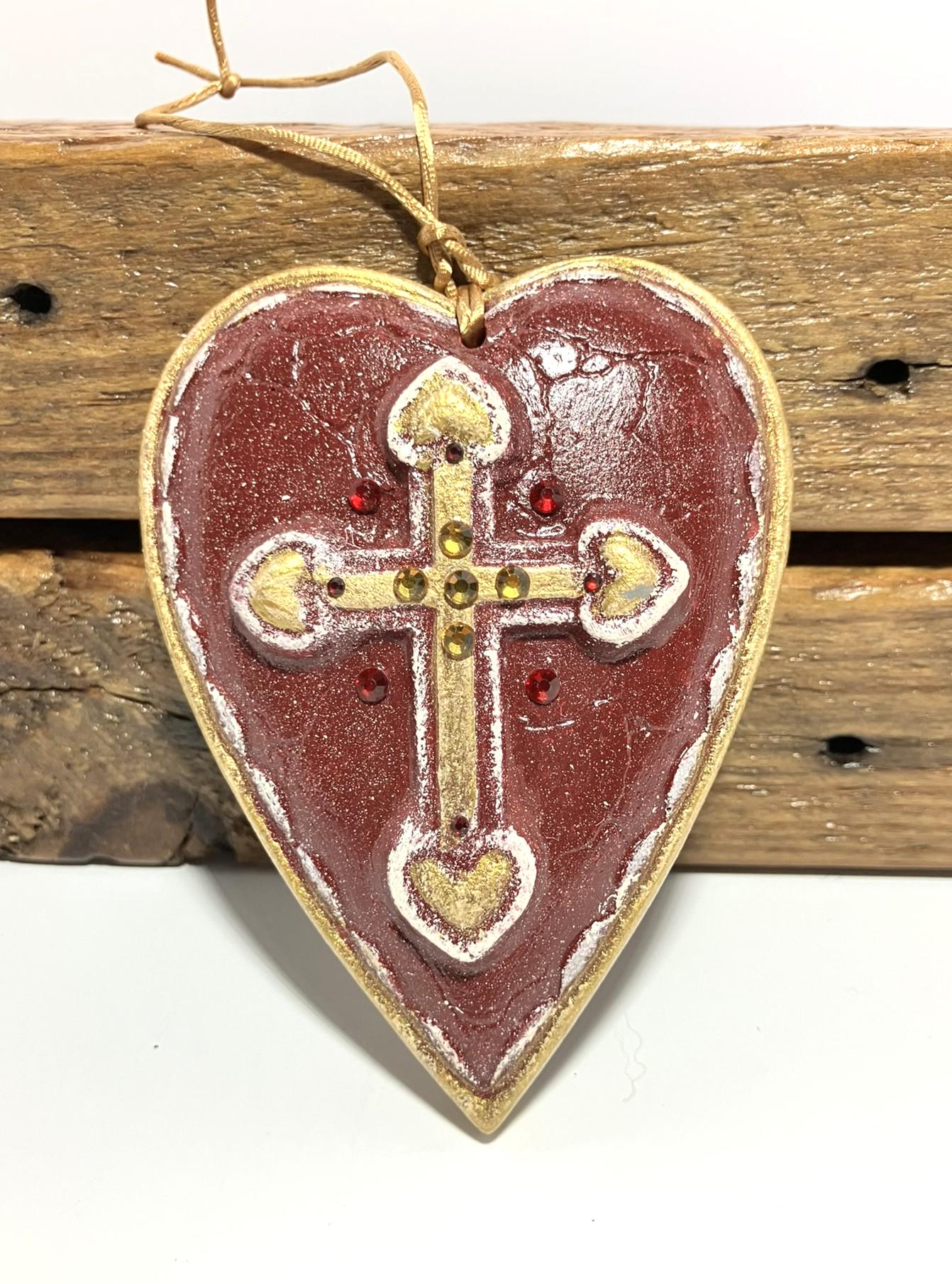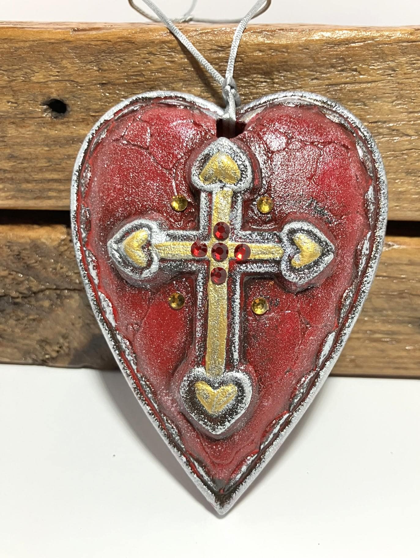 Handmade heart with cross ornament made from plaster of paris, hand painted and sealed. Adorned with glass rhinestones. This could be hung anywhere in your home.