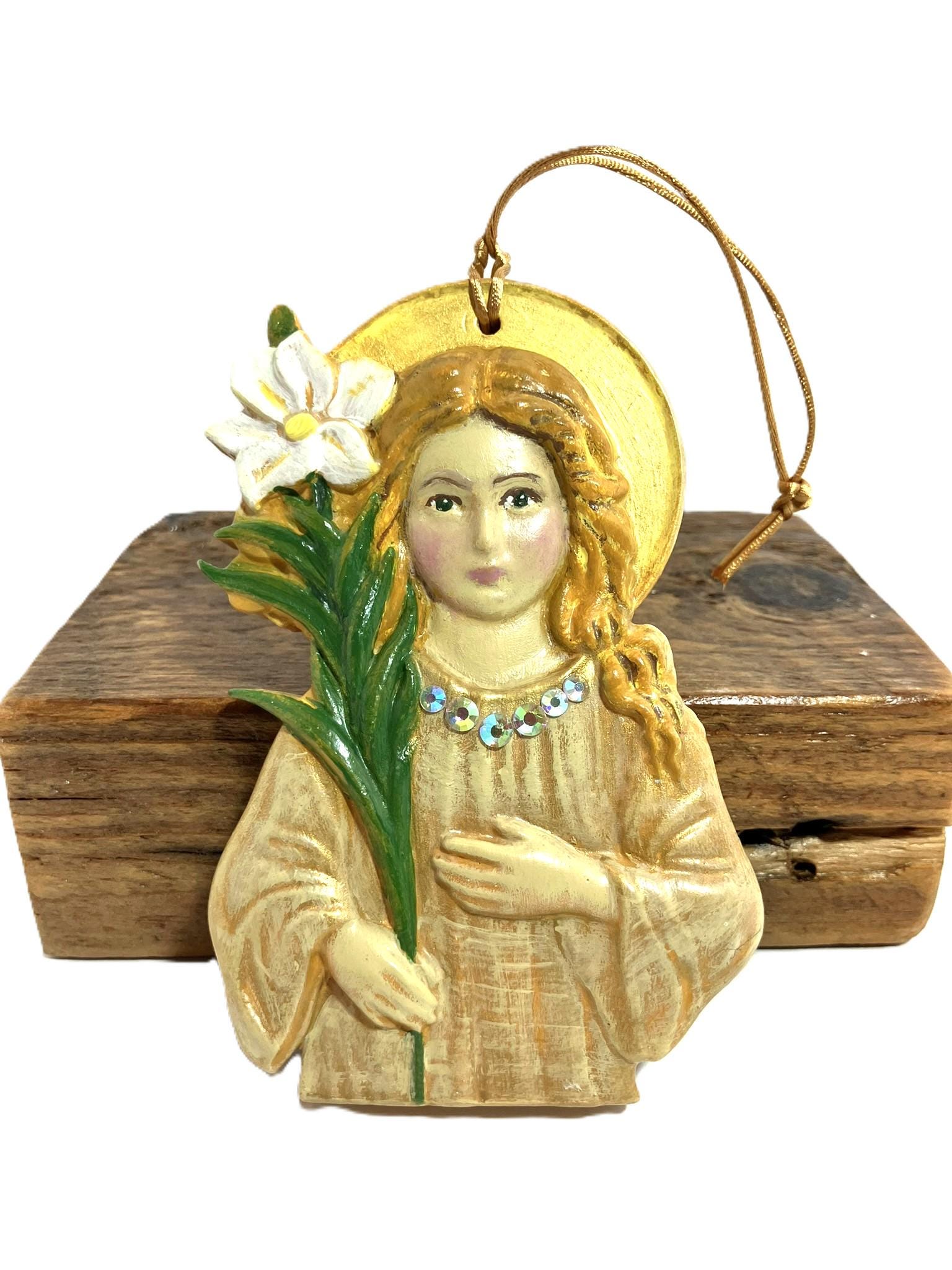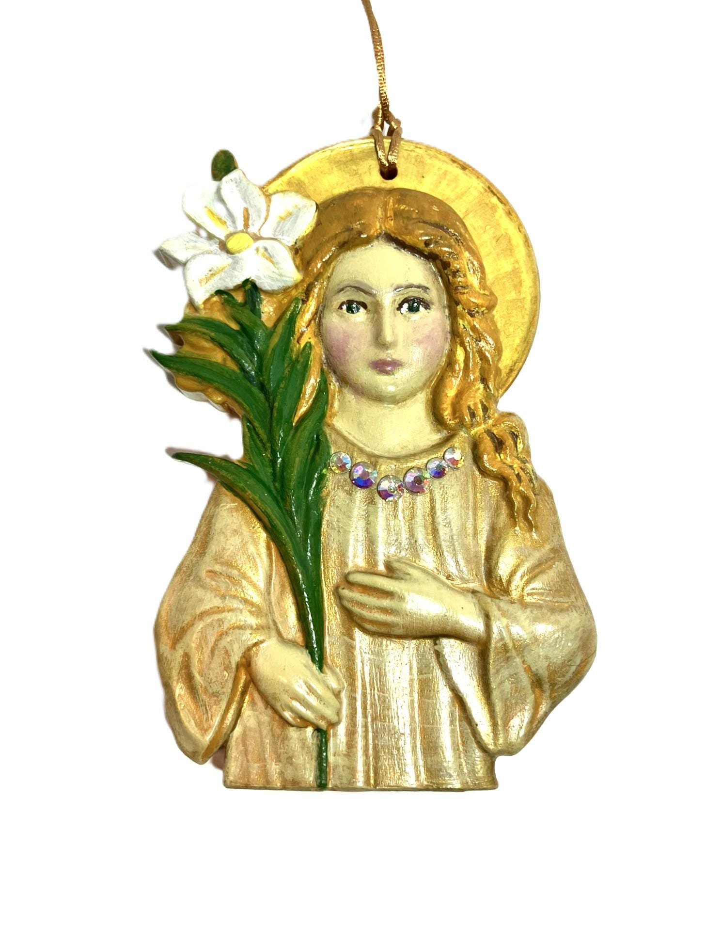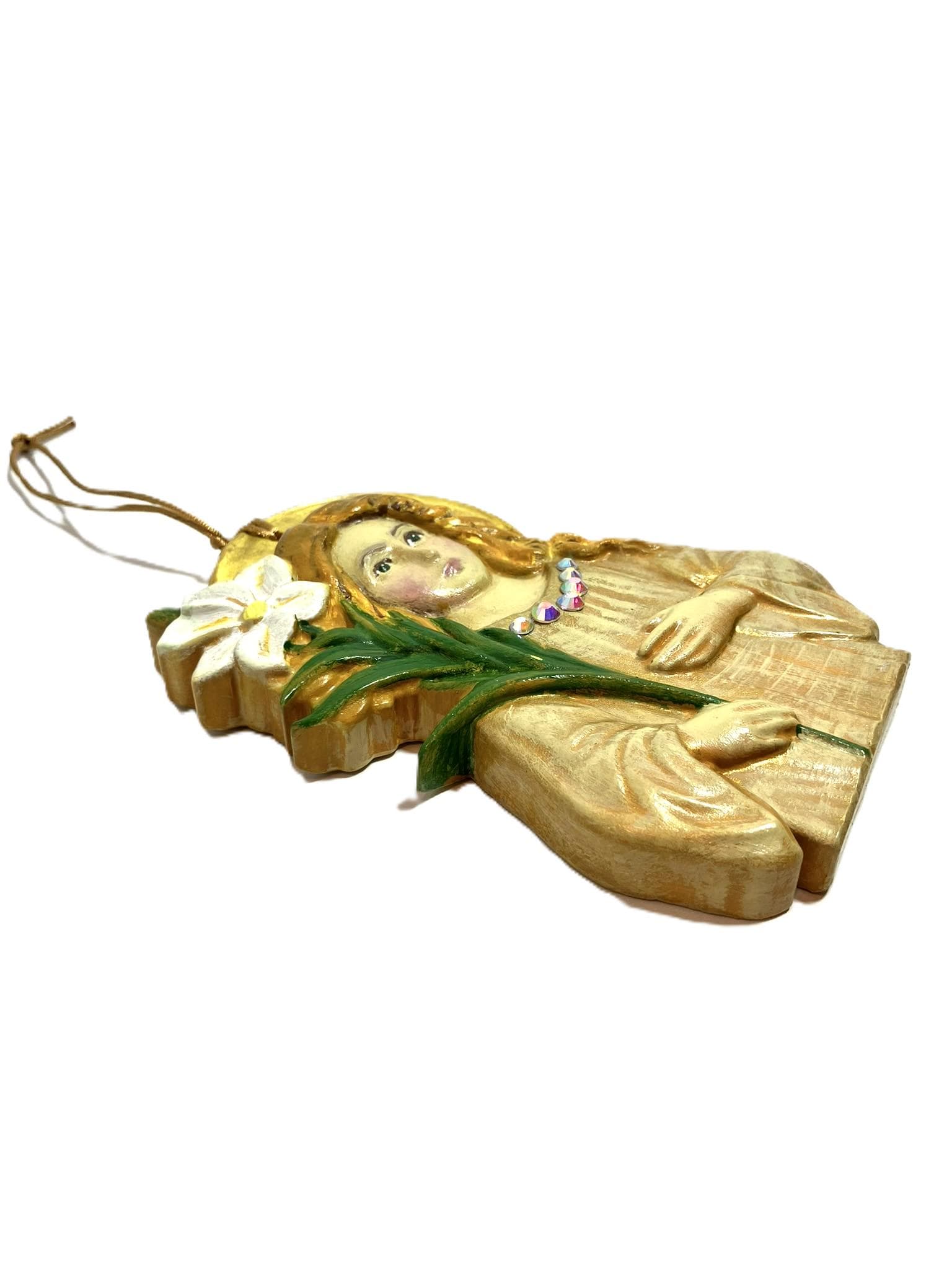 Handmade hanging angel ornament. Made from plaster of paris, hand painted, and sealed. Dimensions: 3" w x 4-3/4" t x 7/8" th. She is very sweet. It can be hung anywhere in the home.