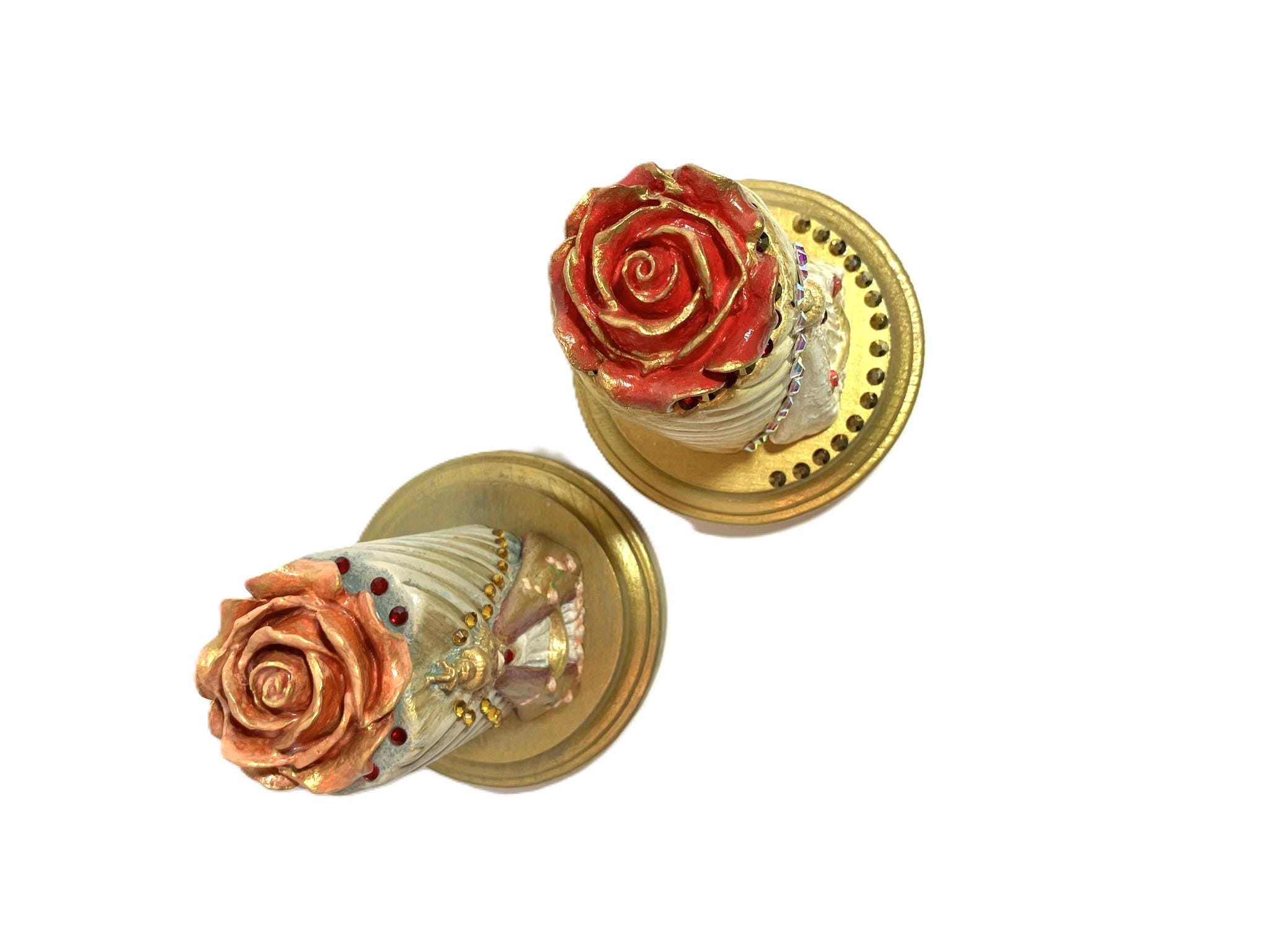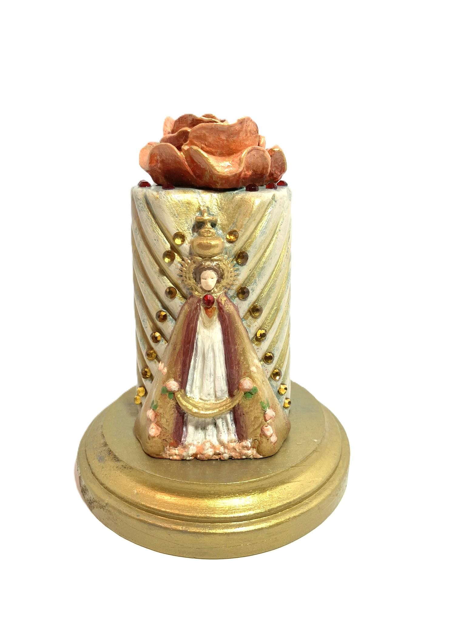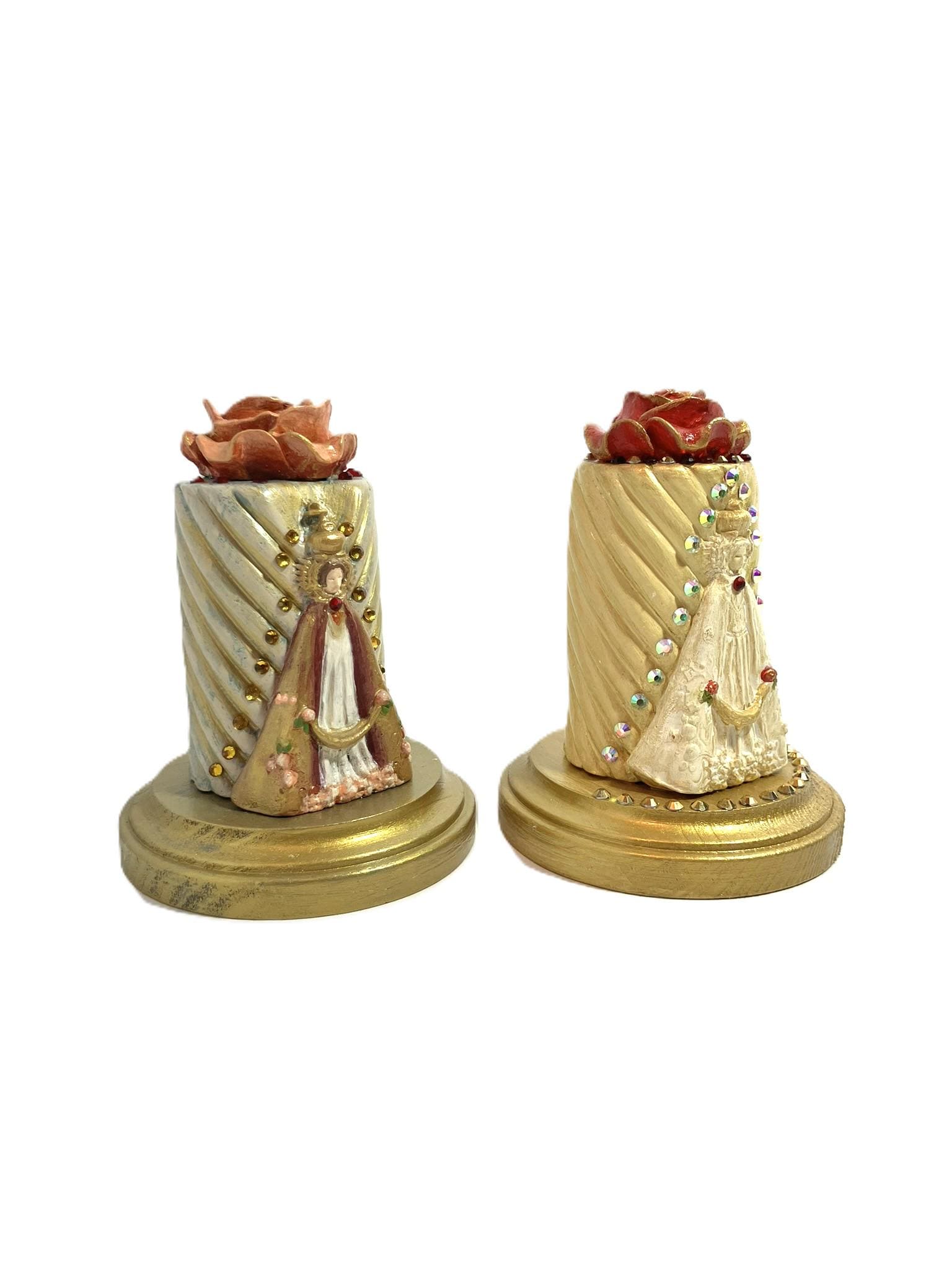 Handmade Prince of Peace shelf sitter, made from plaster of paris, hand painted, and sealed. Rose made separately and applied. Mounted to a wooden base. Adorned with glass rhinestones. Dimensions: 4" dia x 5-1/4" t. So sweet! Please select the one that you desire!