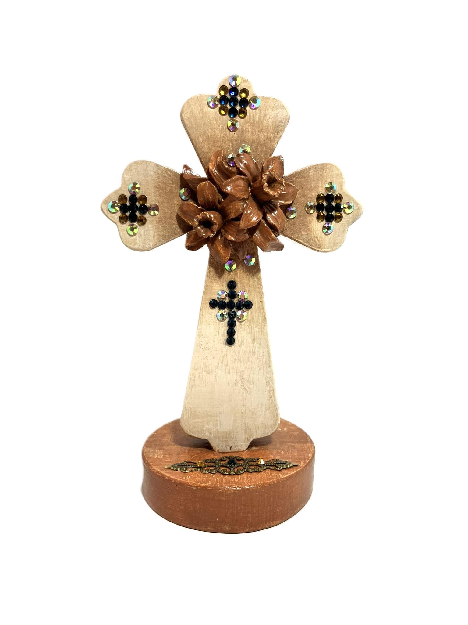 Handmade cross mounted on stand. Made from plaster of paris, hand painted, and sealed. Design made separately and applied. Adorned with glass rhinestones. Dimensions: 4-3/8" w x 3" dp x 7-1/4" t. Please select the one that you desire!