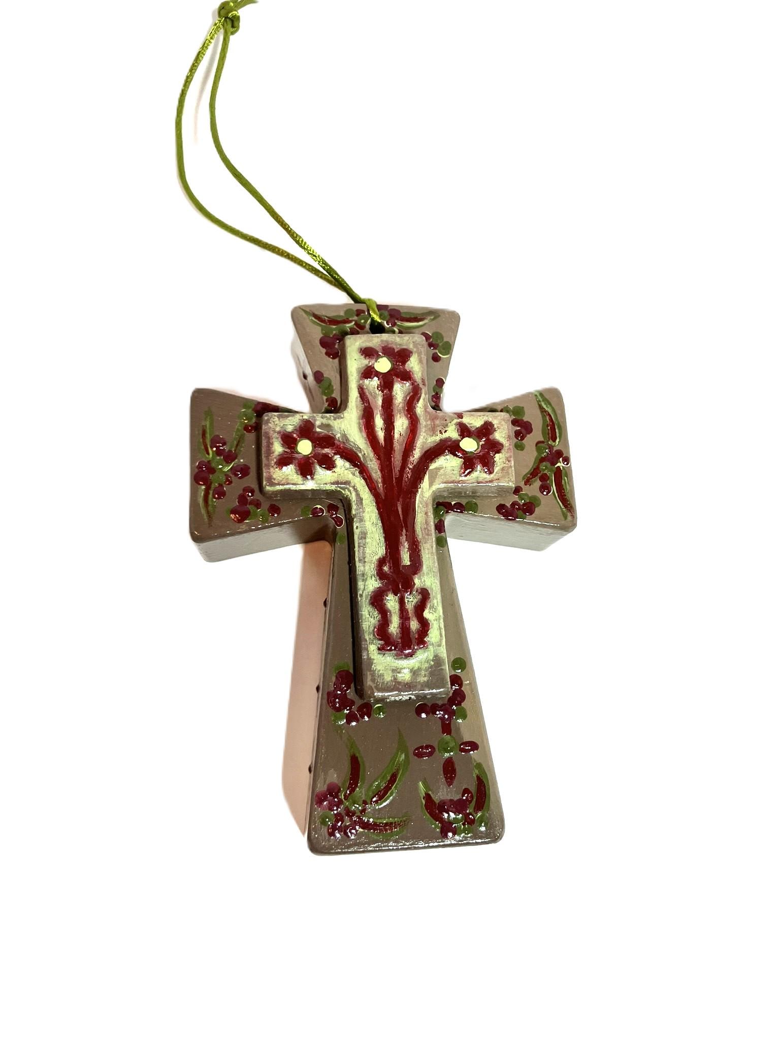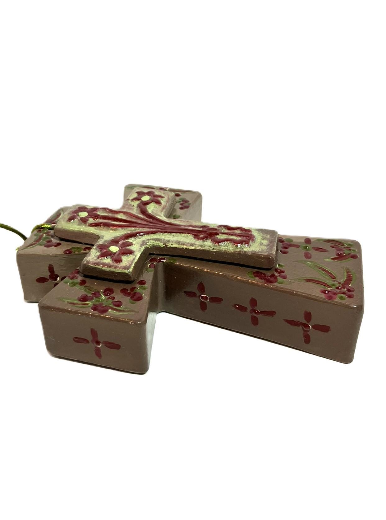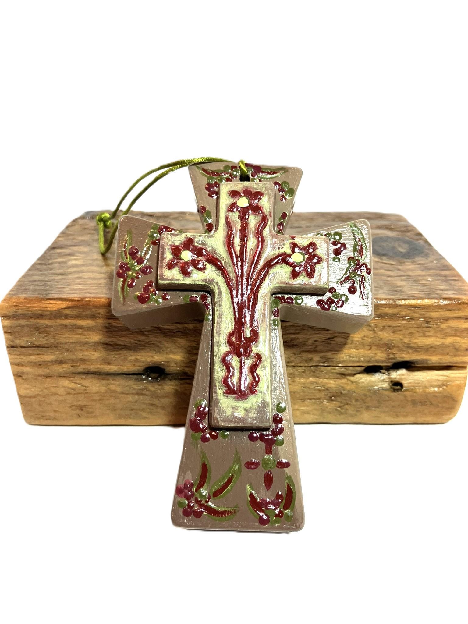 Handmade small hanging cross. Made from plaster of paris, hand painted, and sealed. Separate handmade cross applied on top. Browns, greens, and burgandy. Dimensions: 3" w x 4" t x 1" th.