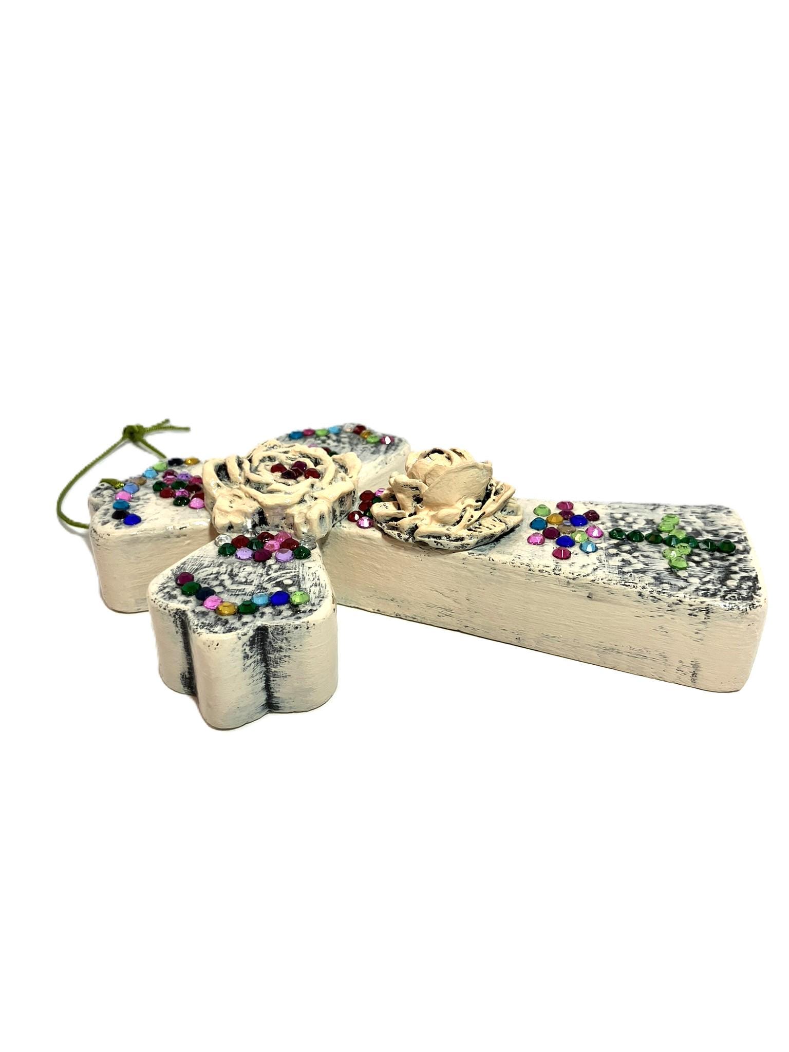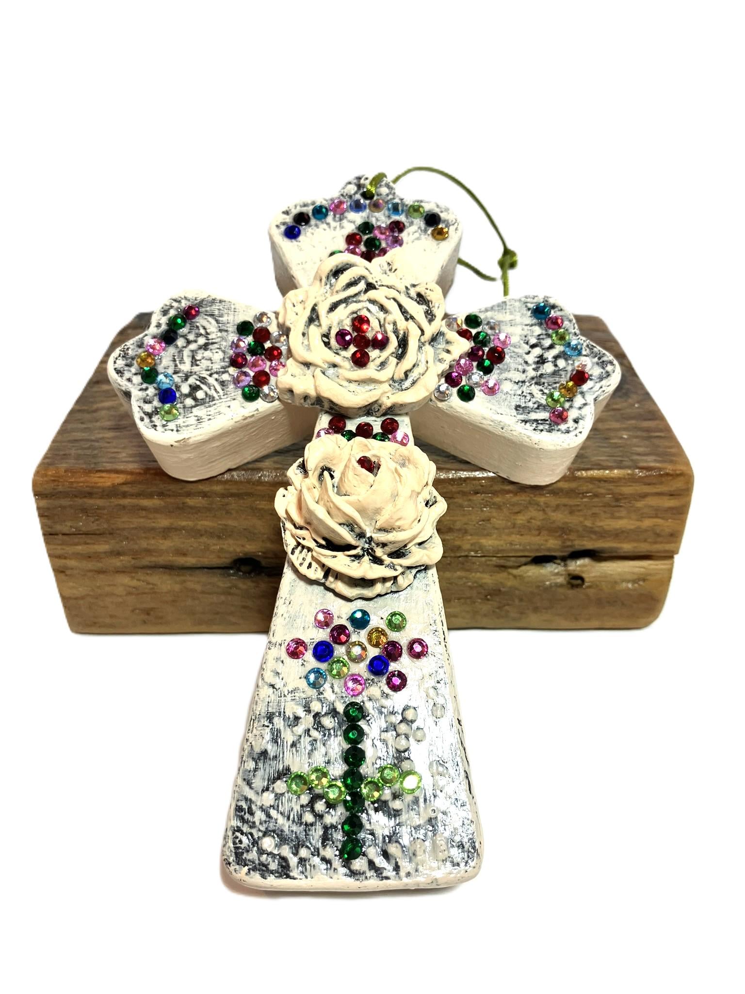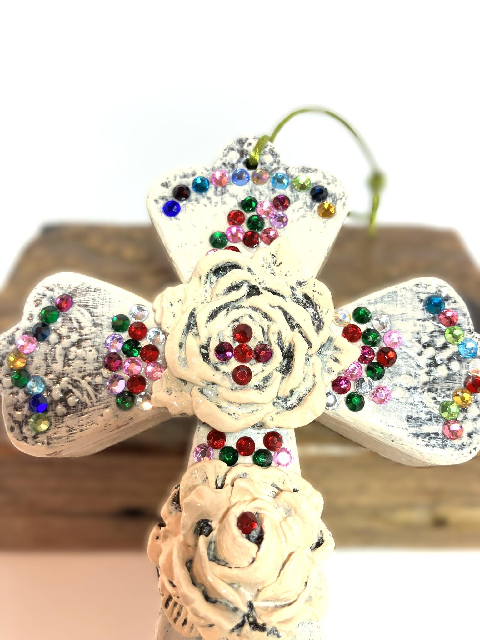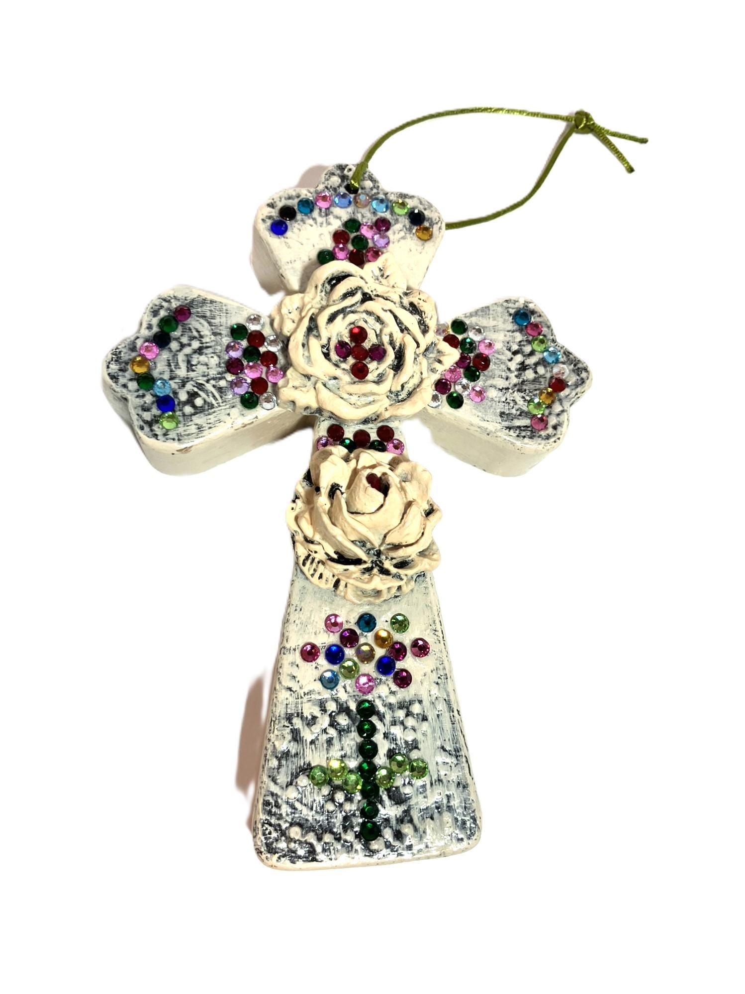 Handmade ornate hanging cross. Made from plaster of paris, hand painted, and sealed. Separately made roses applied to cross. Heavily adorned with glass rhinestones. Cream color, mottled. Dimensions: 4-1/4" w x 6-1/4" t x 1-1/2" dp.