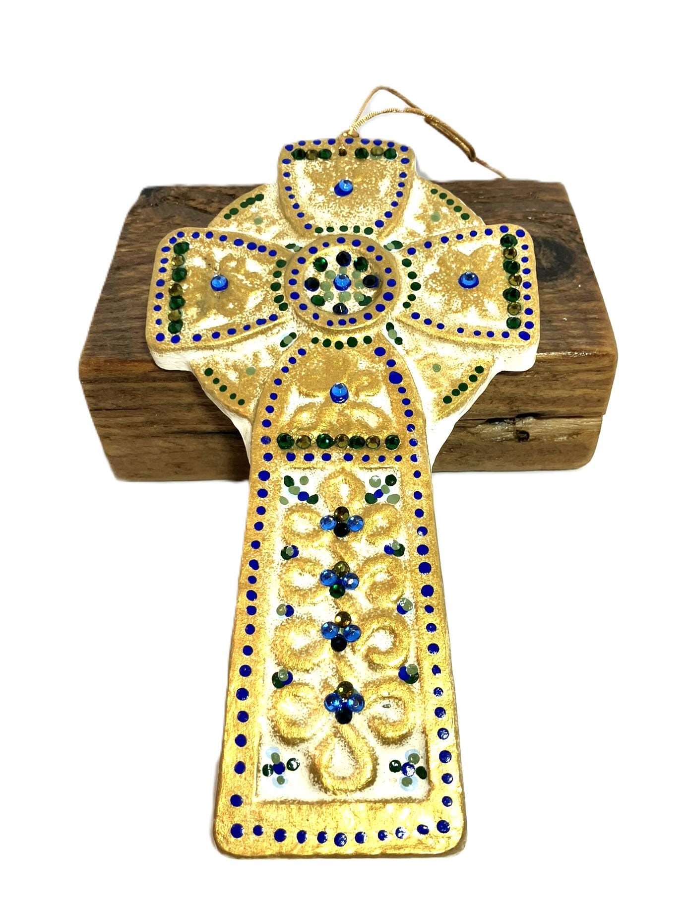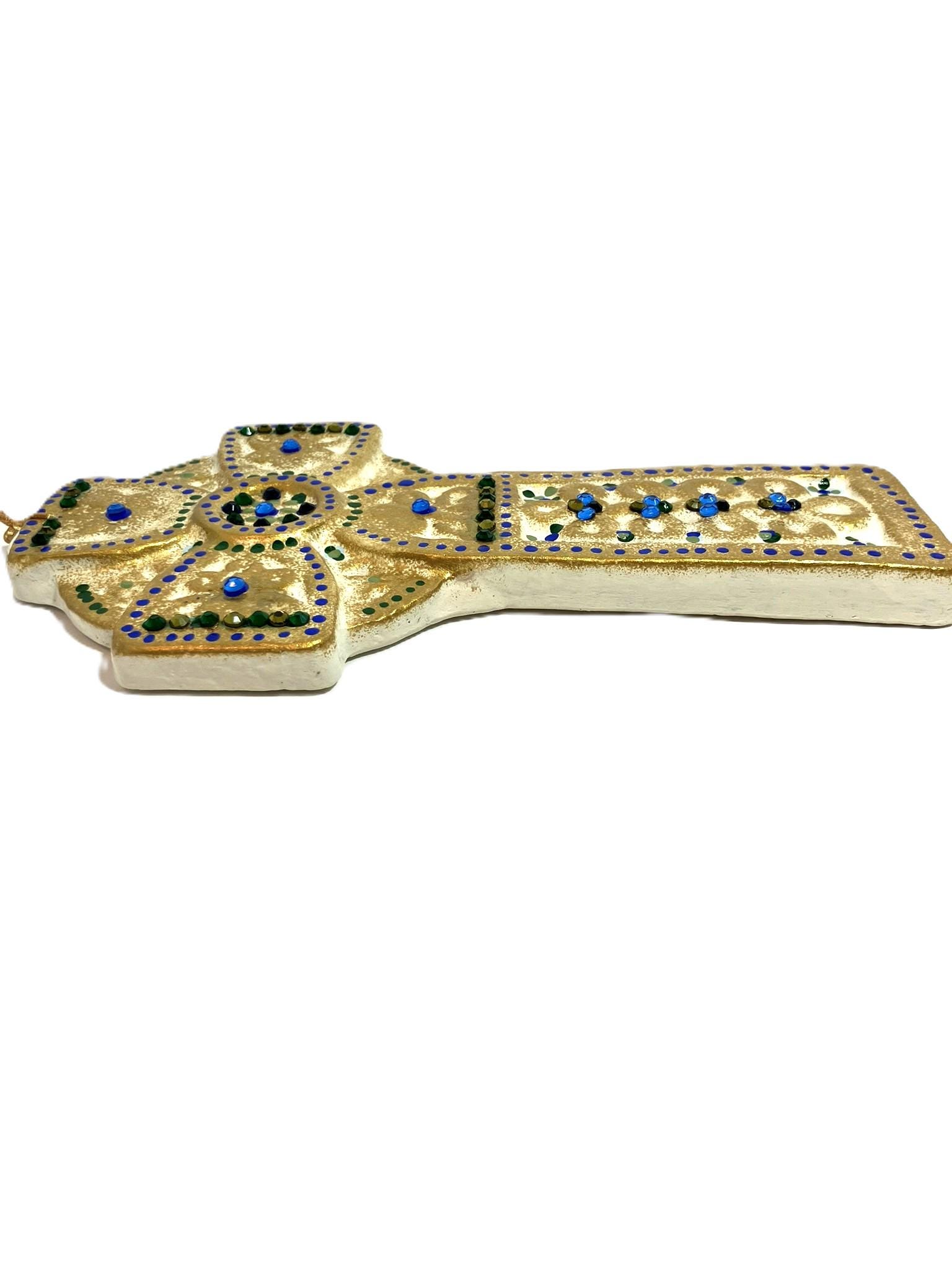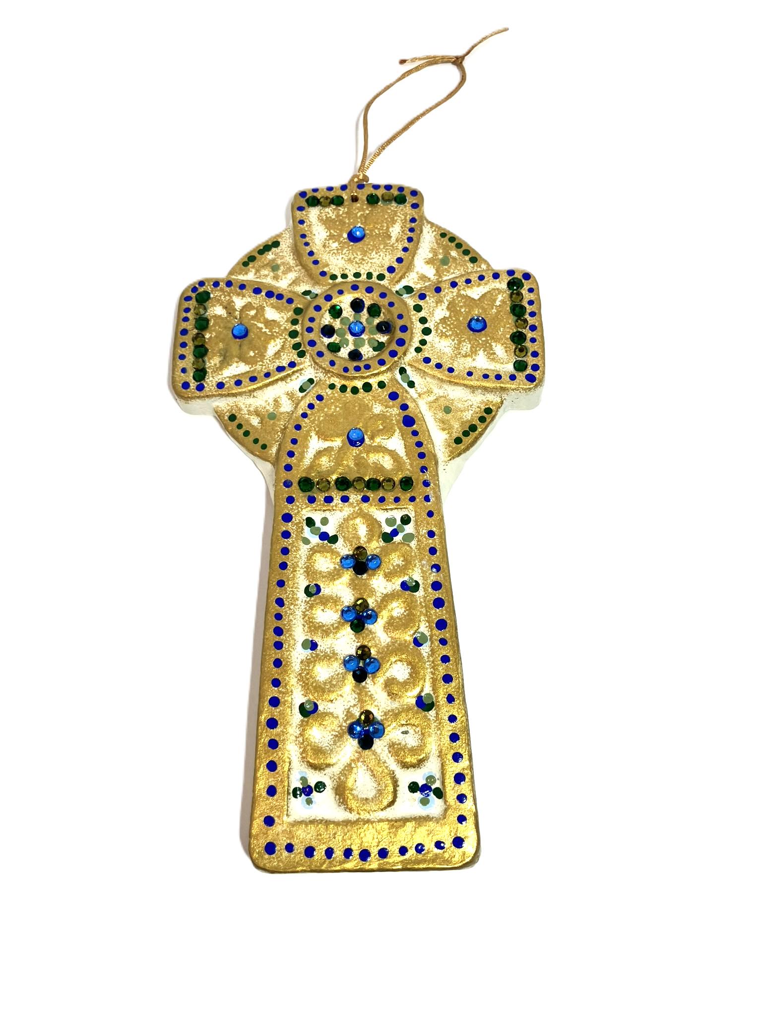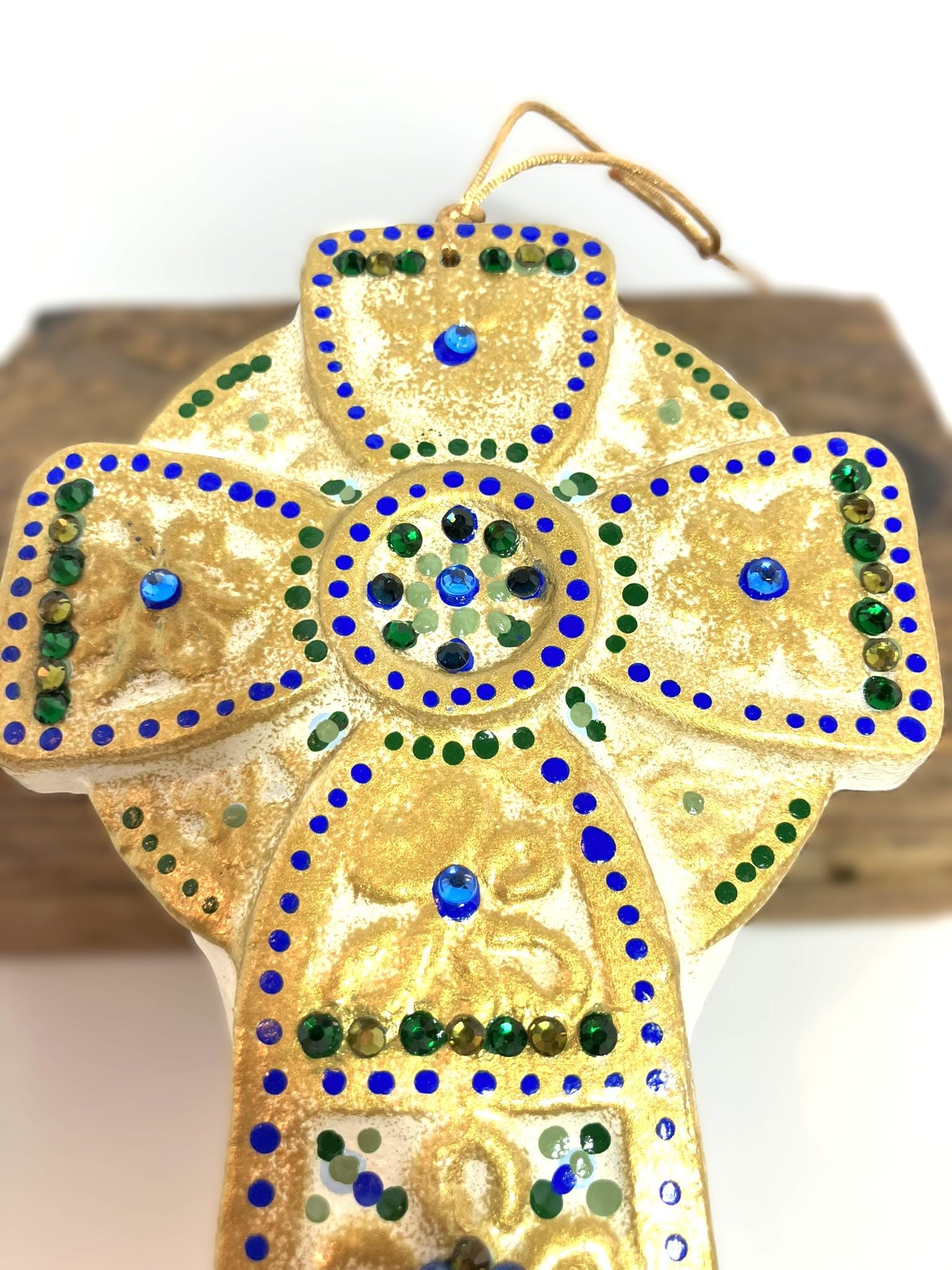 Handmade hanging Celtic cross. Made from plaster of paris, hand painted, and sealed. Adorned with lots of glass rhinestones. Gold with blues and greens. Dimensions: 4-1/2" w x 6-1/2" t x 1/2" th. Elegant.