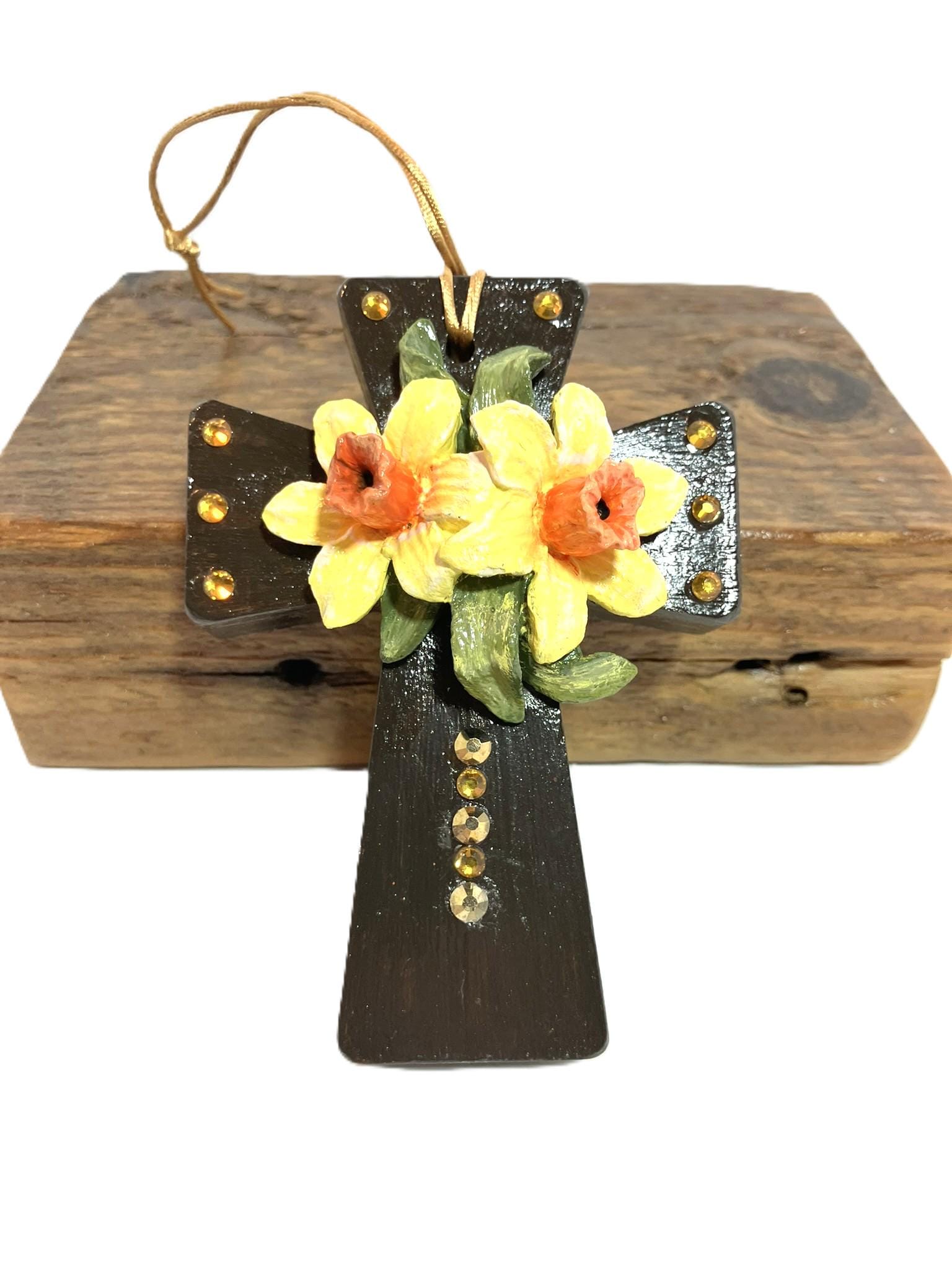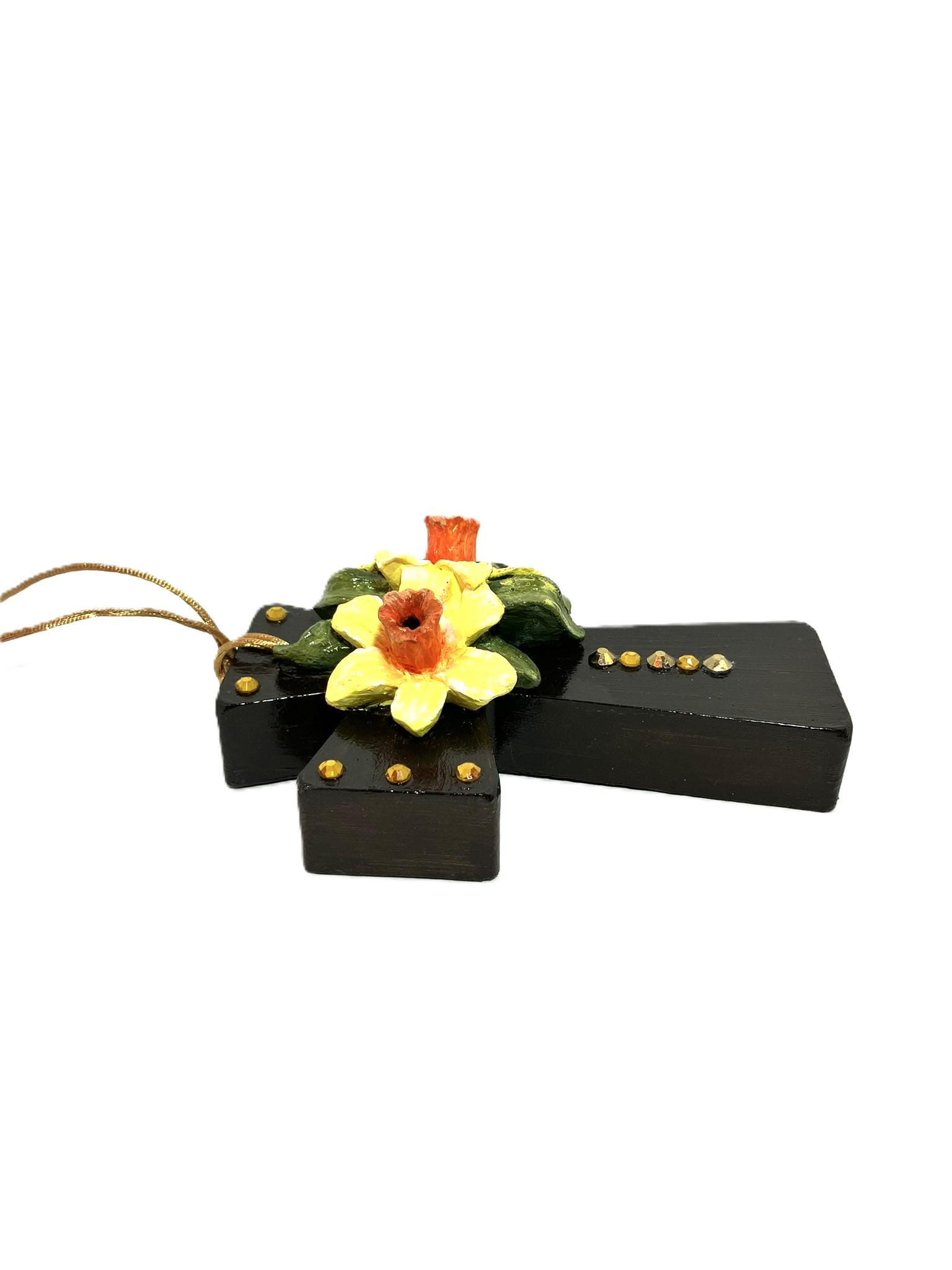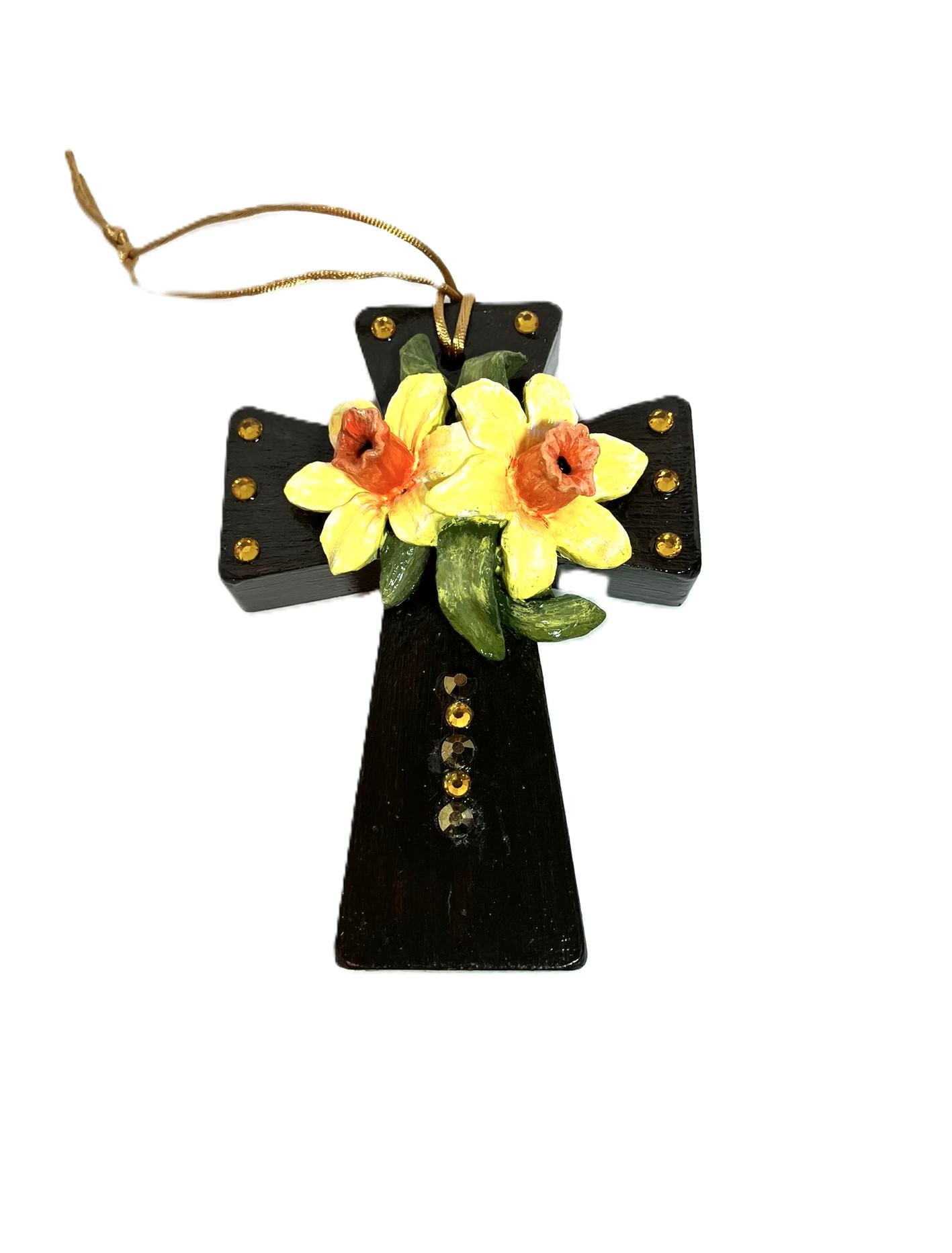 Handmade hanging daffodil cross. Made from plaster of Paris, hand painted, and sealed. Separately made daffodils applied to cross. Dark brown cross. Dimensions: 3" w x 4" t x 1-1/2" th.