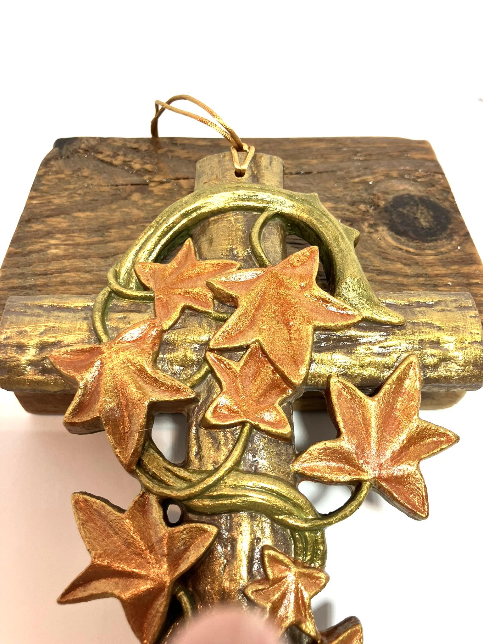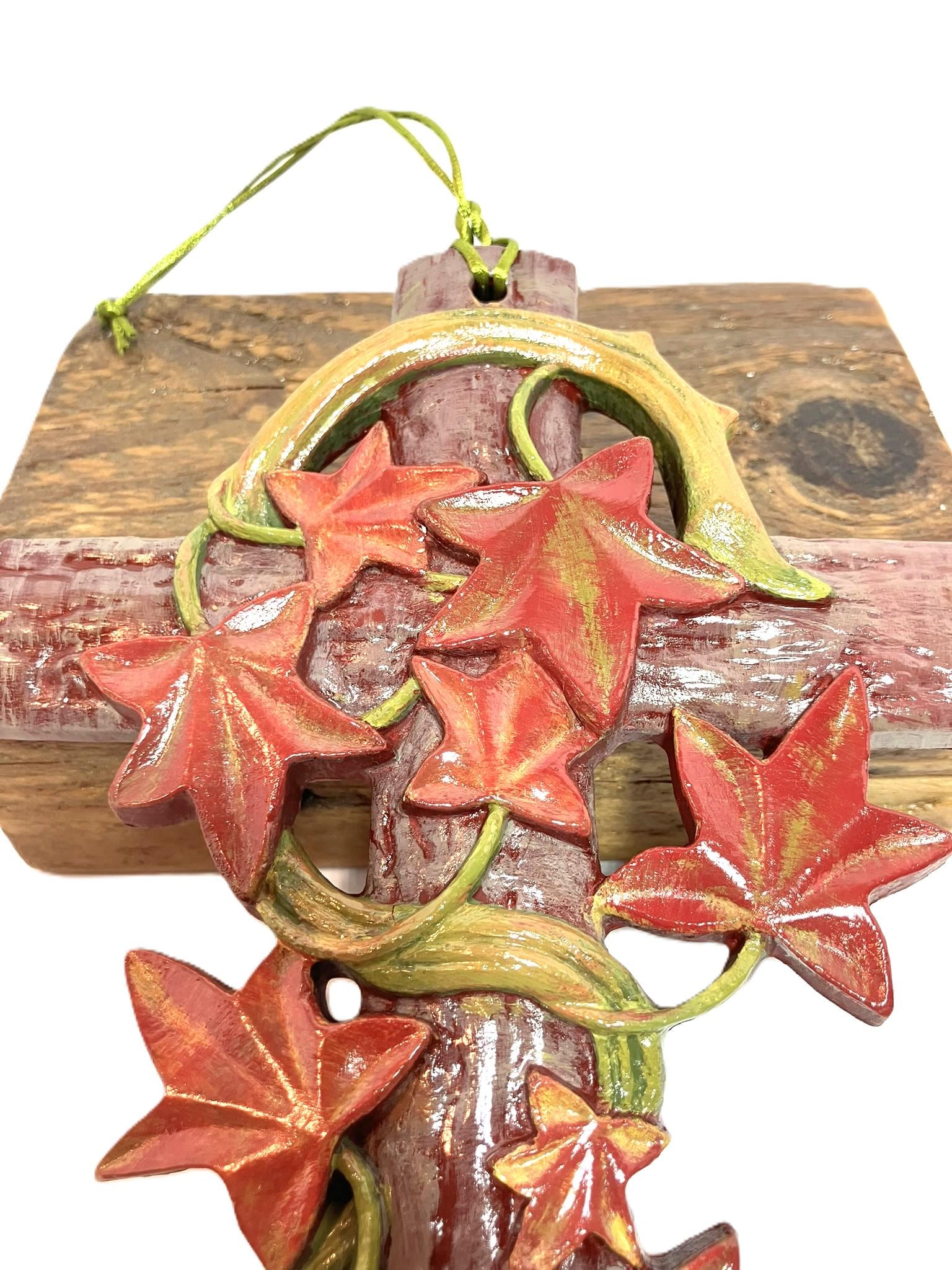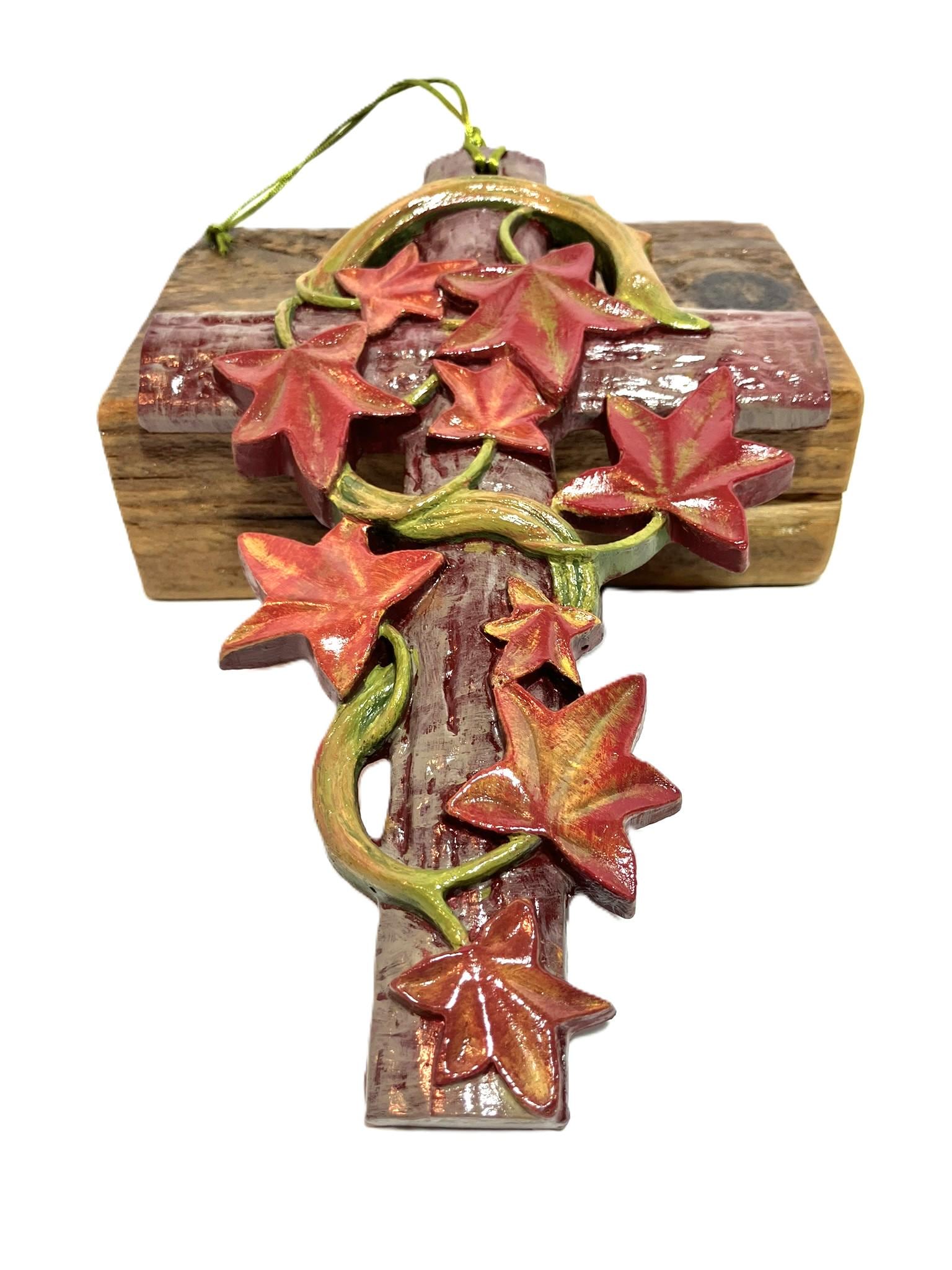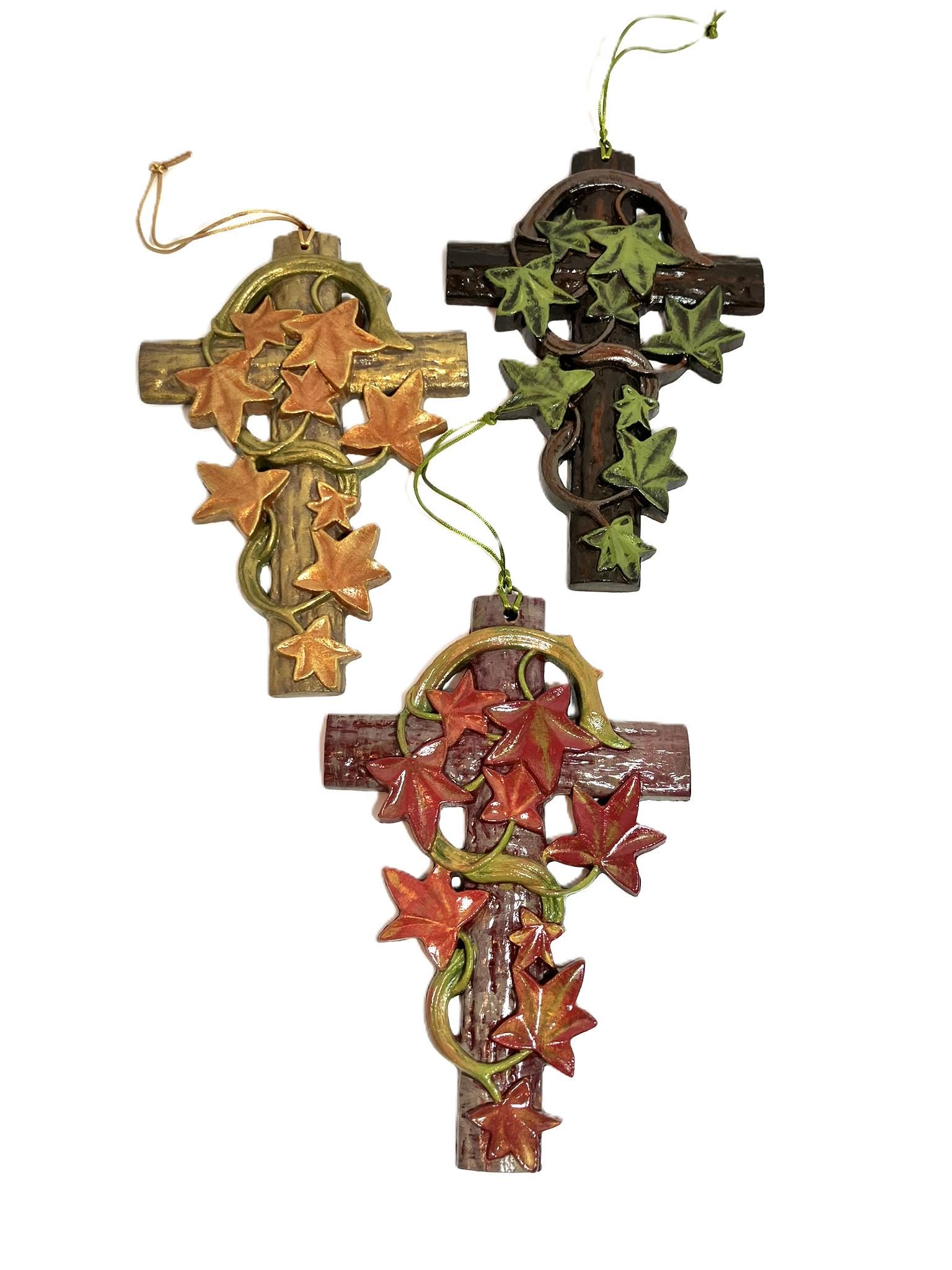 Handmade hanging ivy cross. Made from plaster of paris, hand painted, and sealed. Dimensions: 5" w x 7-3/4" t x 1/2" th. Please select the one that you desire! These are so very pretty!