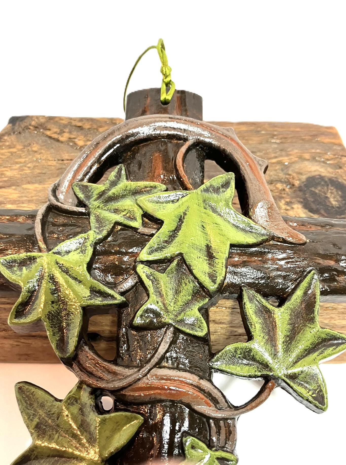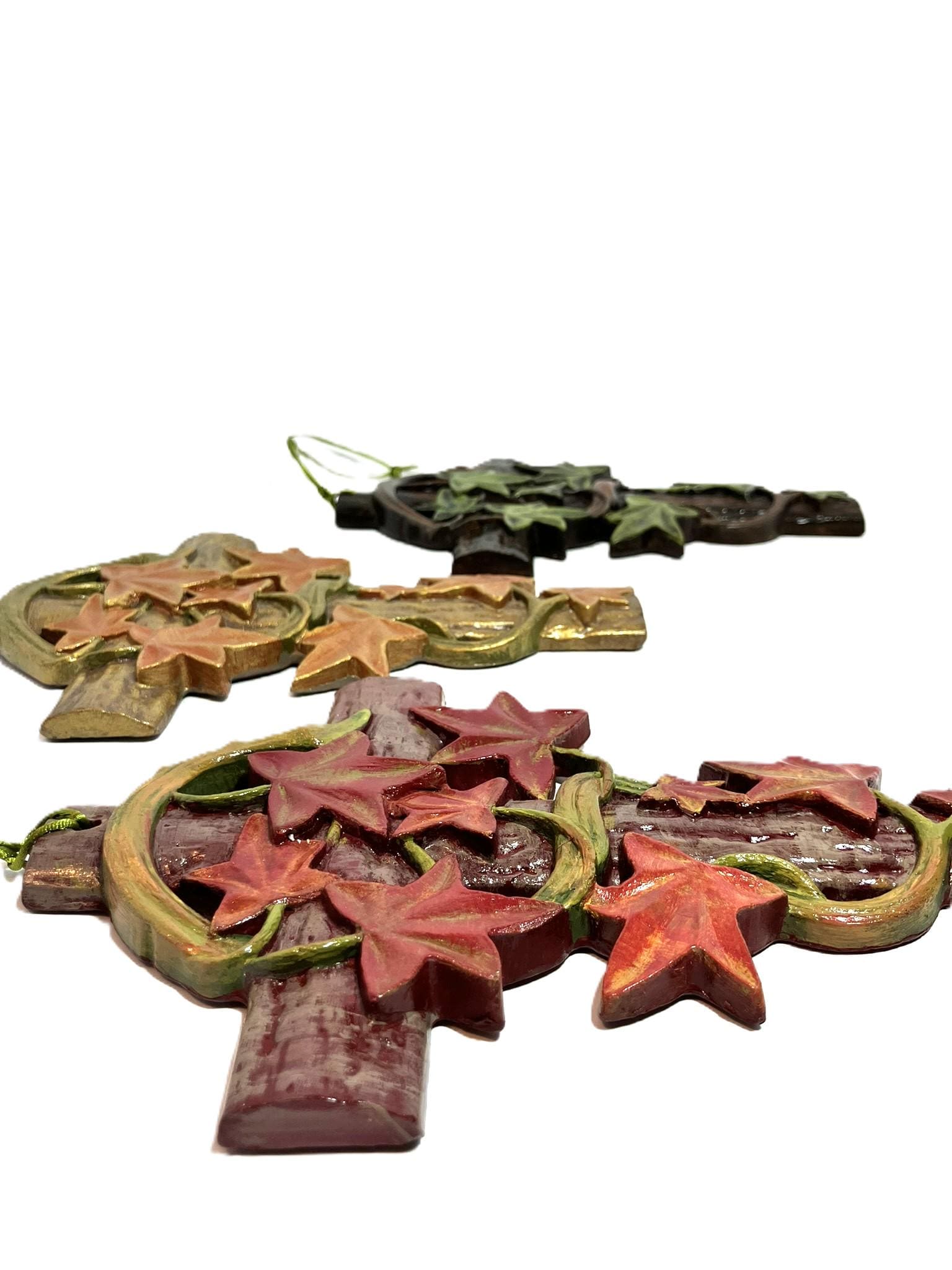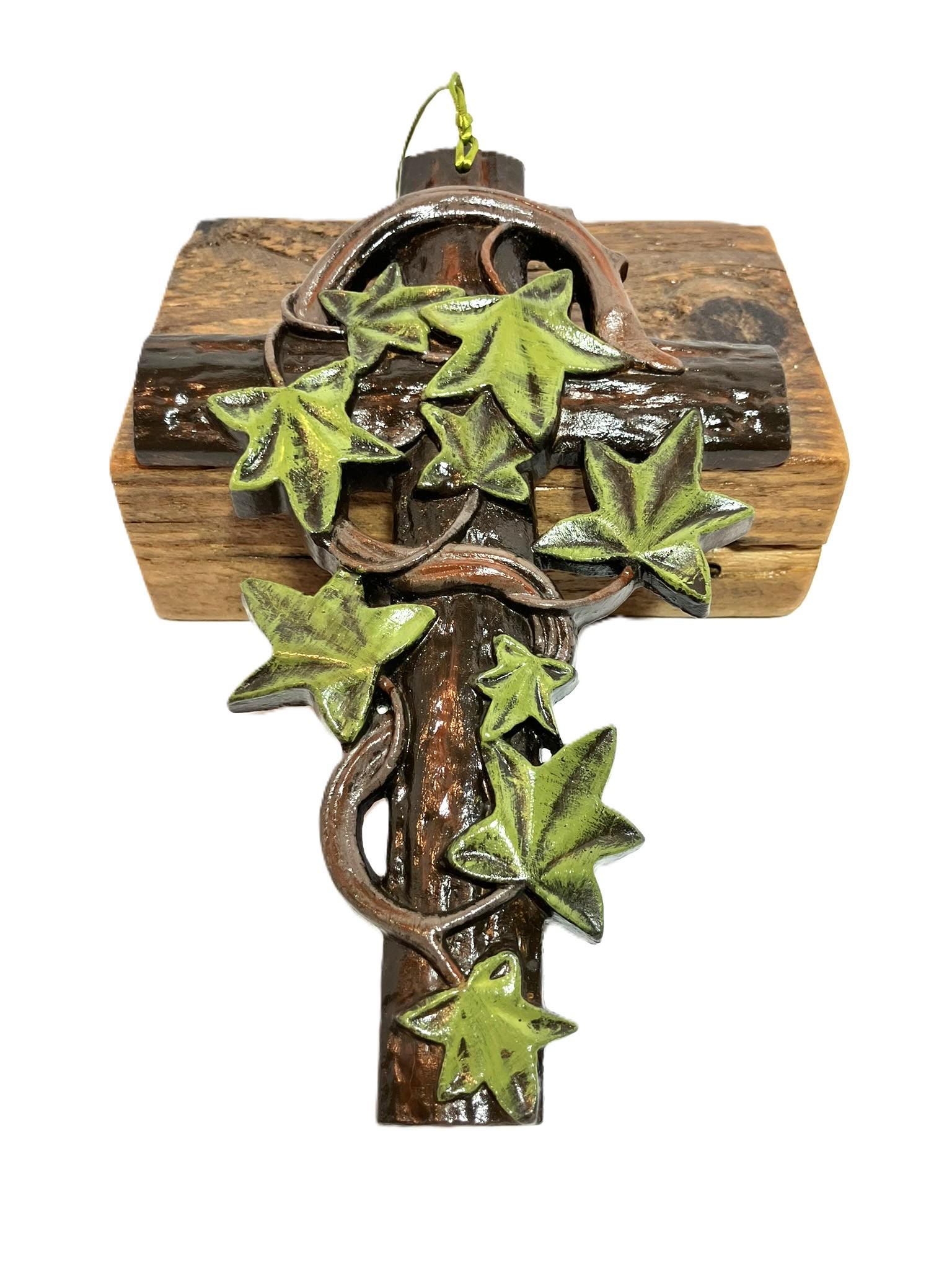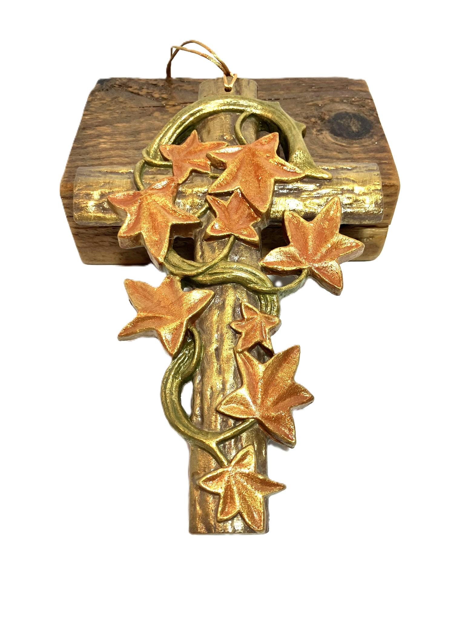 Handmade hanging ivy cross. Made from plaster of paris, hand painted, and sealed. Dimensions: 5" w x 7-3/4" t x 1/2" th. Please select the one that you desire! These are so very pretty!