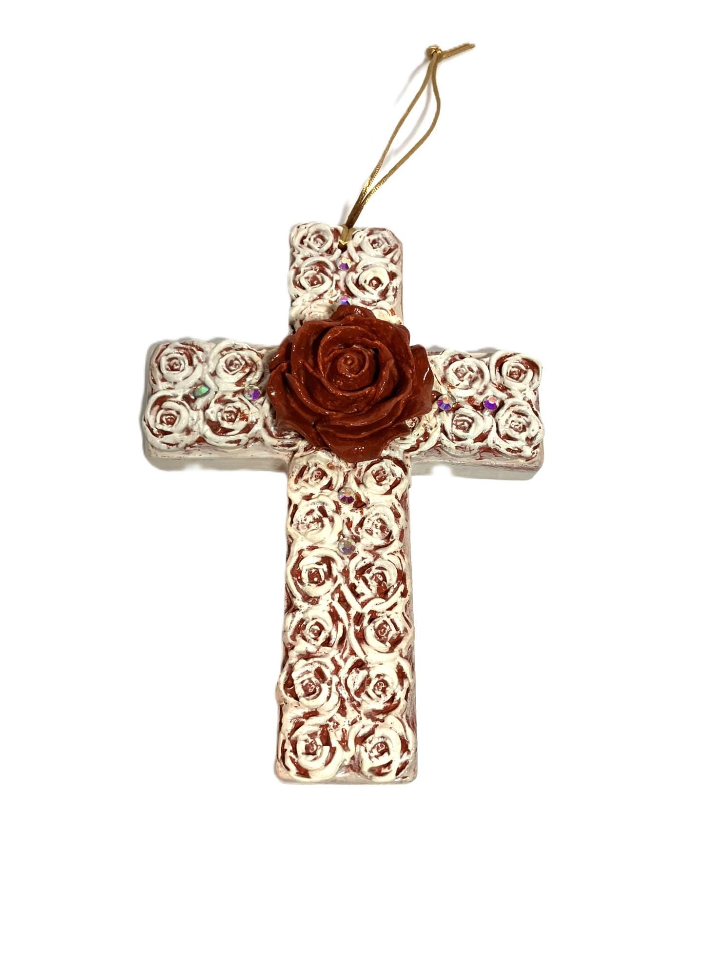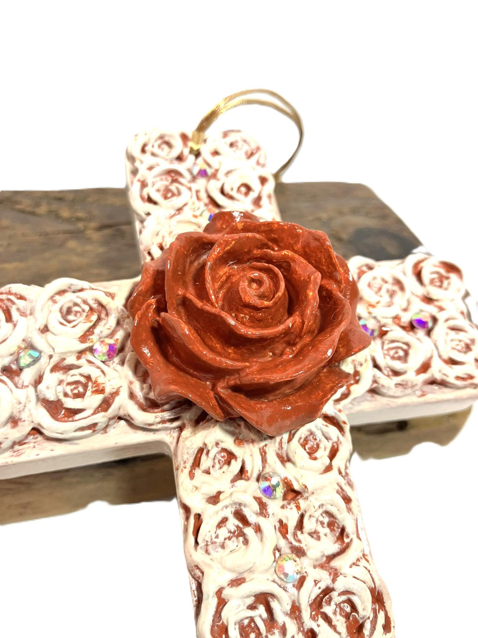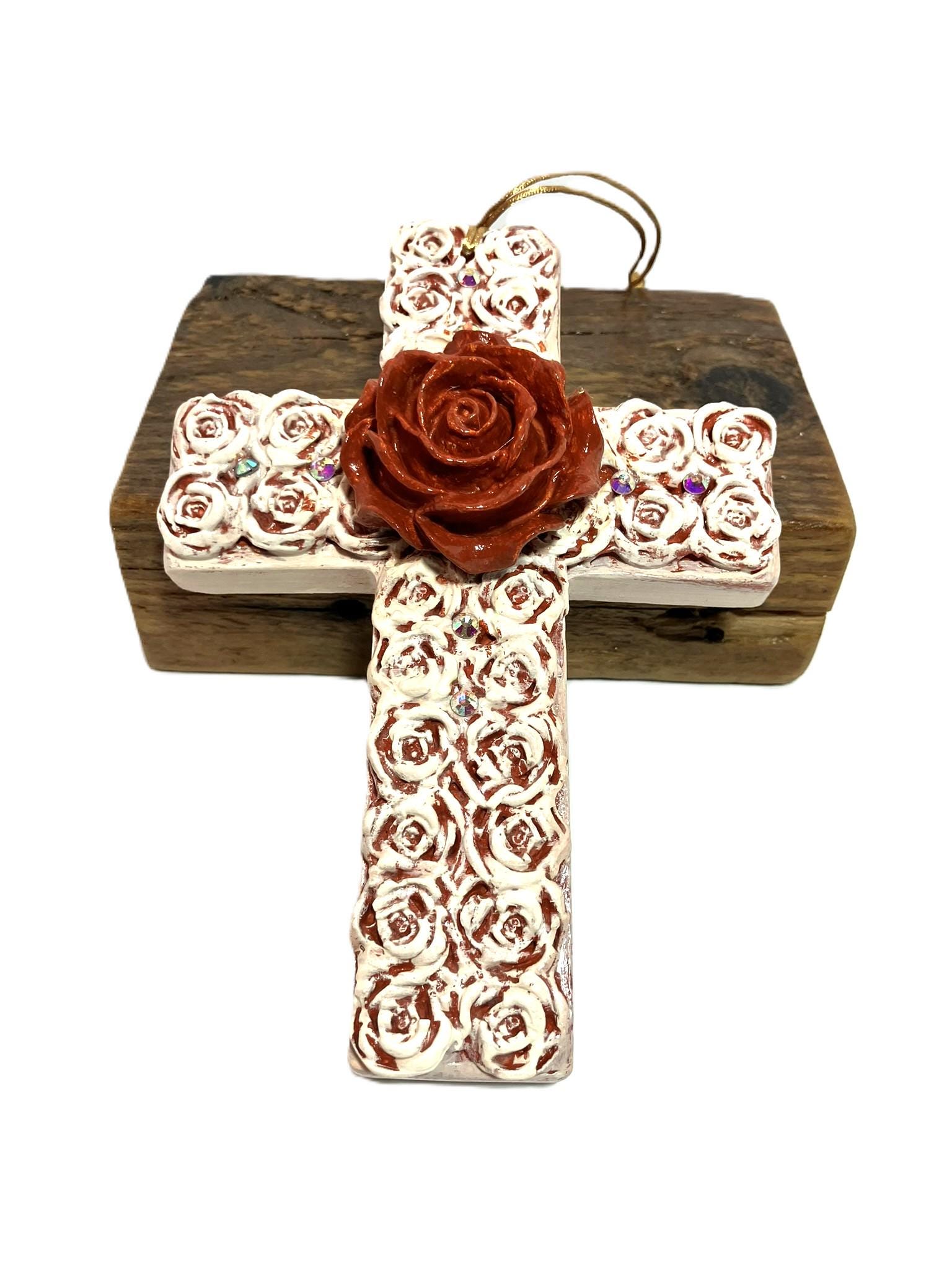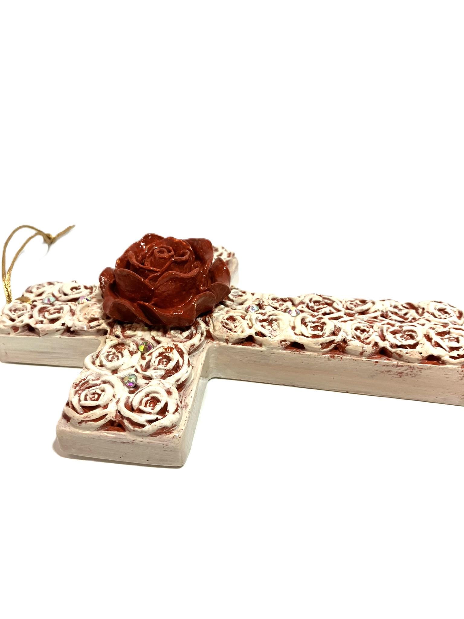 Handmade hanging rose cross. Made from plaster of paris, hand painted, and sealed. Separately made rose applied to cross atop. Adorned with glass rhinestones. Cream with reddish center rose. Dimensions: 4-1/2" w x 6-1/2" t x 1-1/2" th. Very pretty!