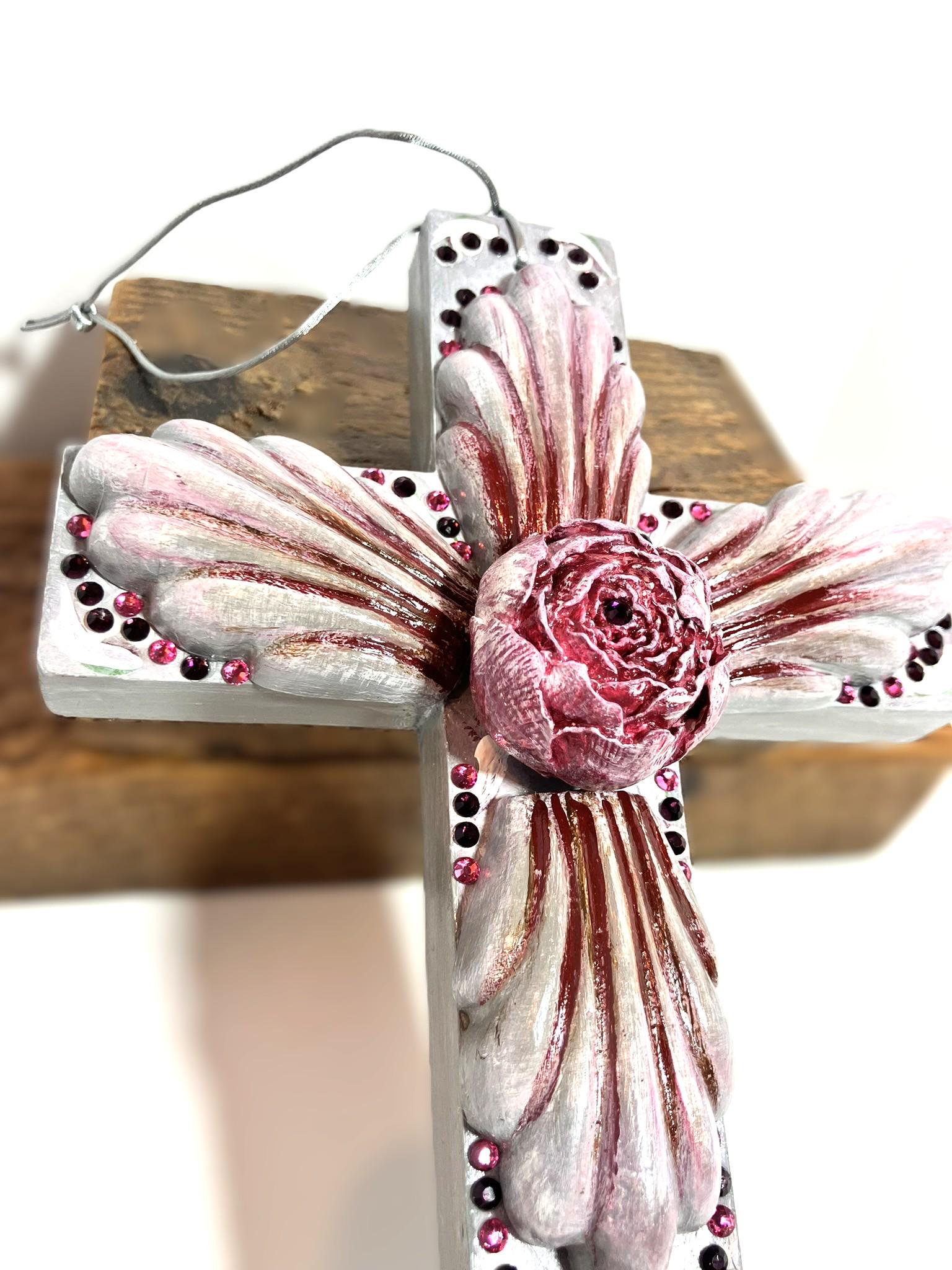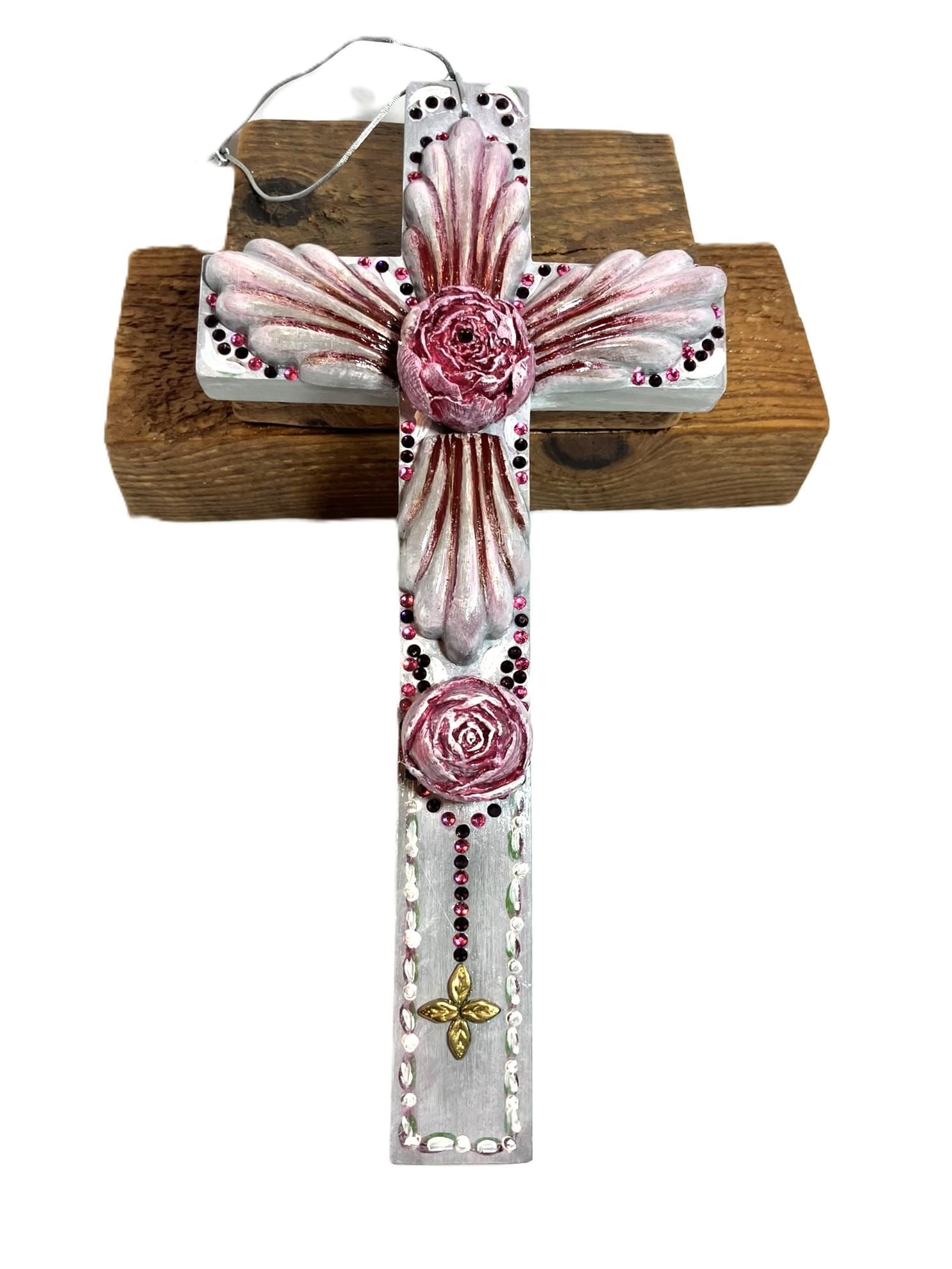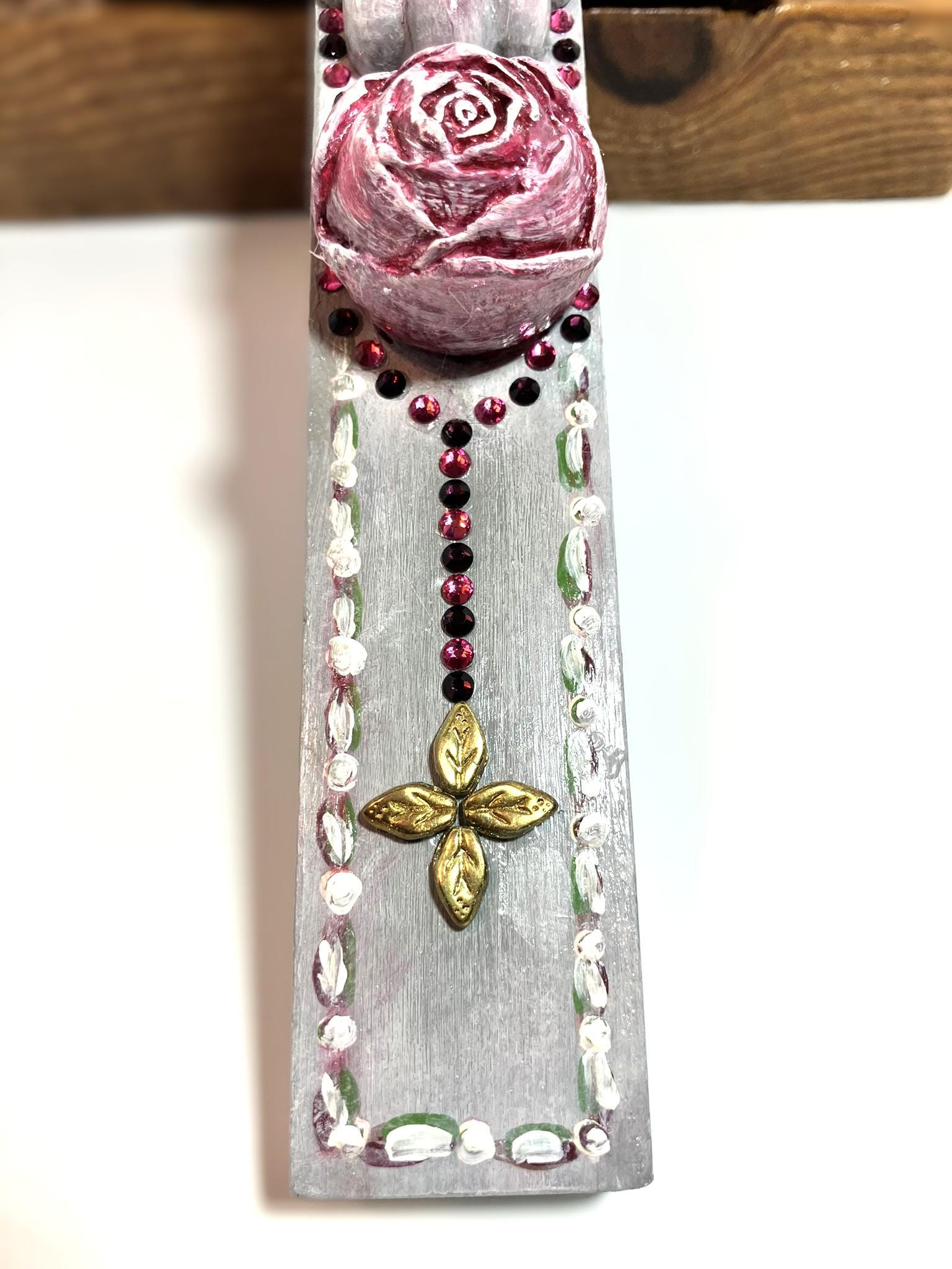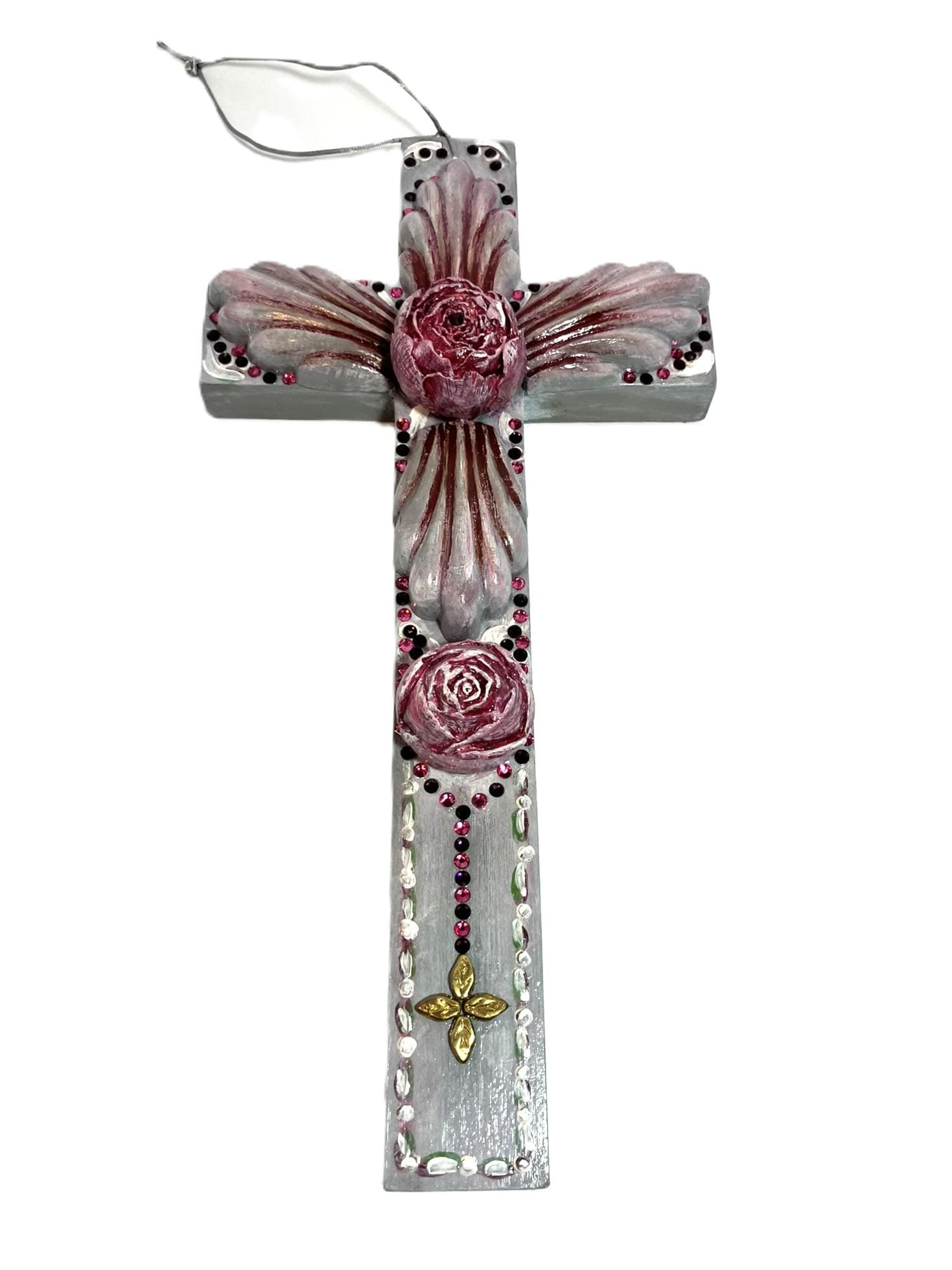 Handmade hanging cross. Made from plaster of paris, hand painted, and sealed. Separately made pieces applied atop. Adorned with lots of glass rhinestones, made to mimic a rosary. Dimensions: 6" w x 12" t x 2" th. Bluish gray.