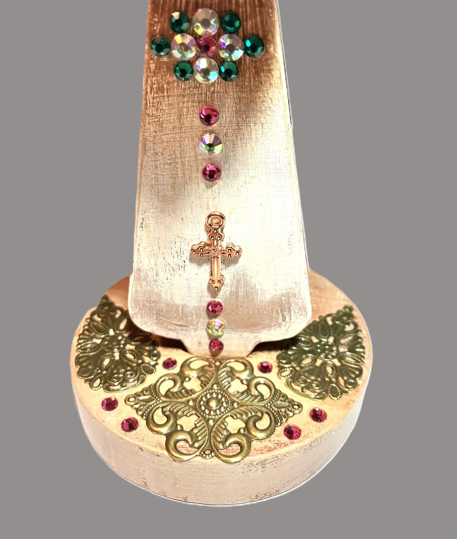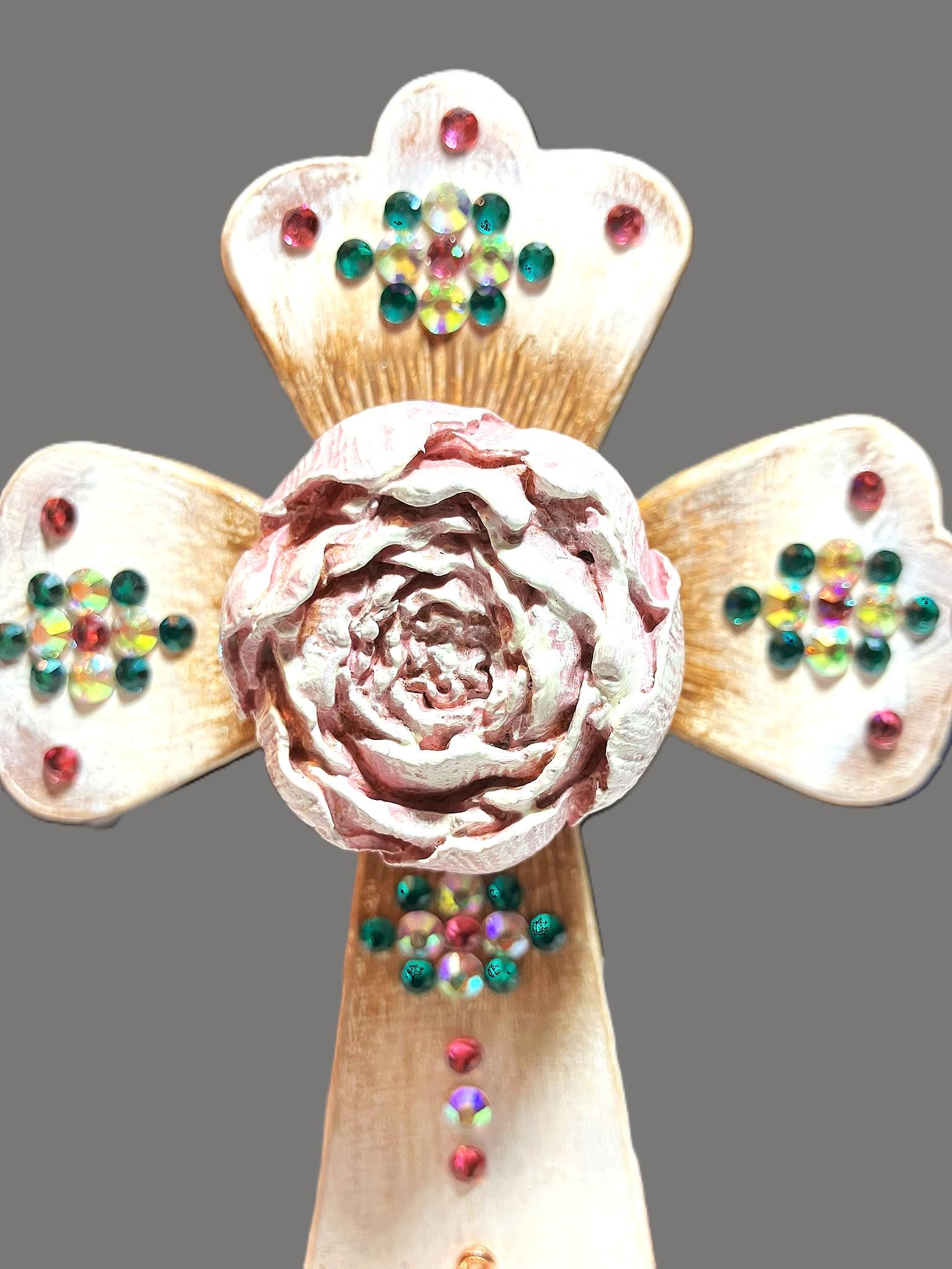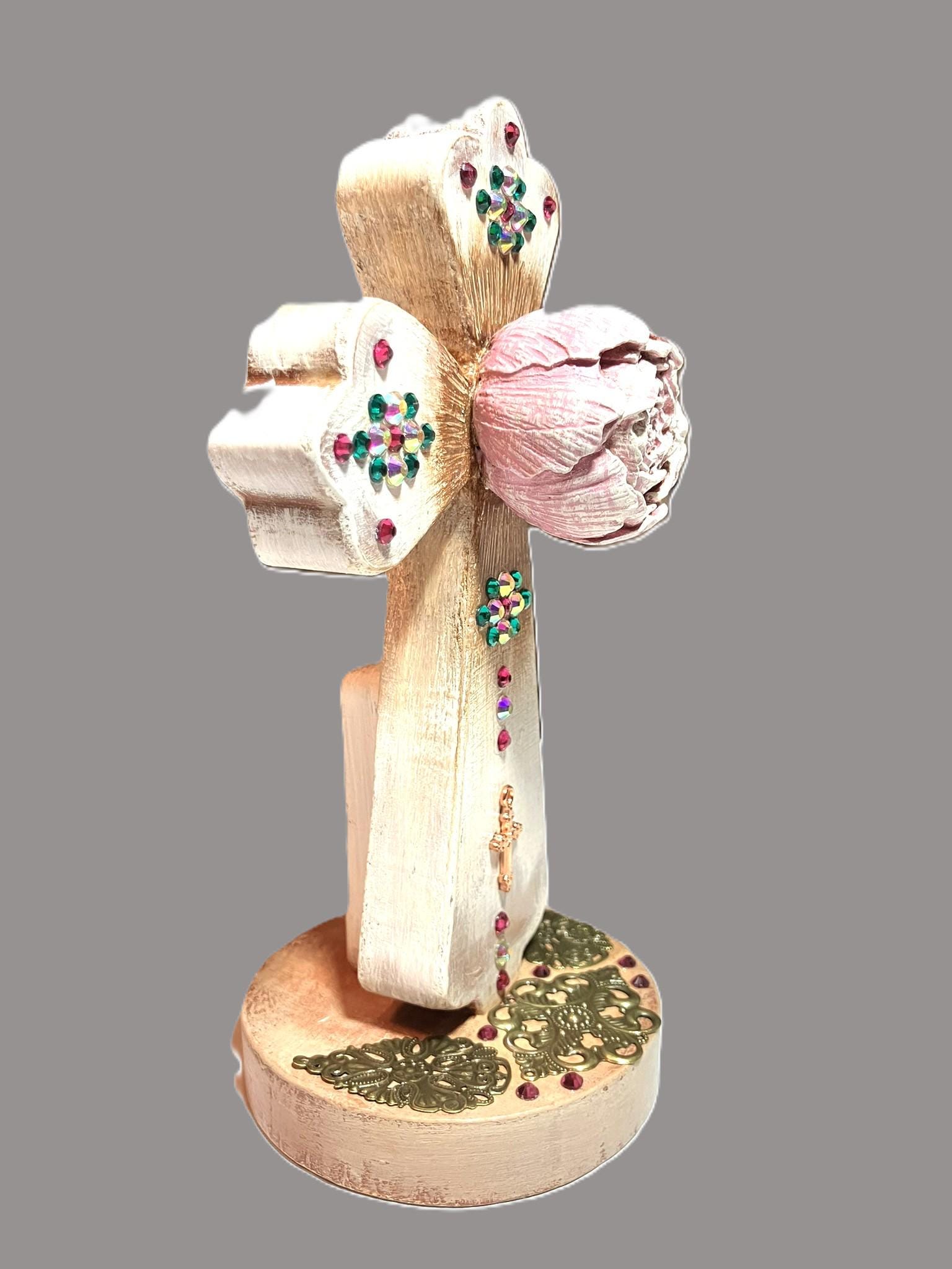 Handmade cross mounted on stand. Made from plaster of paris, hand painted, and sealed. Design made separately and applied. Adorned with glass rhinestones. Dimensions: 3" w x 3" dp x 7-1/4" t.